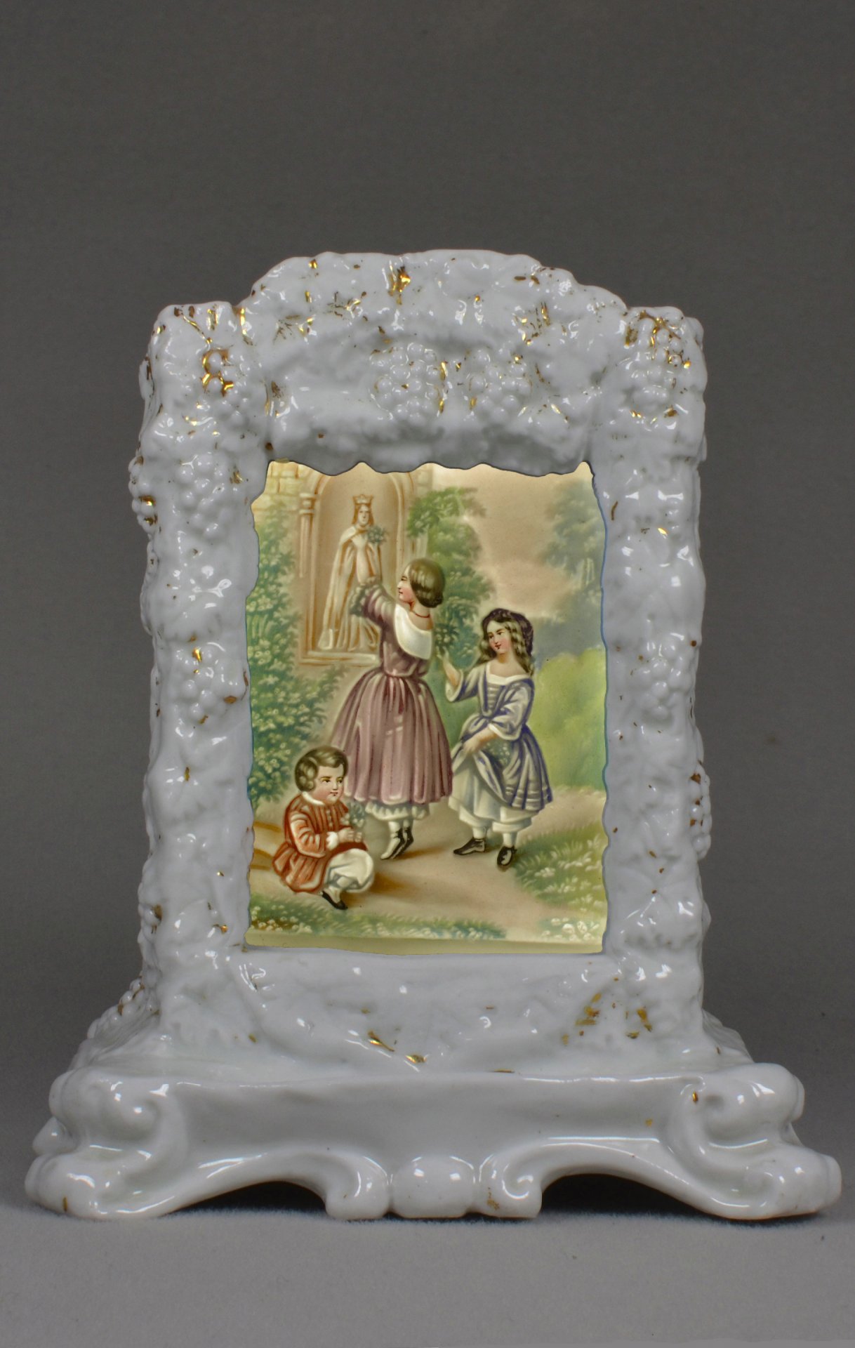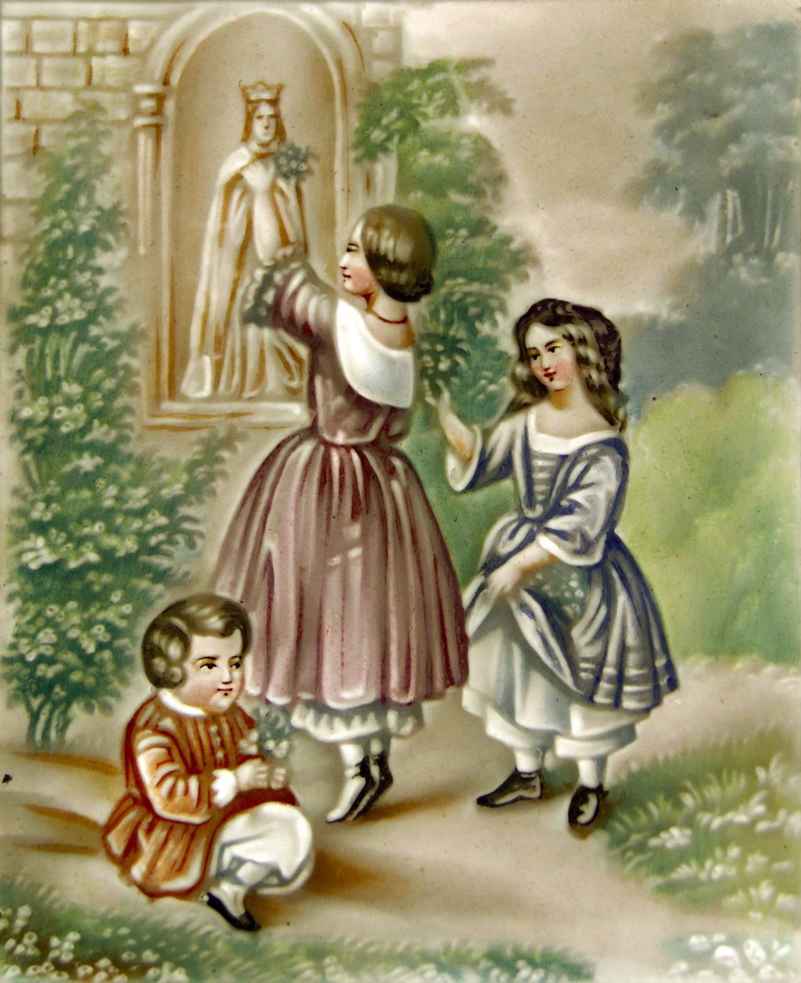 Lithophanie, 1850-1853, koloriertes Modell BPM 530, Mutter und zwei Kinder vor einer Madonnen-Statue, 8,8 x 7,3 cm