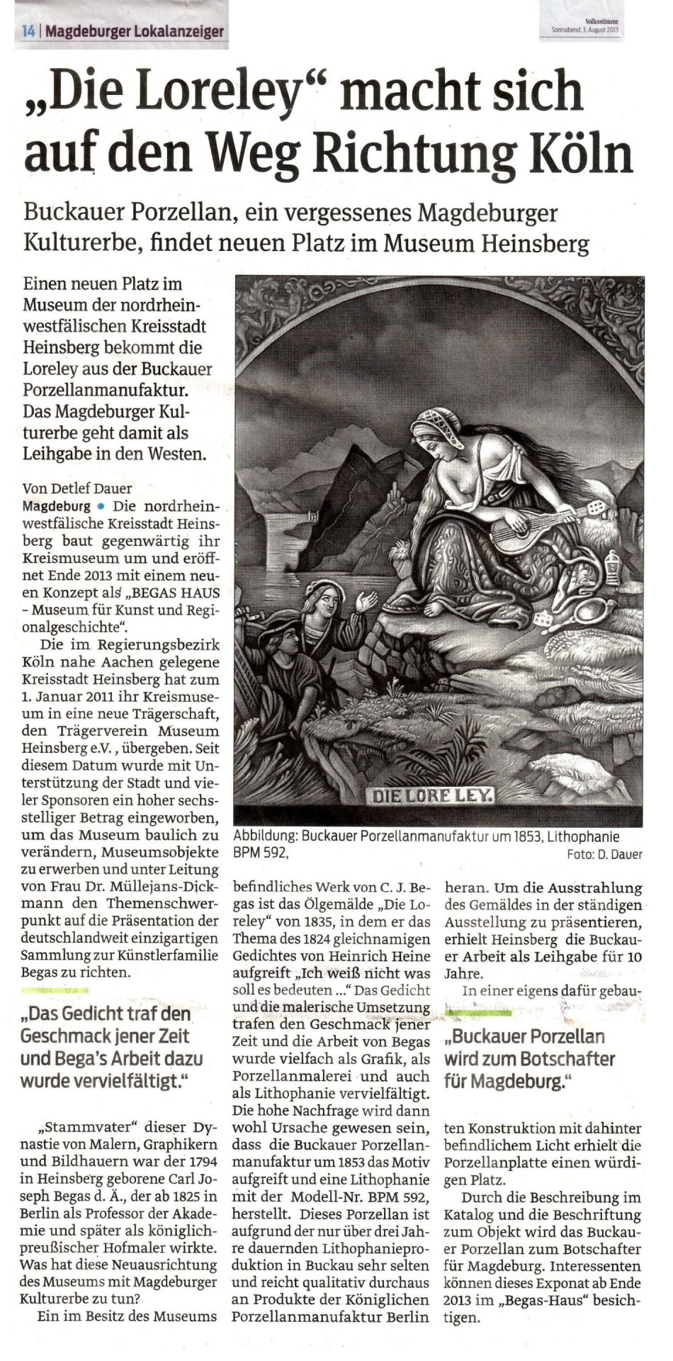 2013, August – Detlef Dauer, Die Loreley macht sich auf den Weg Richtung Köln - Buckauer Porzellan, ein vergessenes Magdeburger Kulturerbe, findet neuen Platz im Museum Heinsberg, Volksstimme, Magdeburger Lokalanzeiger 03.08.2013