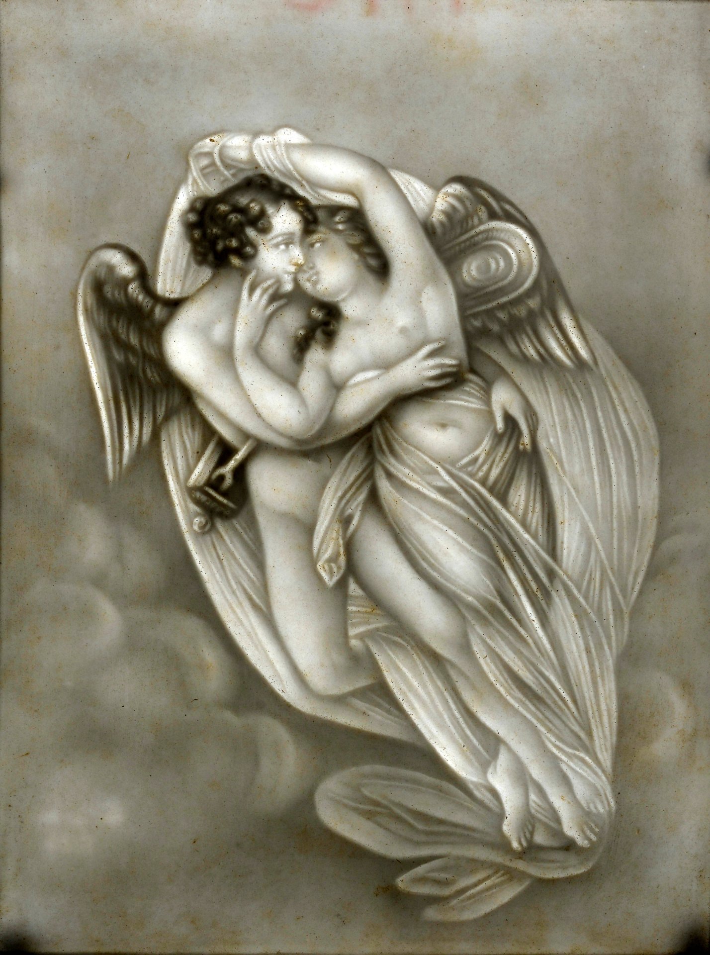 Lithophanie 1850-1853, Modell BPM 505 (bourg.)– Entführung der Psyche (durch Amor) nach Johann Nepomuk Ender (1793-1854) , Preßmarke Bourgois, 12,7 x 9,8cm