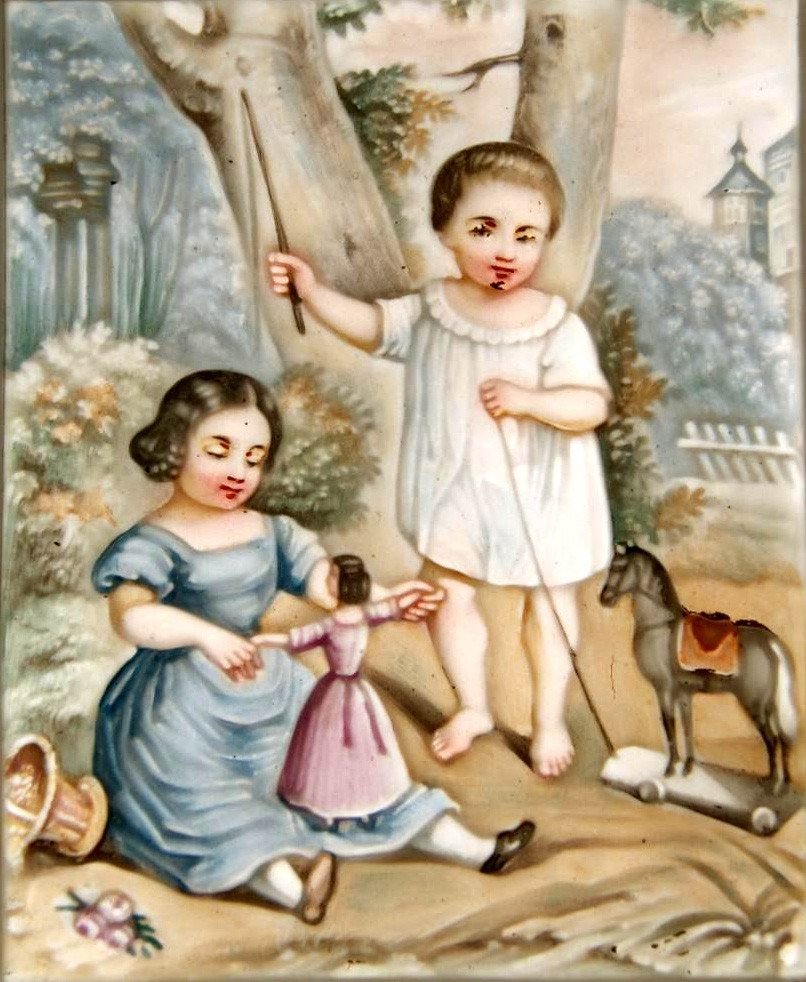 Kolorierte Lithophanie um 1850, Modell BPM 611 (lat. Großbuchstaben), zwei Kinder spielen mit Puppe und Pferdchen, 8,7 x 7,4cm