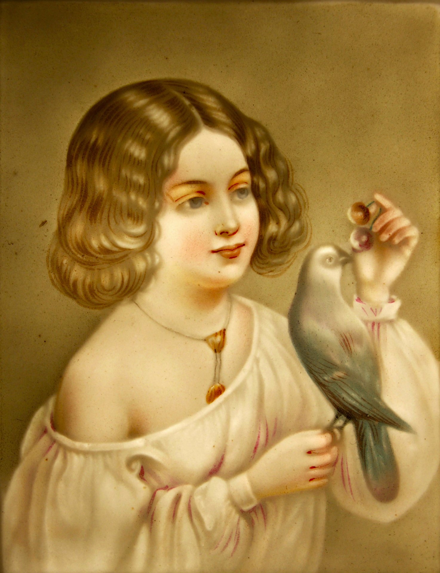 Lithophanie, 1850-1853, Modell koloriert BPM 531, Mädchen füttert Vogel mit Kirschen, 9,7 x 8,3cm