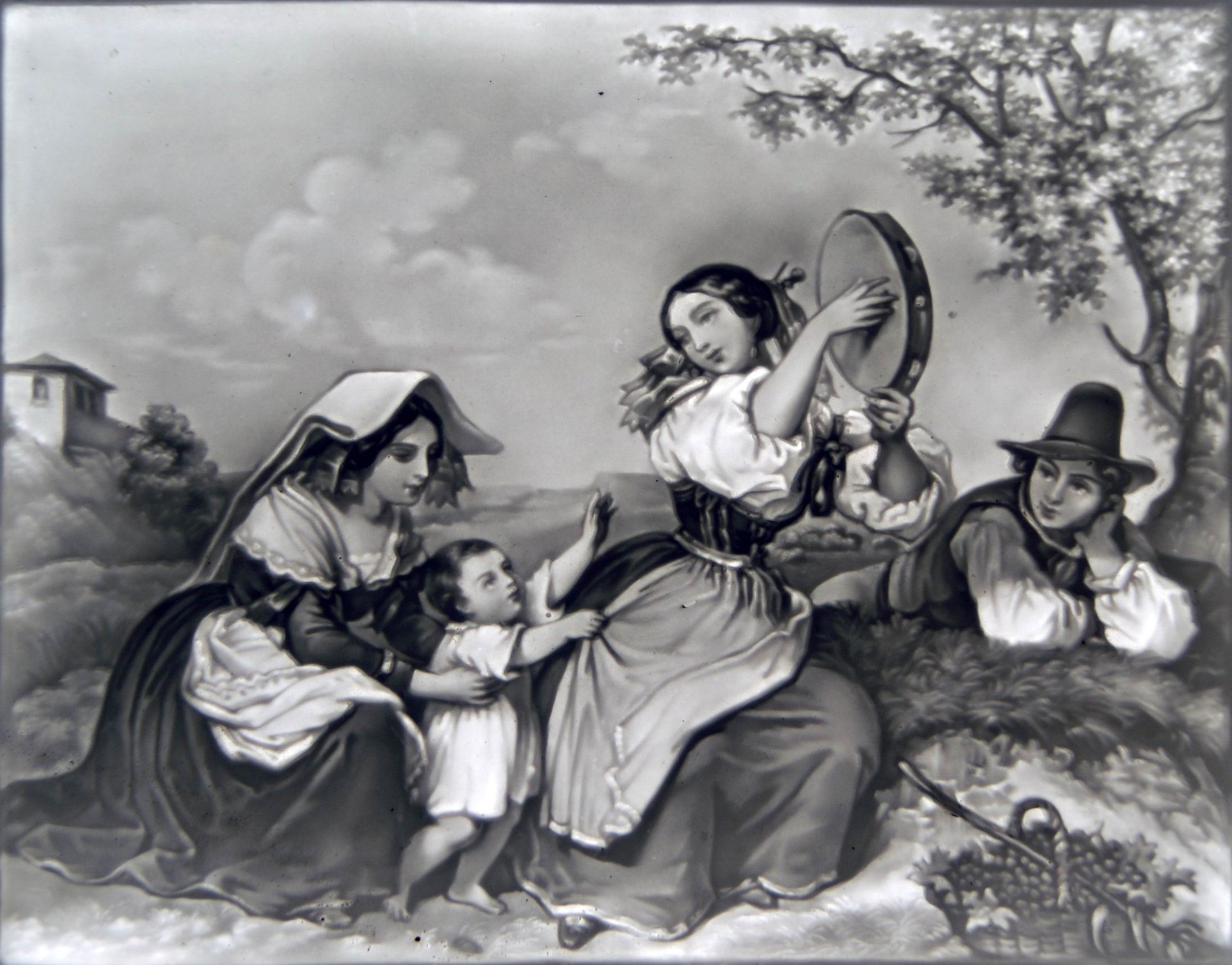 Lithophanie, 1850-1853, Modell BPM 567, Abbildung einer italienischen Hirtenlandschaft, angesiedelt wohl in den Albaner Bergen. Rast einer Familie mit Tamburinspielerin, 11,5 x 14 cm
