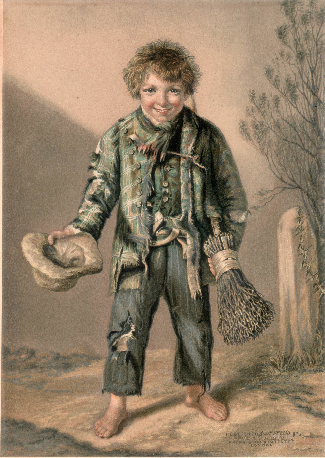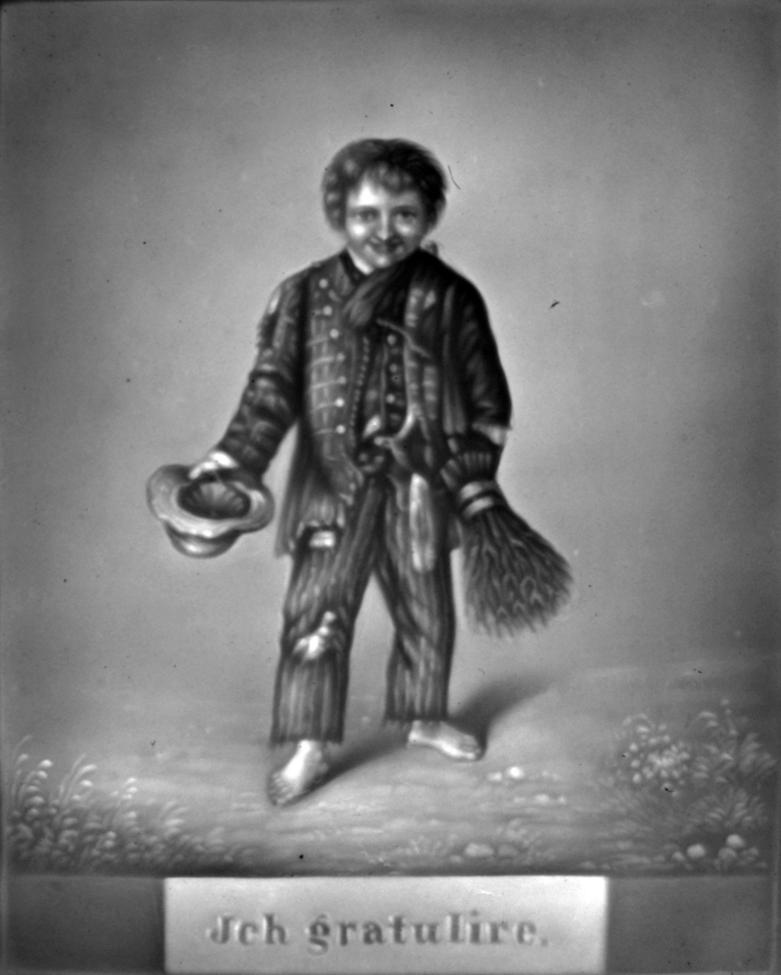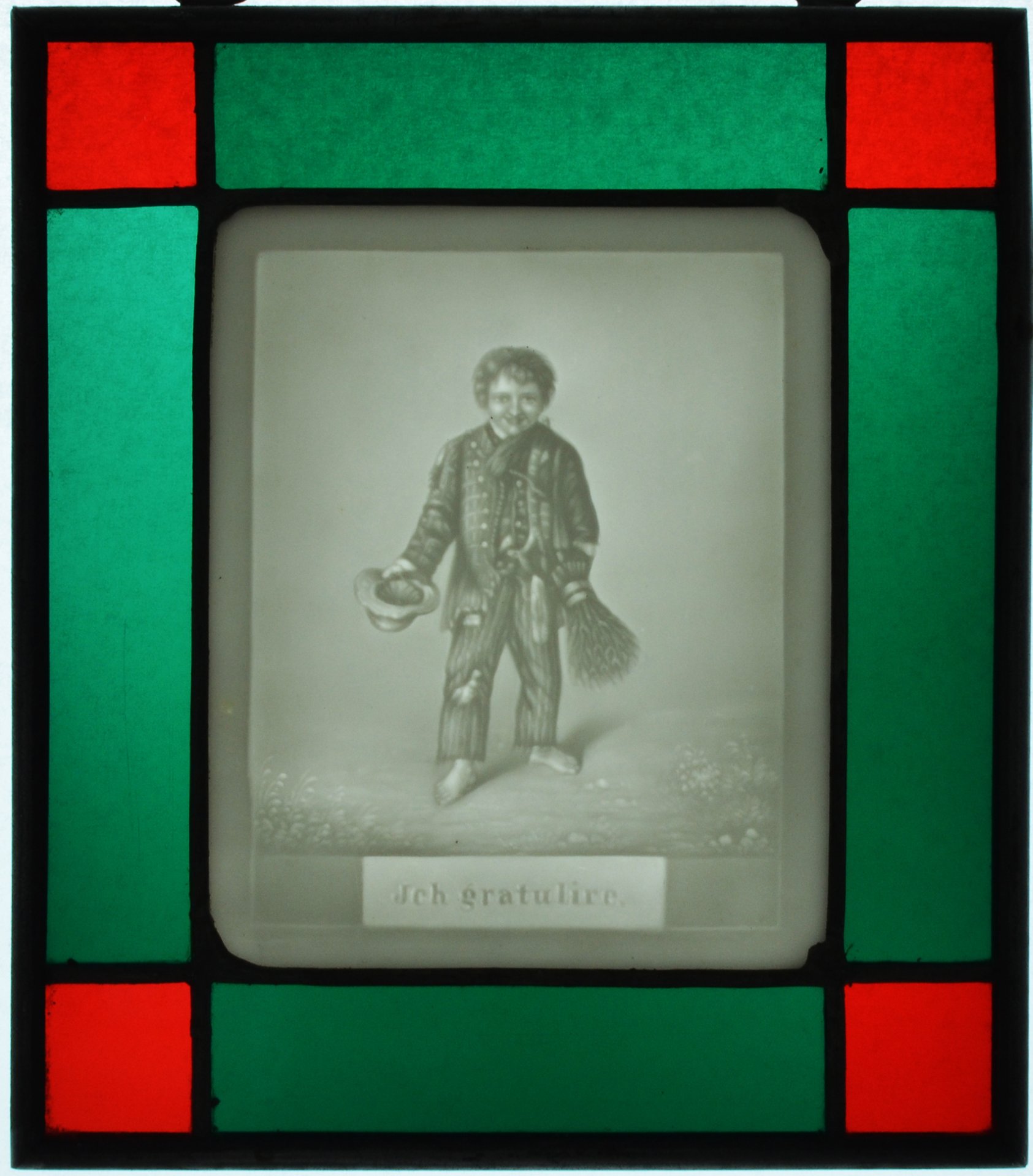 Lithophanie 1844-1850 als Fensterbild in Blechfassung, fröhlich strahlender kleiner, ärmlich und zerschlissen angezogener Junge mit seinem Hut in der rechten und einem Reisigbesen in der linken Hand nach Vorlage von George Baxter (1804-1867), in der Platte Titel „Ich gratulire“; Fensterbild: 14,3 x 12,7 cm,  Bildplatte: 9,5 x 8,0 cm