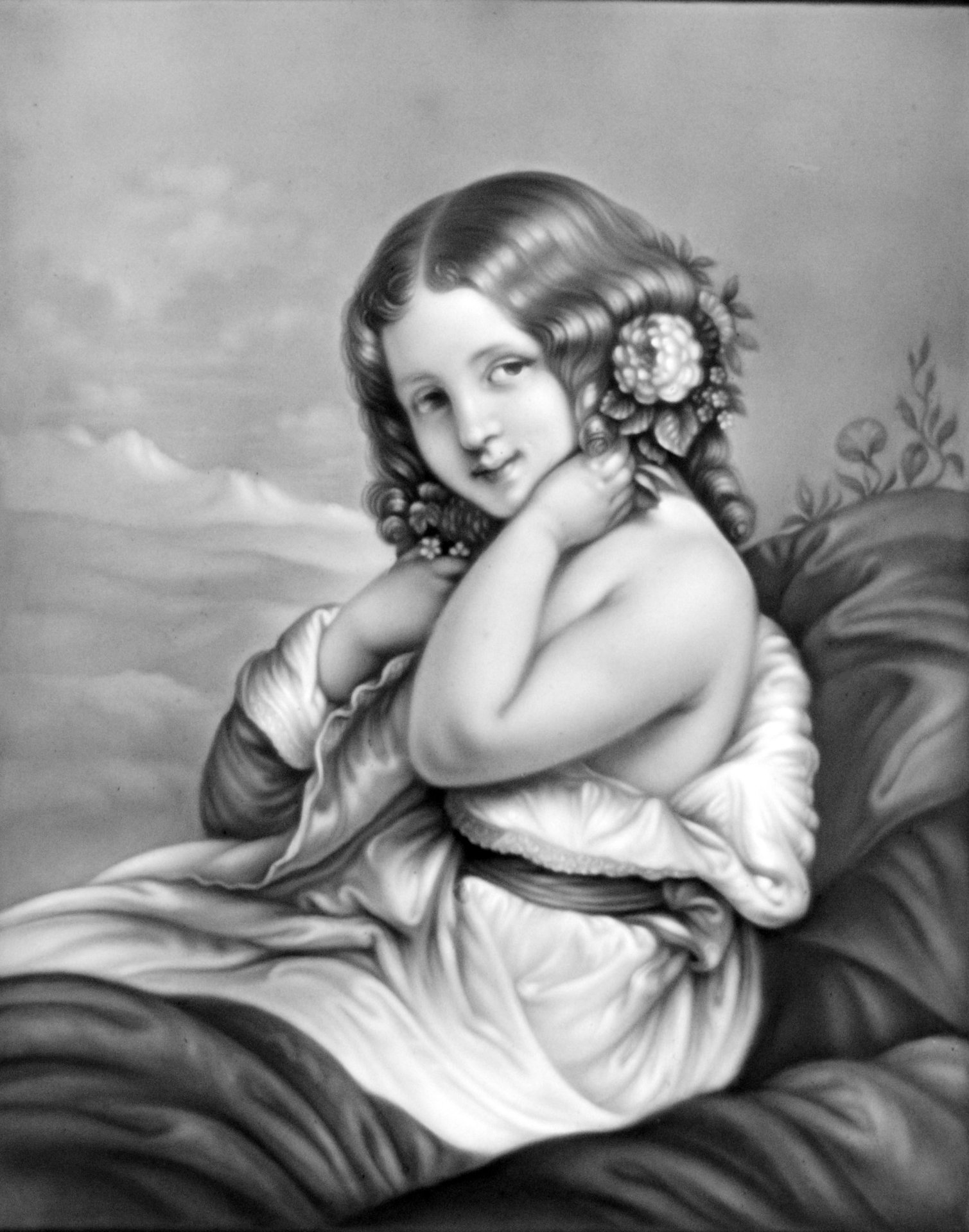 Lithophanie 1844-1850, Modell HPM 113, auf einem Kissen sitzendes Kind mit einer Rose im Haar, die Hände an den Hals haltend und den Betrachter erwartungsvoll anschauend. 18,0 x 14,7cm,