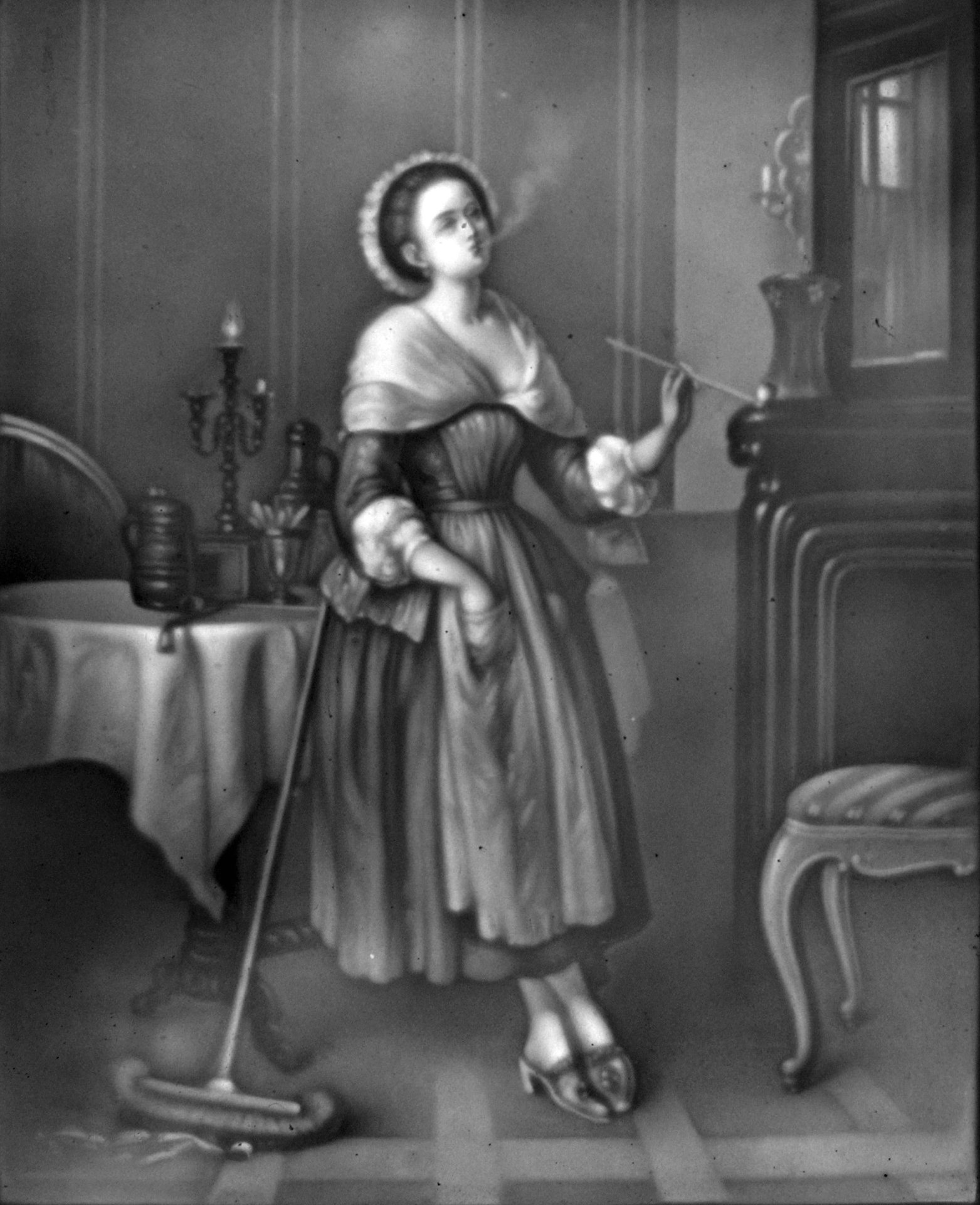 Lithophanie (1844-1850),Modell 412 X, Ein rauchendes Stubenmädchen, nach dem Gemälde von August Wilhelm Lebrecht Amberg (1822-1899), bezeichnet: „Aller Anfang ist schwer“,  13,1 x 11,2 cm