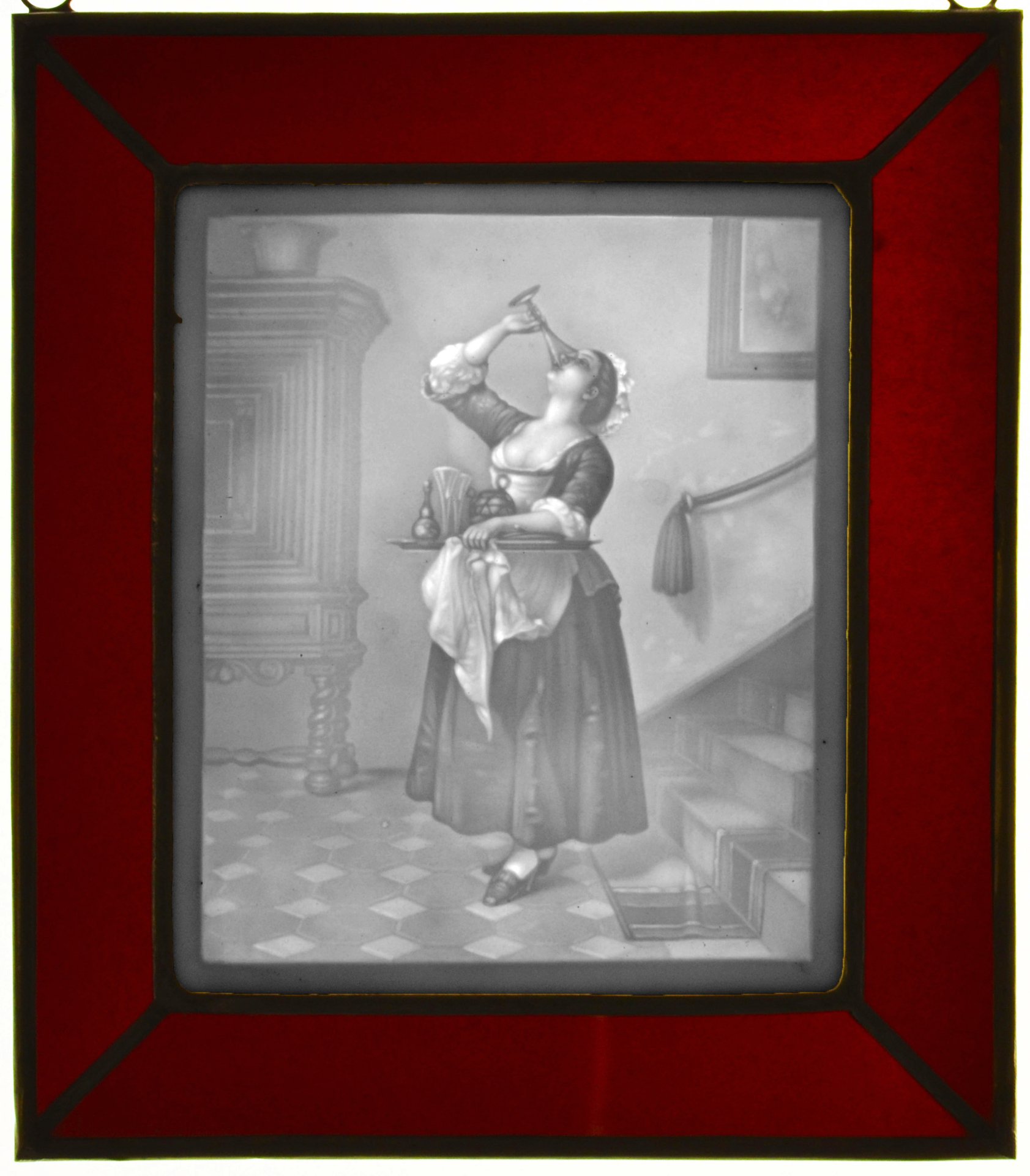 Lithophanie, 1844-1850, Modell HPM 413 - Das trinkende Hausmädchen, nach dem Gemälde von August Wilhelm Lebrecht Amberg (1822-1899), bezeichnet: „Naschkätzchen“ in Bleiverglasung, Fensterbild: 18,9 x 16,4 cm, Bildplatte: 13,5 x 11,3 cm