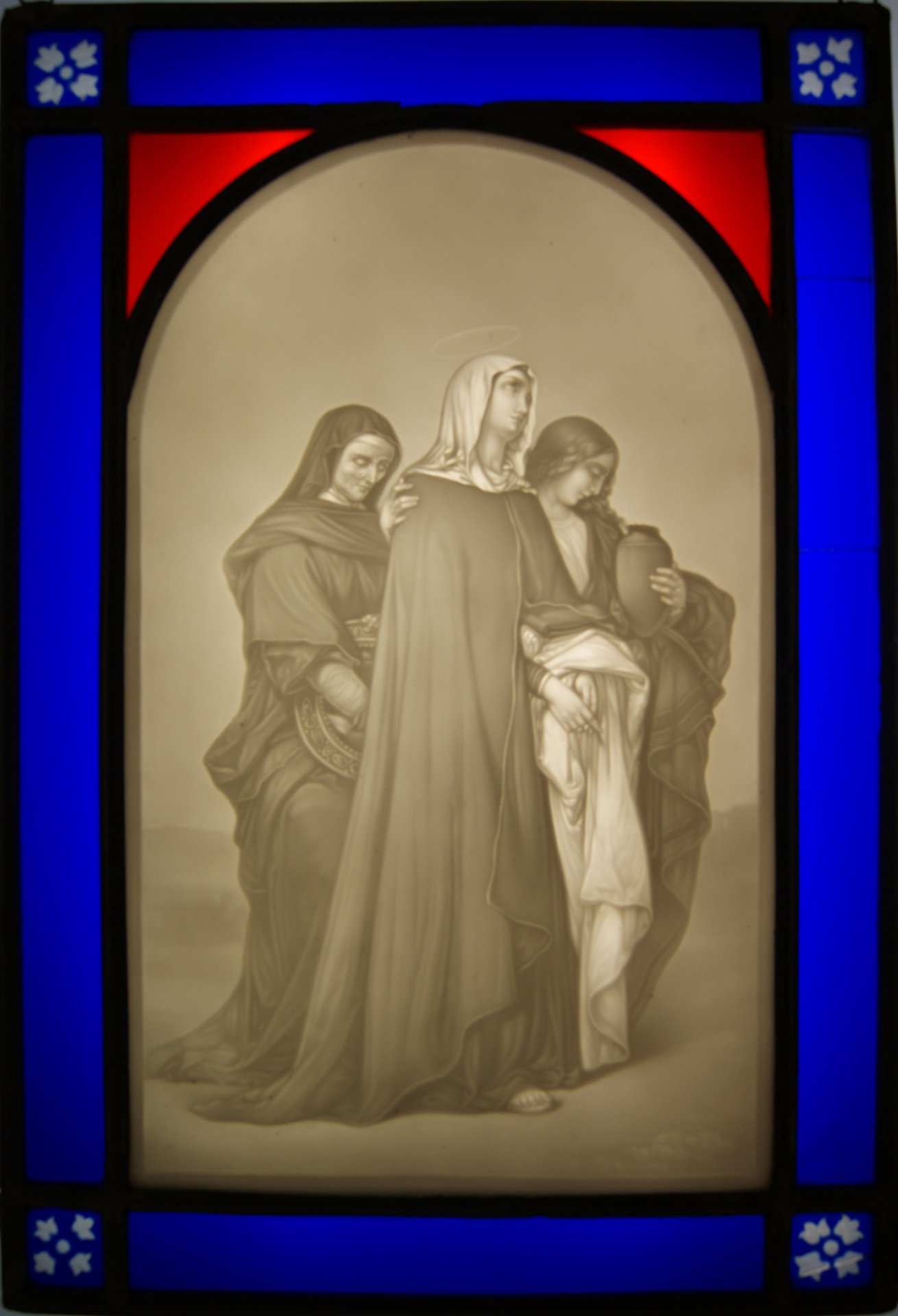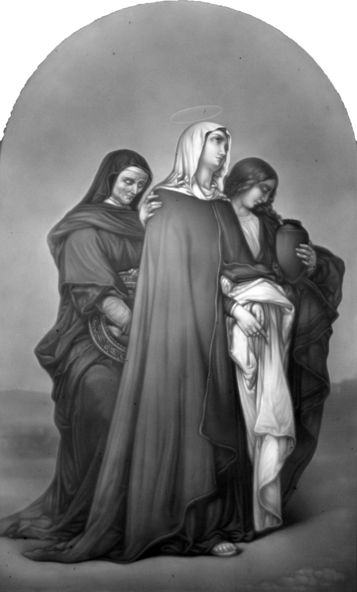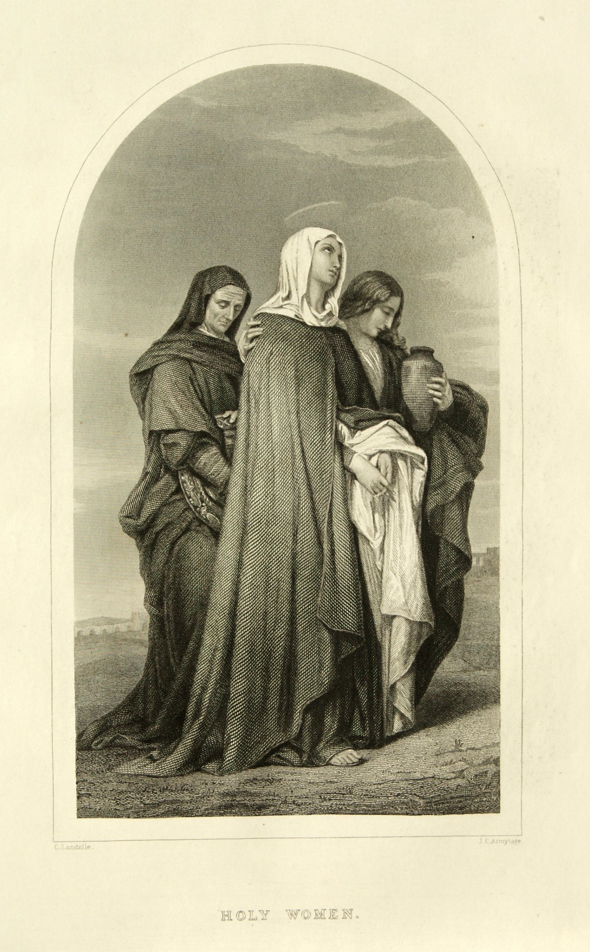 Porzellanfabrik Carl Heyroth & Co, Magdeburg-Sudenburg; Lithophanie, Rechteck mit oberen Rundbogen, Hochformat, Marke mit latteinischen Buchstaben, gemalt von Charles Zacharie Landelle (1812-1908), Stahlstich von James Armytage (1802 od. 1820 – 1897), bezeichnet: „Holy Women“,