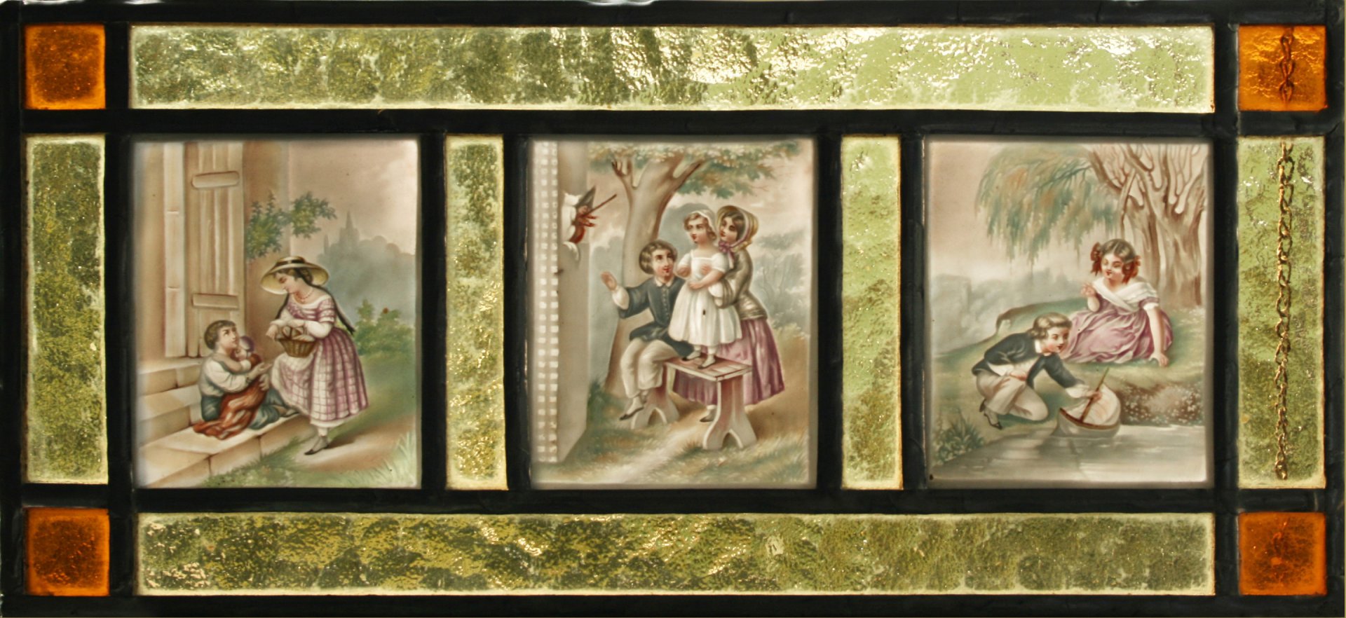Fensterbild in Bleiverglasung mit drei kolorierten Lithophanien, (Kalender-Fensterbild) mit den Modell-Nummern in bourgoiser Schrift BPM 528, BPM 527 und BPM 529, H.: 15 cm; B.: 32,5 cm