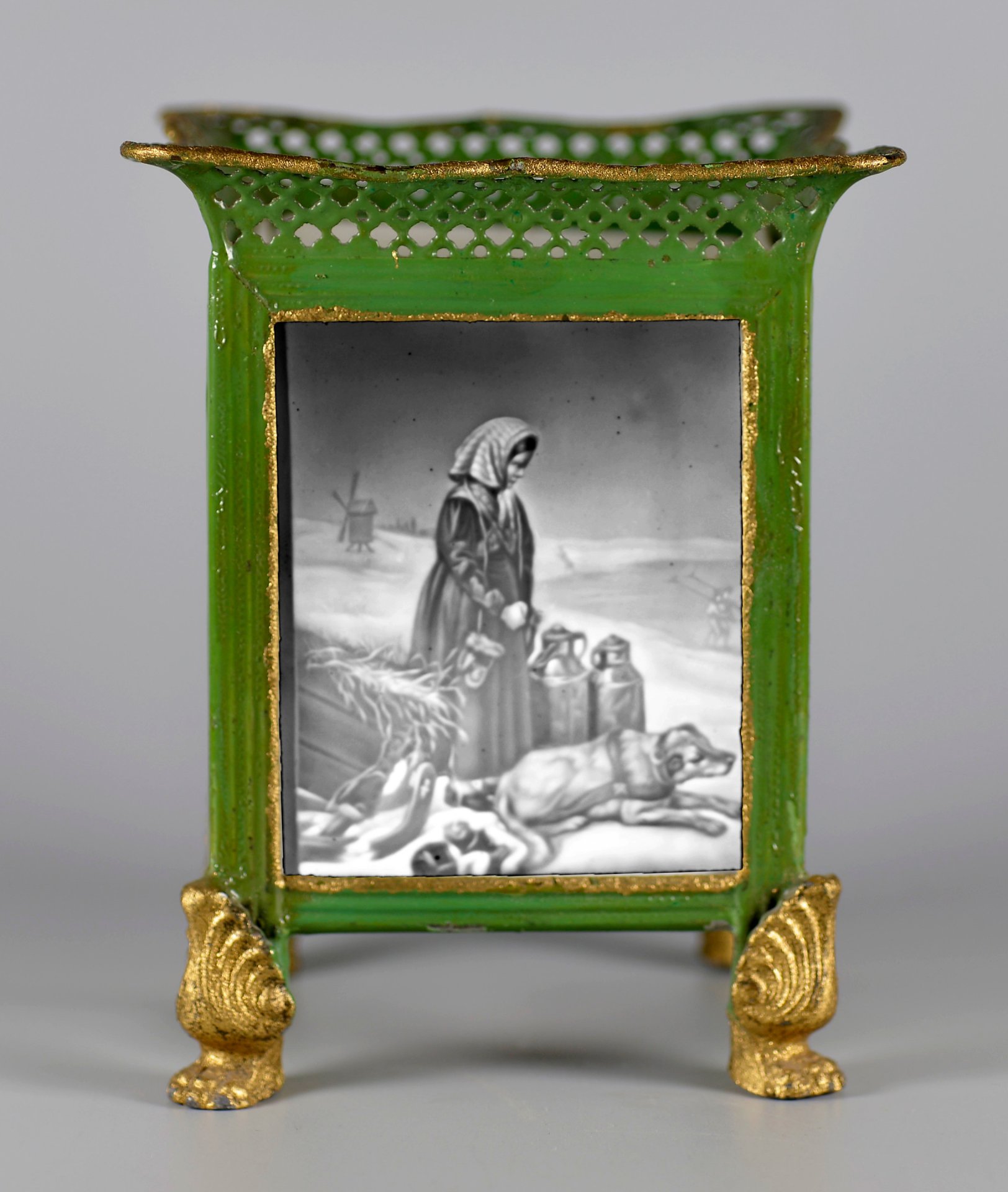 Tischlaterne aus Metall, auf gegossenen Tatzenklauen mit darüber liegenden Palmetten angelöteter quadratischer Grundrahmen; darüber 4 Kartuschen zum Einschieben von Lithophanien in der Größe ca. 9,4 x 7,7 cm; Oberhalb abschließend nach außen gewölbtes Gitternetzwerk mit Wellenrand abschließend. H.: 14 cm