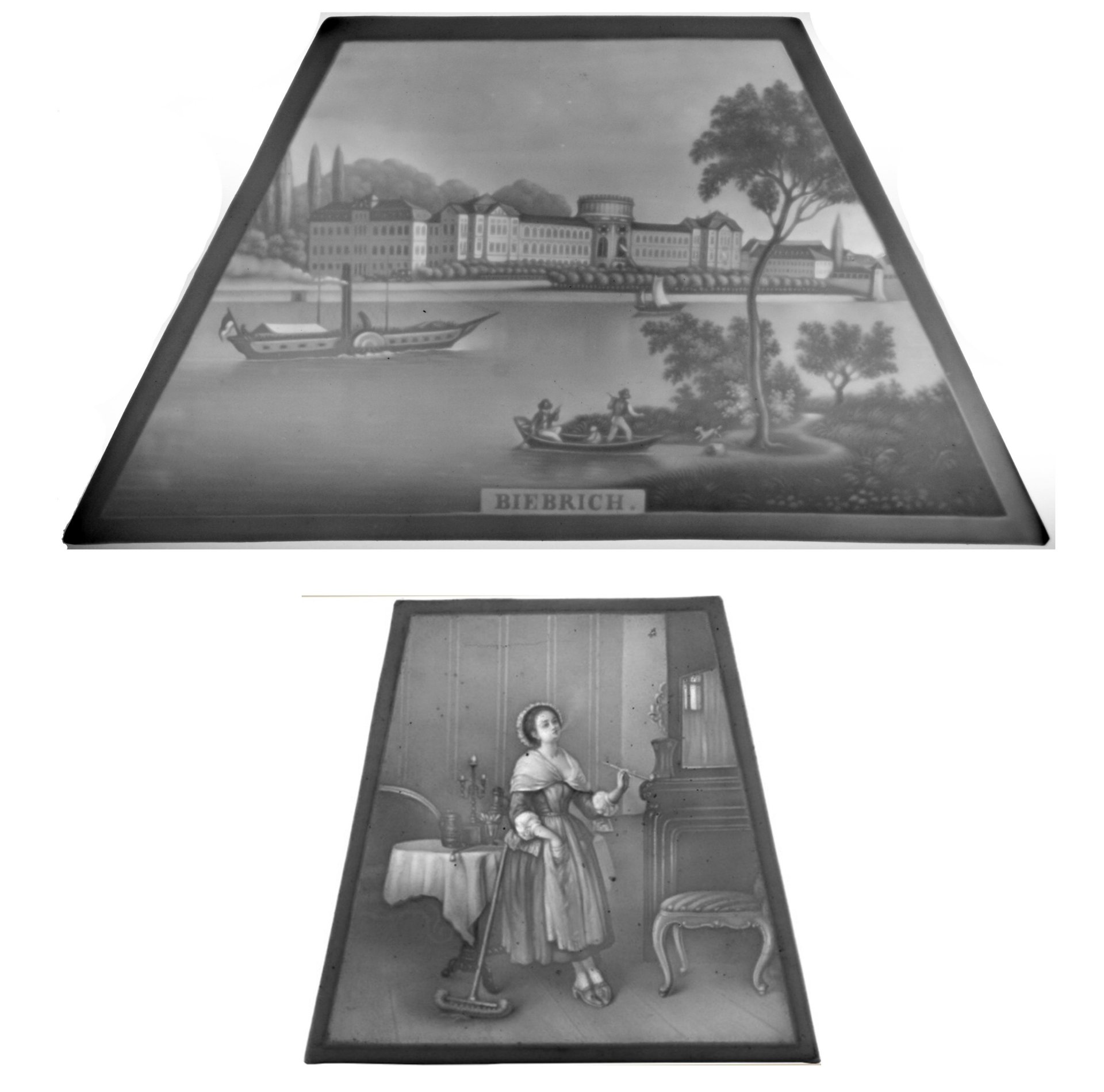 Zwei Ausführungen von trapezförmigen Lithophanien für Lampenschirme der Porzellanfabrik von Carl Heyroth & Co. Sehr häufig auftretend in den Abmessungen (H x B unten x B oben) ca. 13,5 x 13,5 x 8,5 cm (hier HPM 404 - Frivoles Hausmädchen; Nachweis: D0938) und bisher nur die abgebildete Platte ca. 13,2 x 22 x 10,5 cm (HPM 256 - Biebrich; Nachweis: D1350)