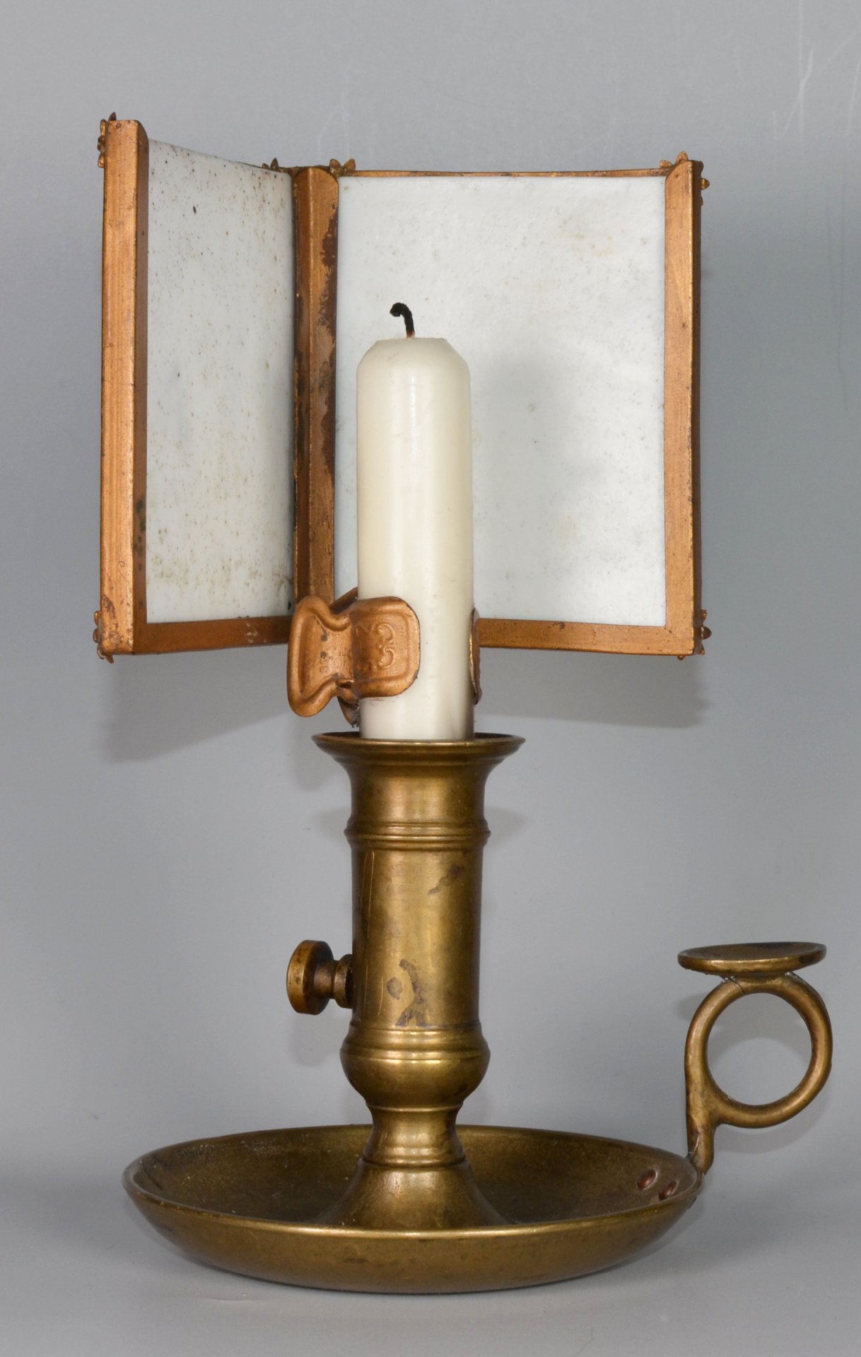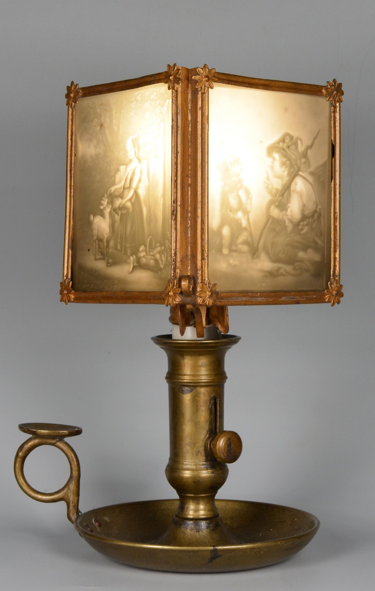 Gelbguss, ehemals vergoldet, mit Clipvorrichtung an eine Kerze; im rechten Winkel zueinander stehende Rahmen zum Einschieben von Lithophanien in den Abmessungen ca. 9,4 x 7,7 cm; Ecken auf der Schauseite mit kleinen Blumen verziert. H.mit Clip: 11 cm; Rahmen: 9,5 x 8 cm