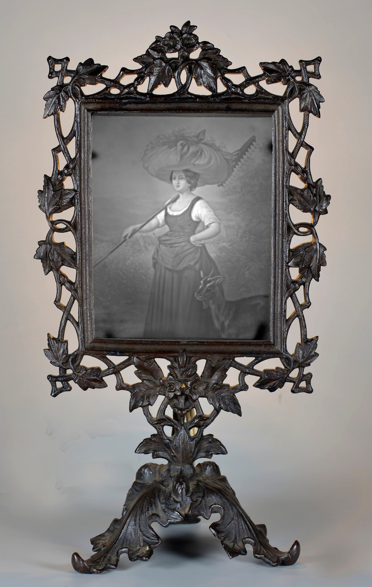 Zweiteiliger Bildschirmständer, verschraubt, Eisenkunstguss, für auswechselbare Bildplatten, Fuß aus 3 abgespreizten Blättern, Rahmen hinten Ritzmarke „80“,Blumen- und Blattgebinde, schwarz, hinten mit festem Kerzenhalter; Hgesamt: 29cm; H.Rahmen: 24 cm; B.: 16 cm