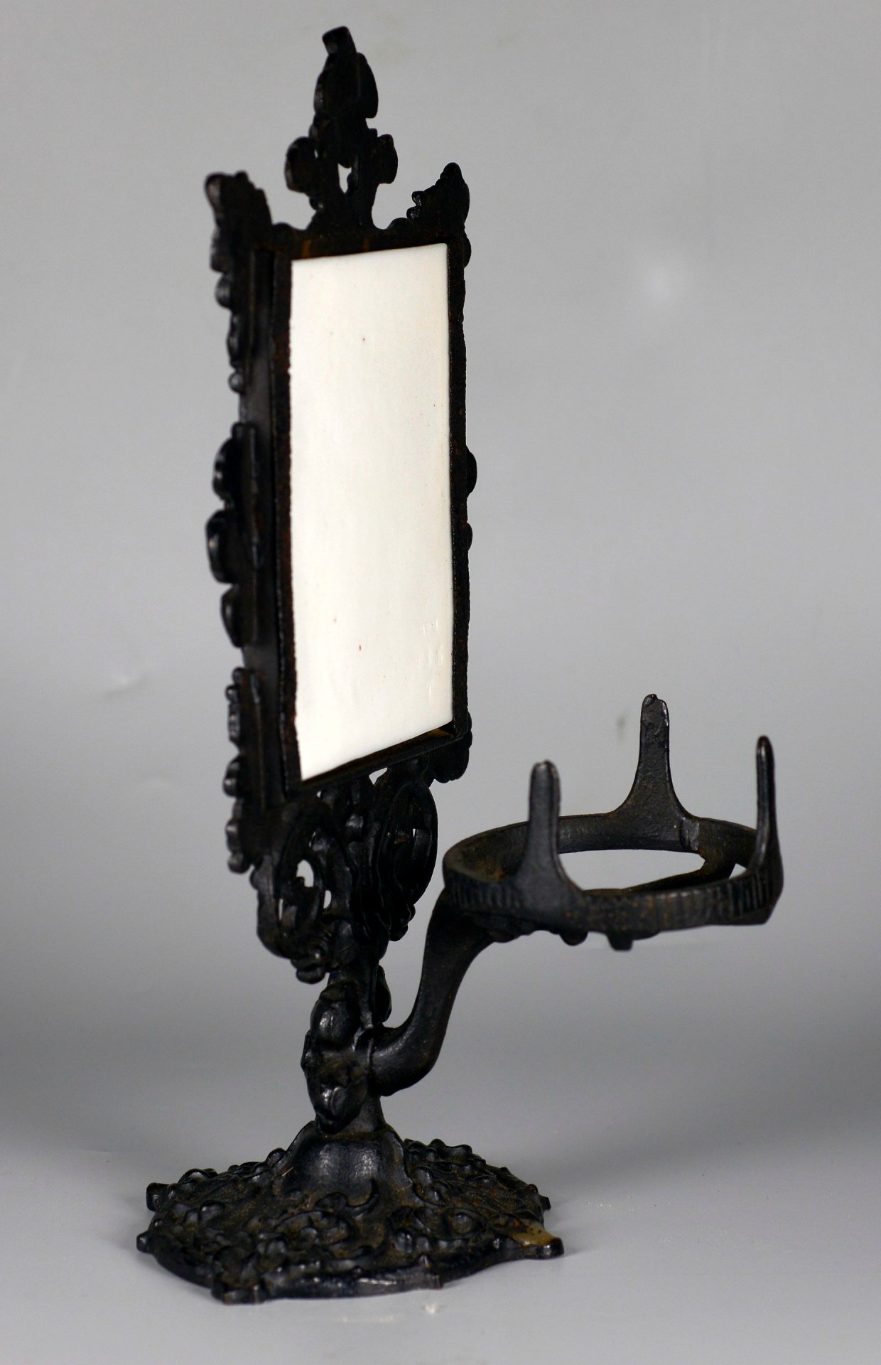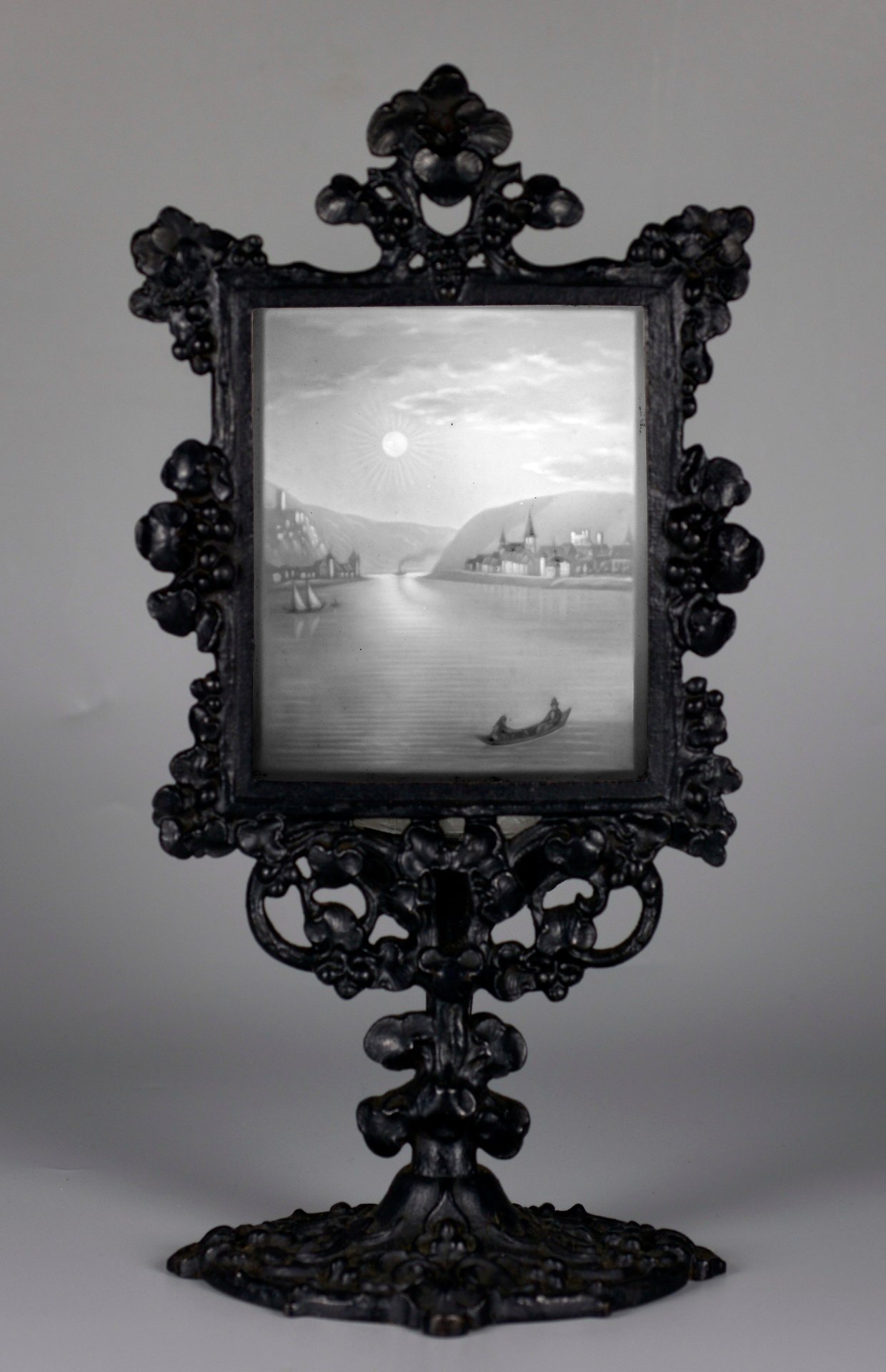 Zweiteiliger Bildschirmständer, verschraubt, Eisenkunstguss, für auswechselbare Bildplatten, Fuß eben, oval mit plastischen Blumen und Ranken, Rahmen mit plastischem Blumen- und Blattwerk, schwarz, hinten mit festem Kerzenhalter; eingefügt ist die Lithophanie von Carl Heyroth & Co. Magdeburg-Sudenburg, Modell HPM 536 - Rheininsel Nonnenwerth; H = 22,5 cm; B = 10,5 cm