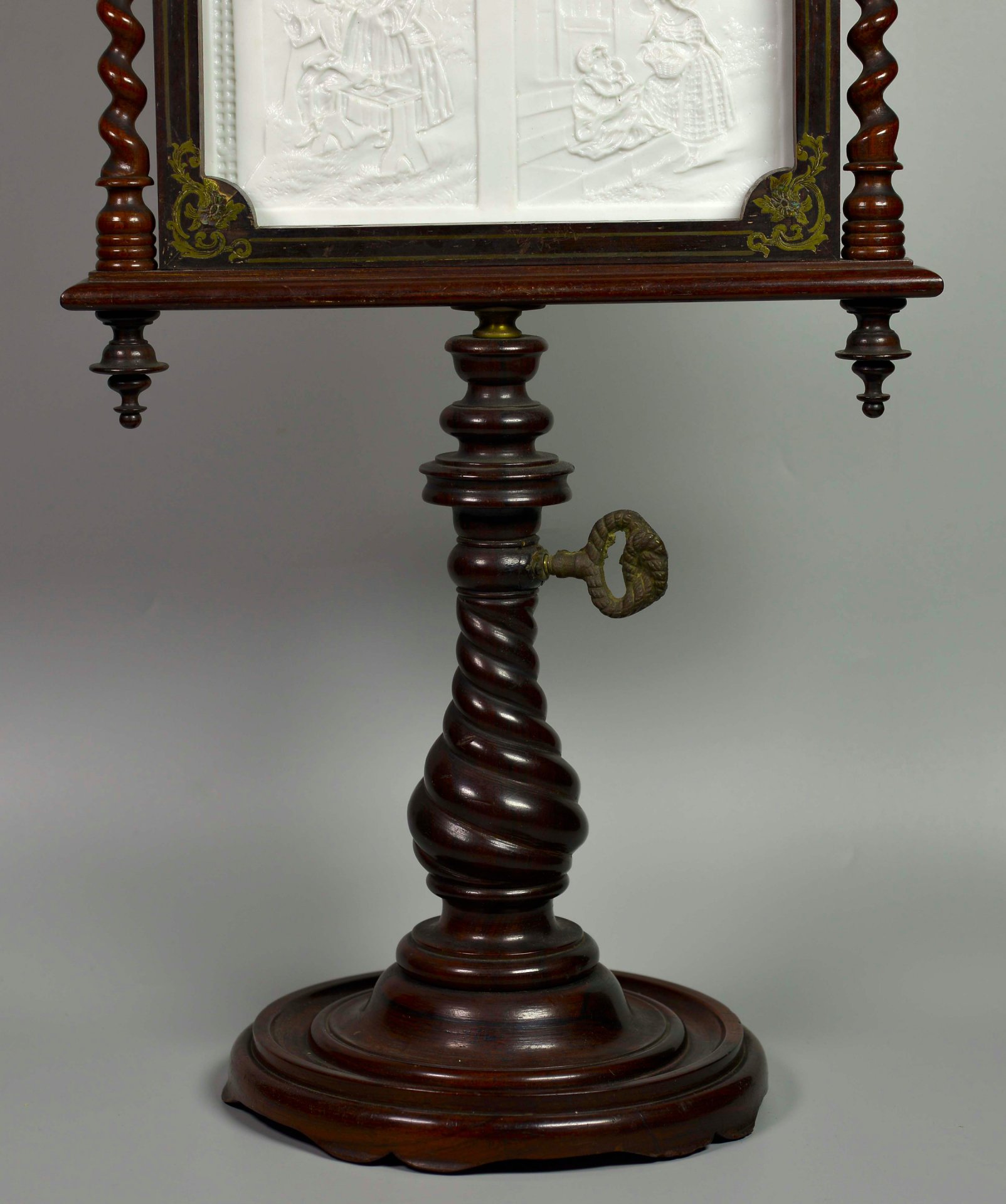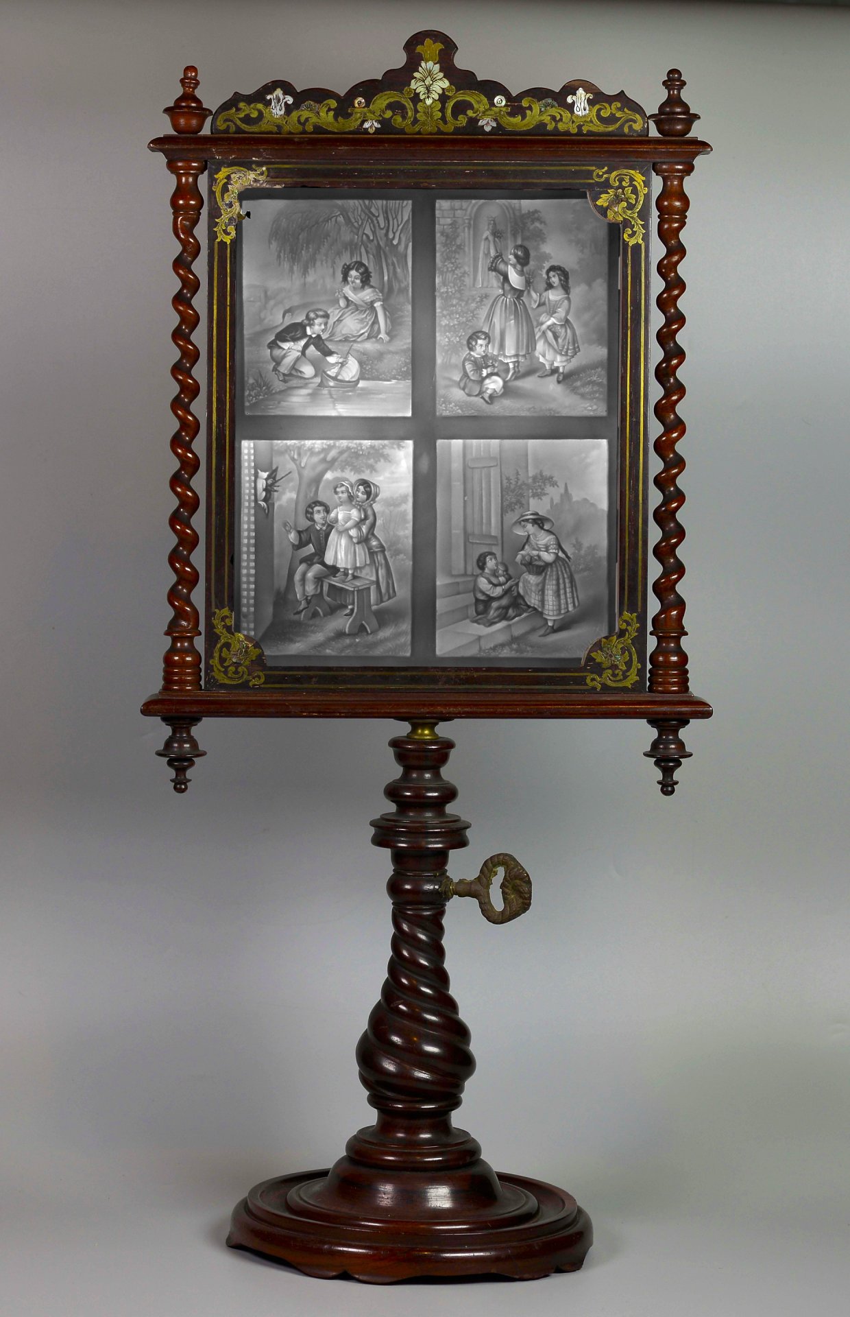 -    eingesteckt in den Sockel ist eine 15 cm lange runde Führungsschiene aus Messing, auf der sich ein rechteckiger Holzrahmen befindet; die Seiten sind mit jeweils einer links- bzw. rechts- schraubenförmig gedrehten Säule verziert. Unten und oben grenzt der Rahmen an eine Profilleiste. Auf der oberen Leiste befindet sich eine Krone. An den vier Ecken unterhalb und oberhalb der Profilleisten sind kleine gedrechselte Applikationen angebracht. Die Krone, Seiten und Ecken sind mit Rocaillen und Blüten aus Messing und Perlmutt intarsiert. Gesamthöhe 47,5 cm
