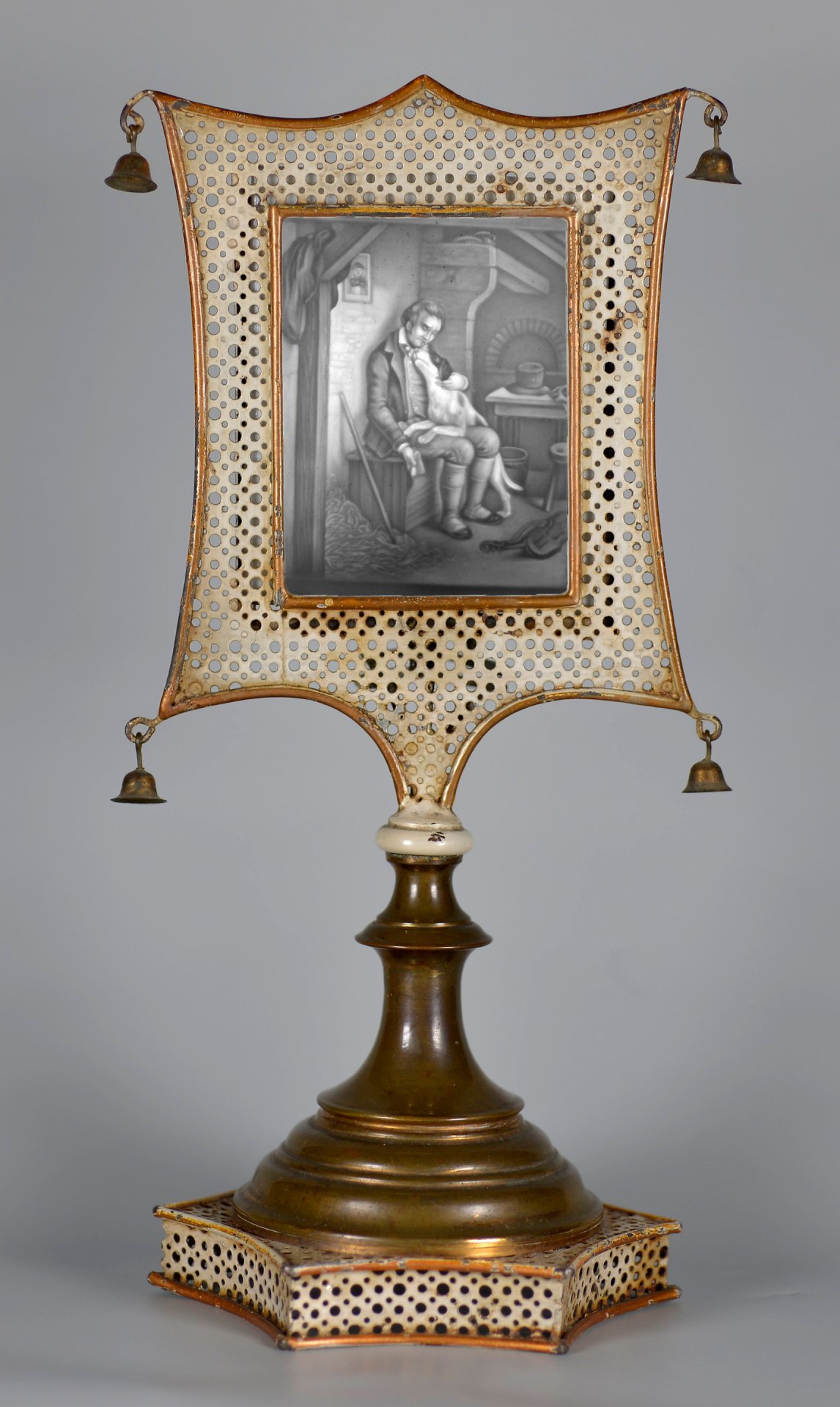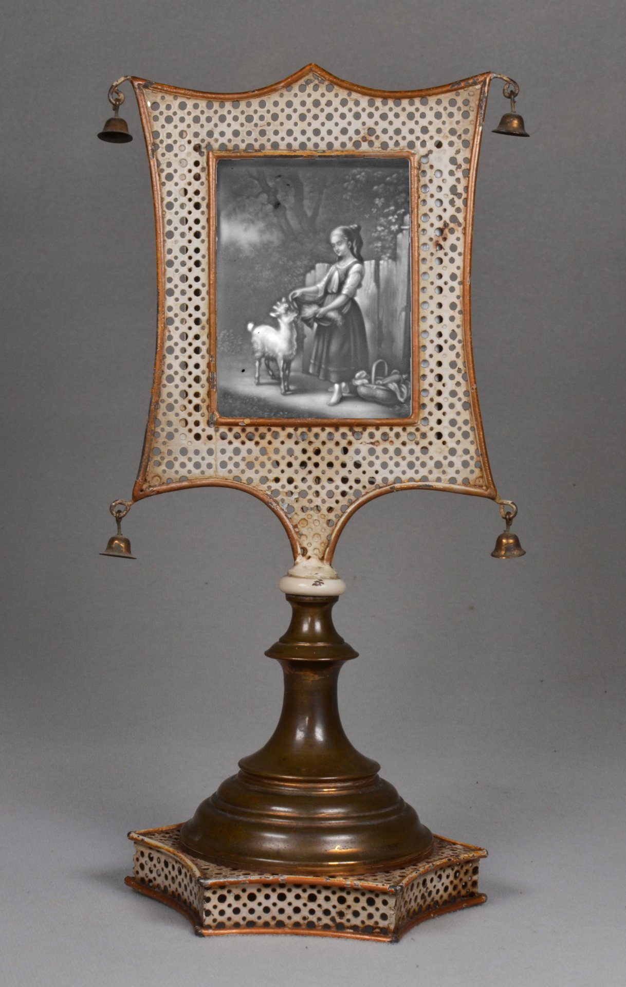 Lichtschirmständer, Messing- und Eisenblech, für Wechselplatten, Fuß und Lichtschirm durchbrochen, an den 4 Seiten des Lichtschirms kleine Glöckchen, hinten Aufnahme für Kerze. H.: 26,5 cm; B.; 11,7 cm.