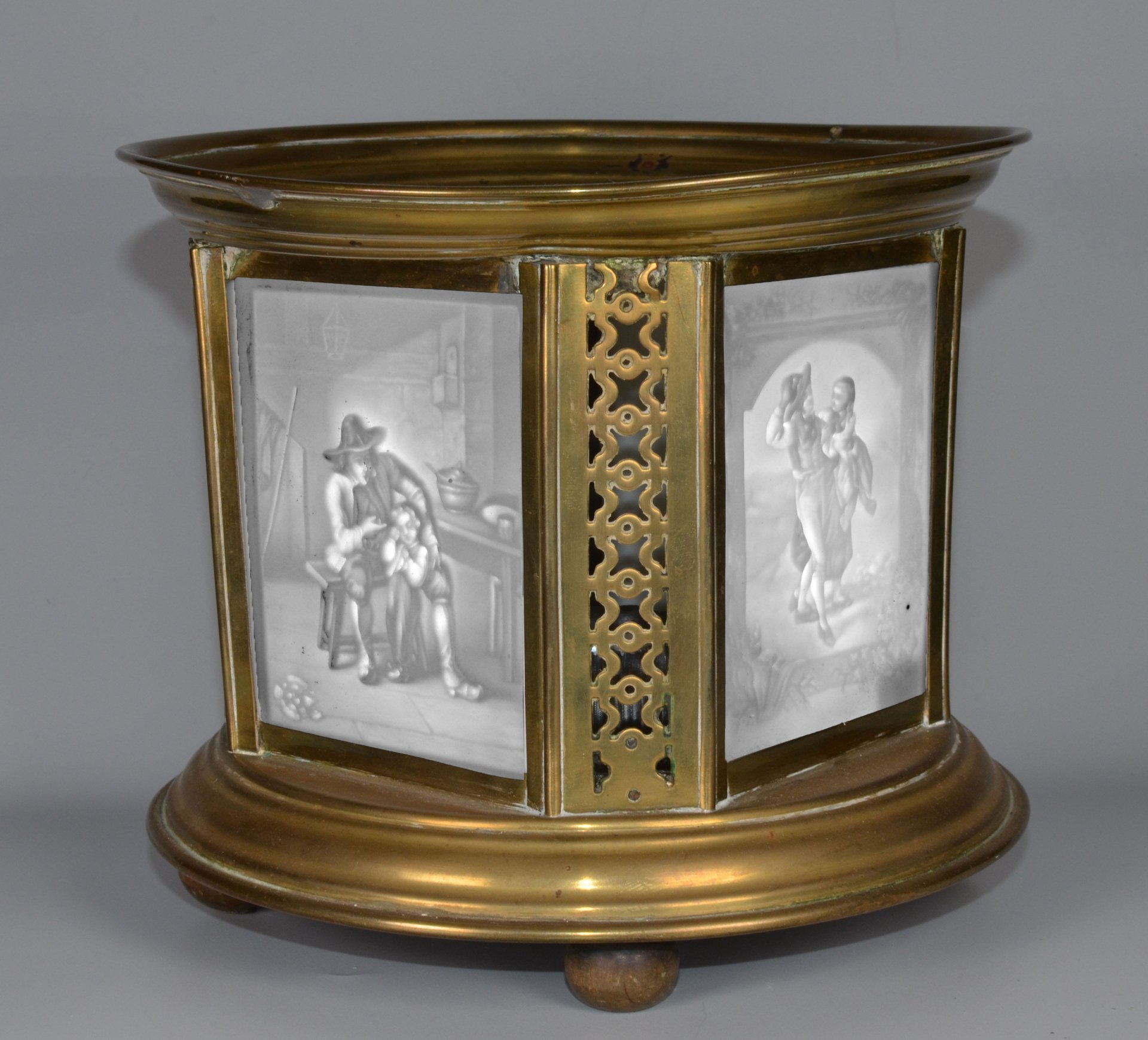 Stövchen, (Réchaud), Messingblech, auf 4 Holzkugeln; unten sich verjüngender runder 5-fach getreppter Teller; darauf quadratisch angeordnet 4 durchbrochene senkrecht stehende Ecken; dazwischen Aufnahme von oben einschiebbaren Lithophanien in den Abmessungen 9,4 x 7,7 cm; darüber sich weitender 4-fach getreppter Teller mit aufgelegter loser runder, mit Ornamenten durchbrochener Scheibe. H. mit Kugelfüßen: 15 cm; H. ohne Kugelfüße: 13 cm; D. unten: 17cm; D. oben: 17cm