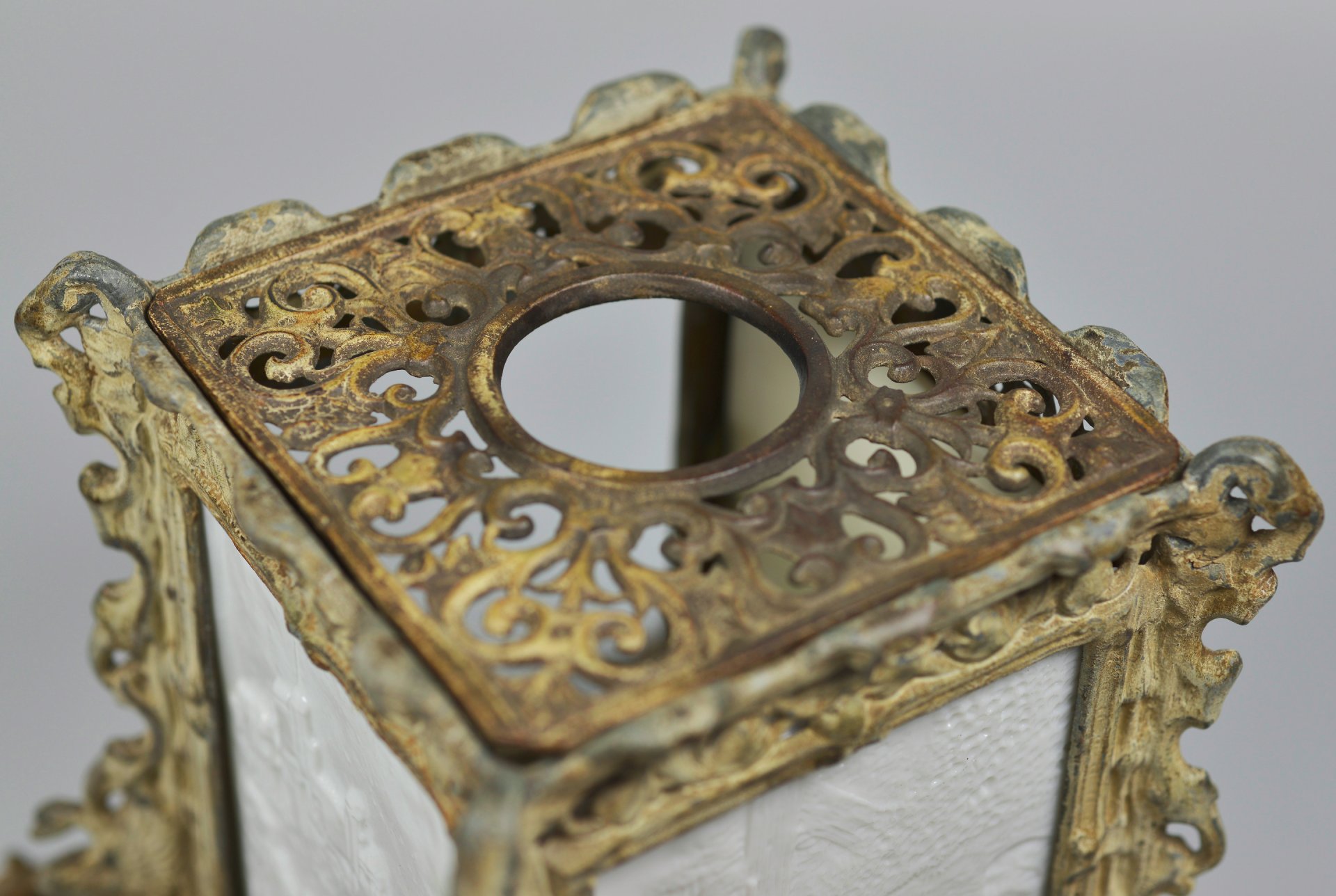 Stövchen, (Réchaud), Eisenkunstguss, auf 4 weit ausgestellten Füßen an zwei Stellen aufgeschraubter Quaderförmiger Gusskörper mit aufwendiger plastischer Ornamentik, an den 4 Seiten jeweils die Aussparungen für die Lithophanien. Als Abschluss eine reich durchbrochene Deckplatte. Der gesamte Korpus war wohl ursprünglich weiß oder chremefarbig gefasst. H=14,5 cm, Fuß: 17,5 x 17,5 cm; Quader unten: 12 x 12 cm; Quader oben: 11 x 11 cm; Deckplatte: 8,7 x 8,7 cm.