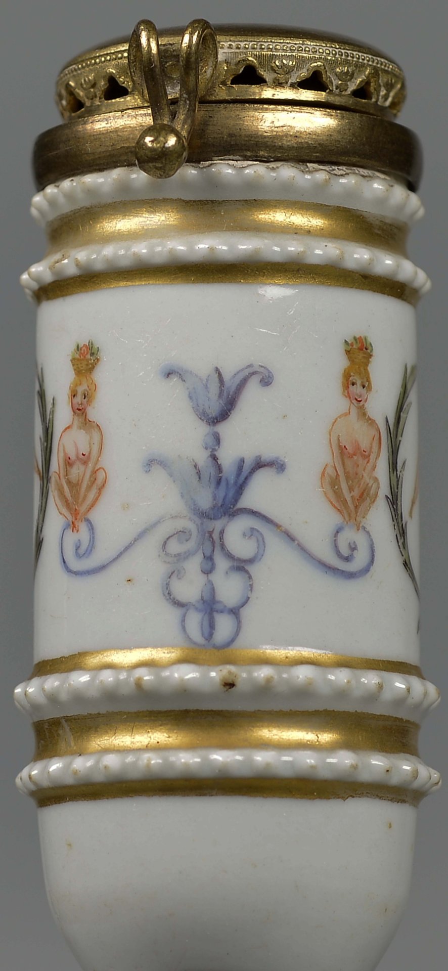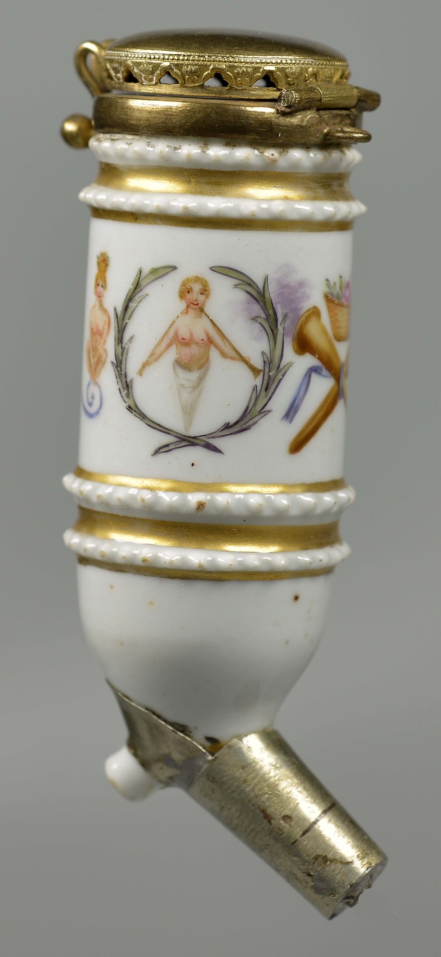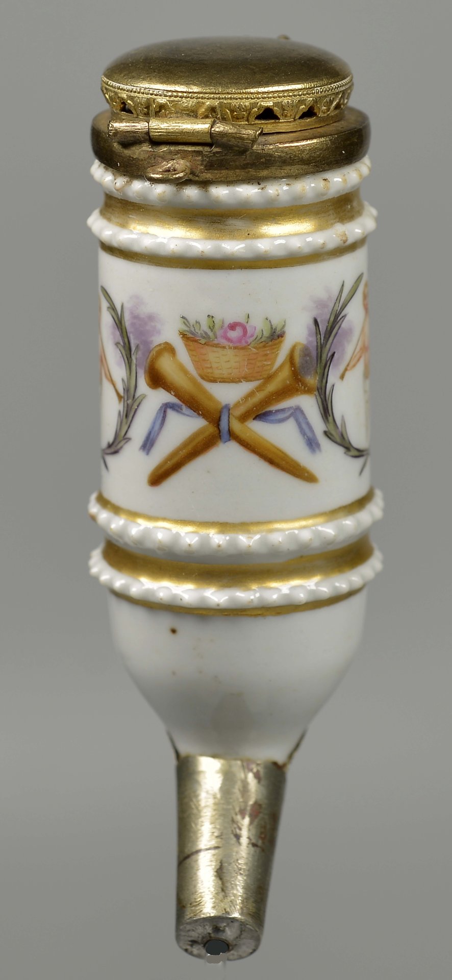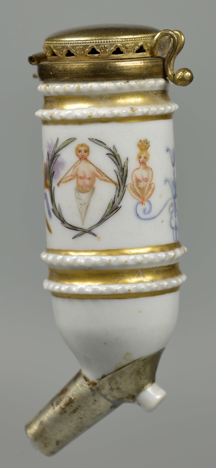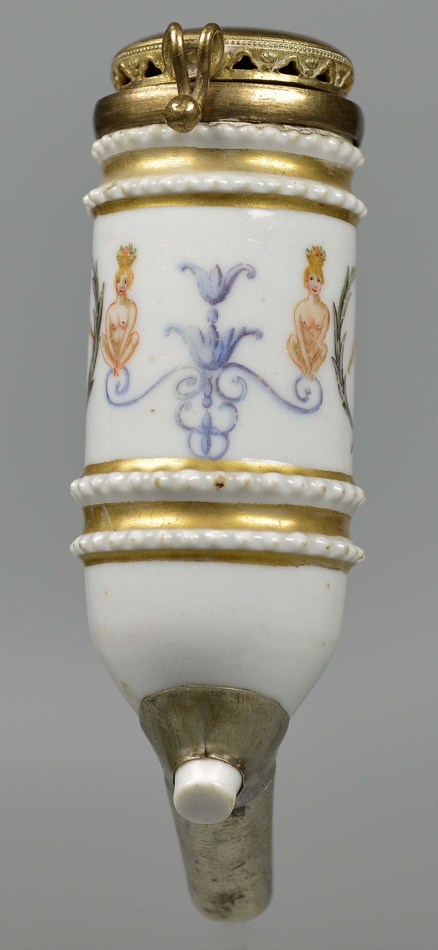 Pfeifenstummel aus Porzellan, Zylindrischer Korpus; auf der Wandung oben und unten umlaufend zwei doppelte Perlfriese; dazwischen mit bunten Muffelfarben, in Blau eine Arabeske, aus der zwei stilisierte Blütenkelche herauswachsen; auf waagerecht davon ausgehend, am Ende volutenartig eingerollten Ranken sitzt zu beiden Seiten der Blütenkelche eine unbekleidete Frau mit angewinkelten Beinen, die Hand in den Schoß gelegt, auf dem Kopf einen Korb mit Blüten oder Früchten tragend. Auf den Seiten, eingerahmt von Zweigen mit langen, schmalen, schilfartigen Blättern jeweils eine Frau, deren Oberkörper aus einer nach unten spitz zulaufenden, weißen Hülle emporsteigt. Die Dargestellten halten in jeder Hand ein langes Horn, das sie Blasen; rückwärtig zwei gekreuzte Füllhörner, die mit einem blauen Band miteinander verbunden sind, und aus deren Öffnung violetter Rauch quillt; darüber in der Mitte ein geflochtener Korb, gefüllt mit Rosen. Der abgebrochene Stiel ist durch eine Metallhülle ersetzt, die die Ferse einschließt. Montur: Messing oder Bronze feuervergoldet. H = 9,8 cm