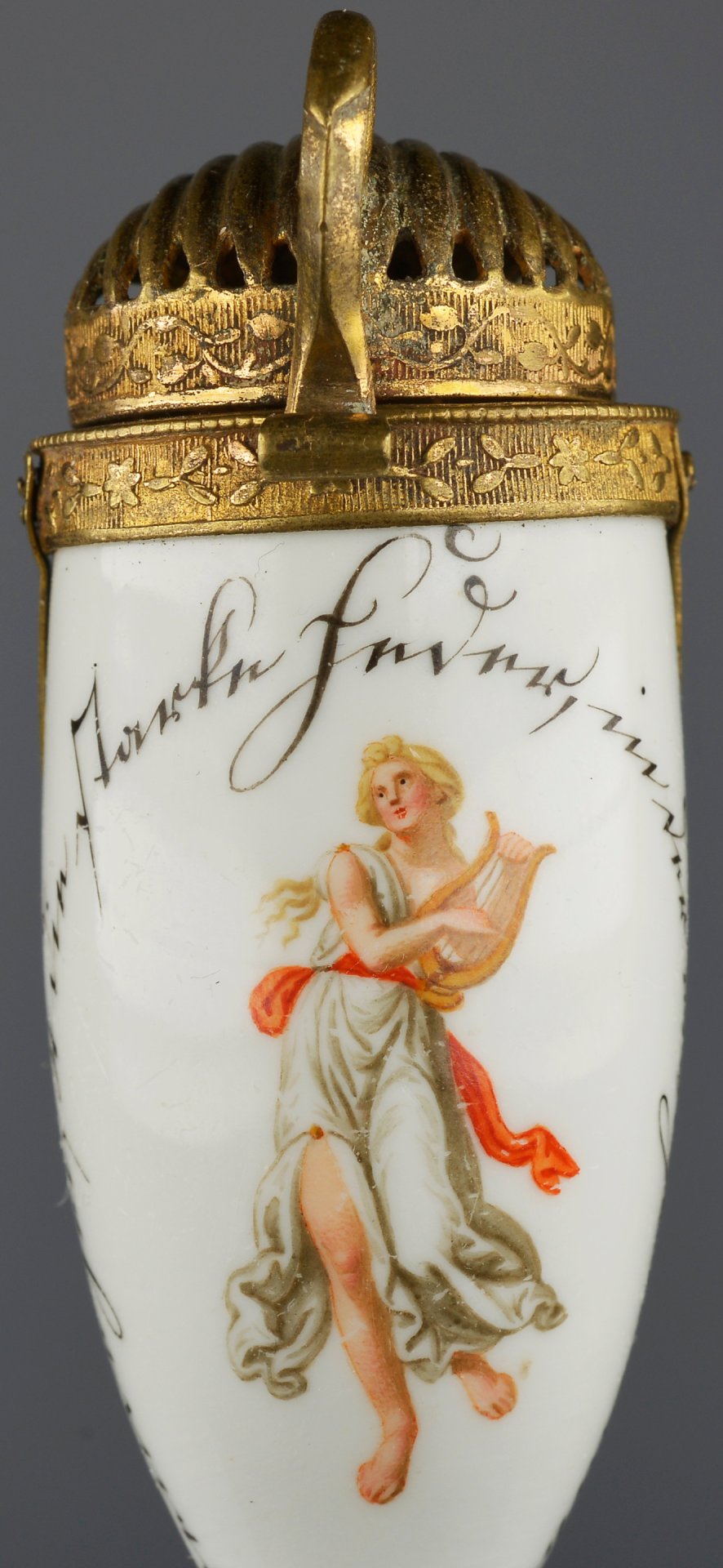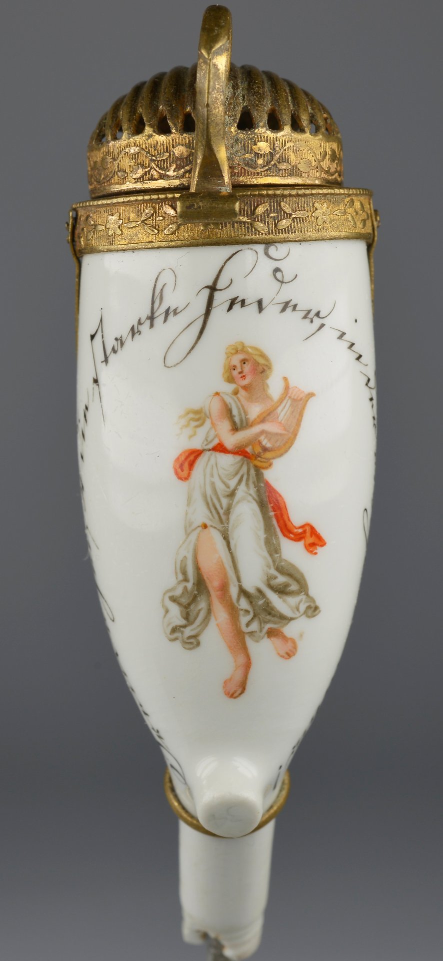 Pfeifenstummel aus Porzellan, Berliner Form, auf der Schauseite in feiner Lupenmalerei mit bunten Muffelfarben Darstellung einer weiblichen Figur mit Lyra als Allegorie für Muse oder Poesie. Die Figur ist beinahe vollständig umrandet mit einem handschriftlichen Spruch in schwarzer Kurrentschrift, der frei übersetzt als Ode an die Freude zu interpretieren ist; Ferse mit Presszahl 34; im Kessel unterglasurblaue Schwertermarke mit Stern (1774-1817); Montur: Messing vergoldet mit angenieteten Bändern als Festhalte über den Stiel gelegt; H.: 10,2 cm (a=82,5; b=62,4; c= 30,5 mm)