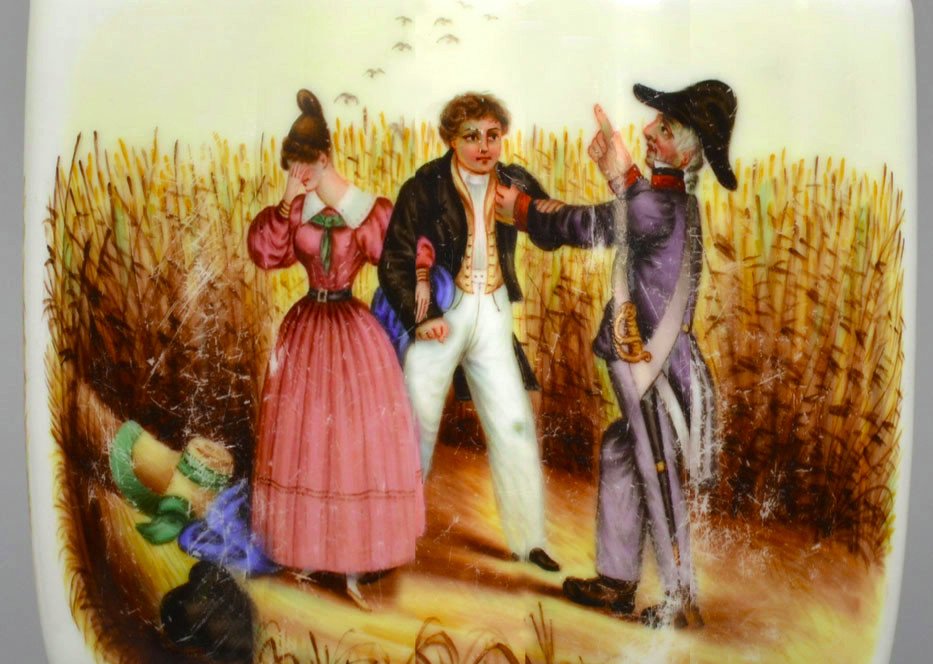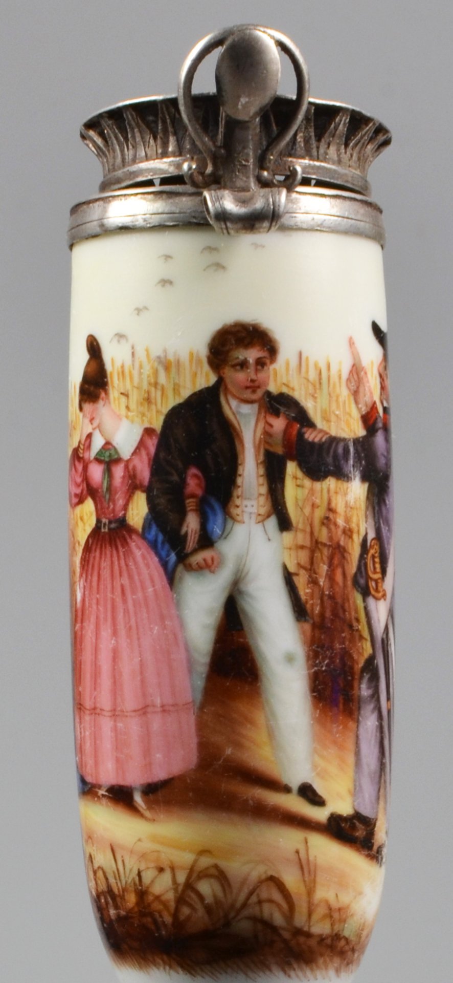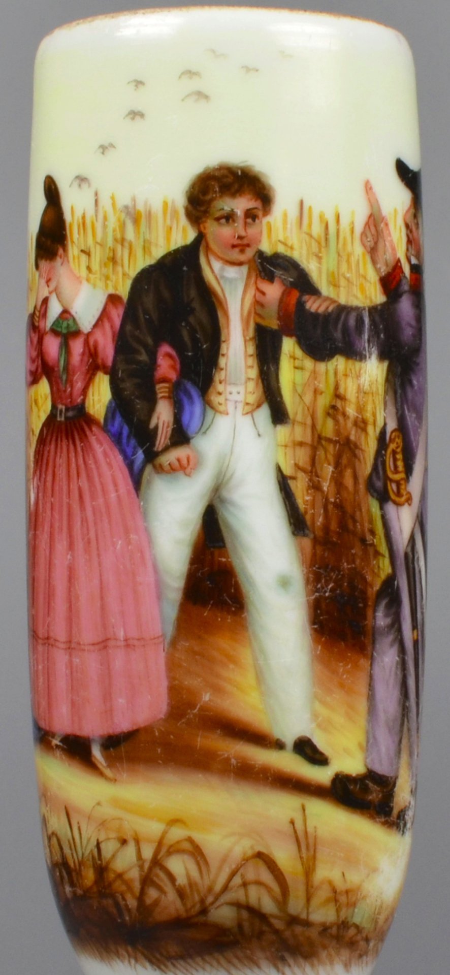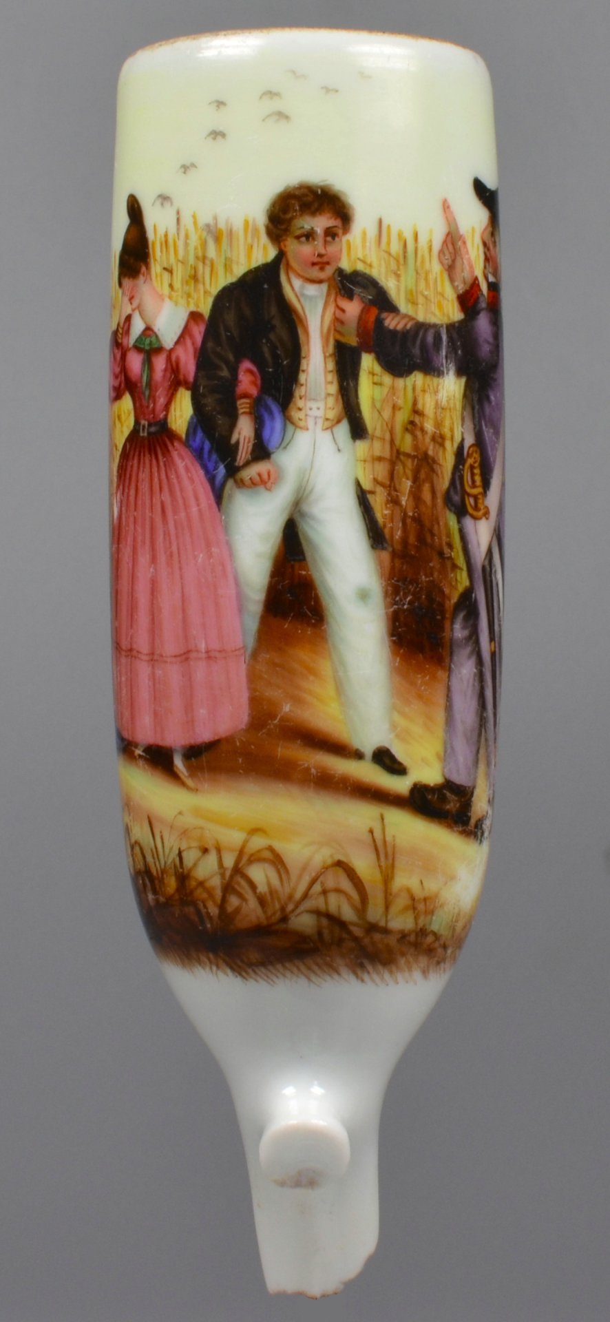 Pfeifenstummel aus Porzellan, zylindrische Form, beinahe vollständig auf dem Korpus umlaufend mit bunten Muffelfarben die Darstellung einer Szene, in der ein junges Paar von einem Gendarmen mit erhobenem Finger ermahnt wird. Die jungen Leute haben sich ihrer Kopfbekleidung entledigt und der blaue Schal der jungen Frau liegt schon halb auf der Erde. Sie hat dn Kopf schämend weggedreht und hat ihren Arm eingehakt. Im Hintergrund ist ein Kornfeld, aus dem gerade Vögel aufsteigen. Stiel ist zur Hälfte abgebrochen und fehlt. H.: 11,1 cm (b=98; c=34,9 mm)