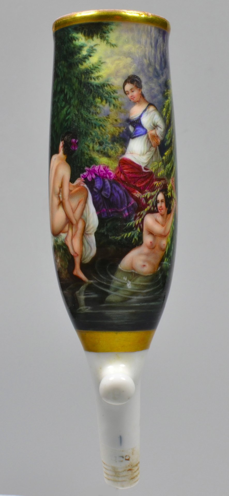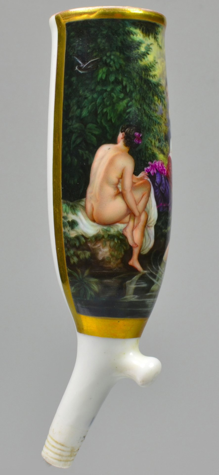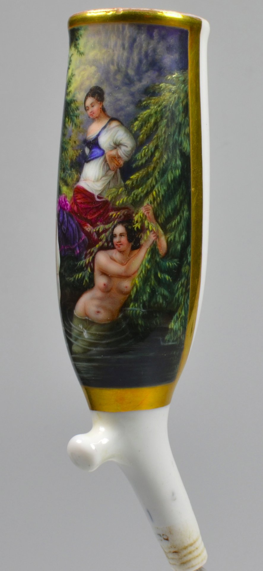 Pfeifenstummel aus Porzellan, ovaler Korpus, sich nach oben erweiternd (Morgenroth Nr. 45), auf der Wandung ¾ den gesamten Korpus umspannendes, golden gerahmtes Bildfeld; in bunten Muffelfarben Darstellung zweier nackter badender Mädchen im Wald, die am Ufer von einem bekleideten Dritten beobachtet wird.. Ferse mit Presszahl 8, Auf dem Stiel unterglasurblau „PFS unter senkrechtem Strich. H.: 13,8cm (b=108,5; c=37,7mm)