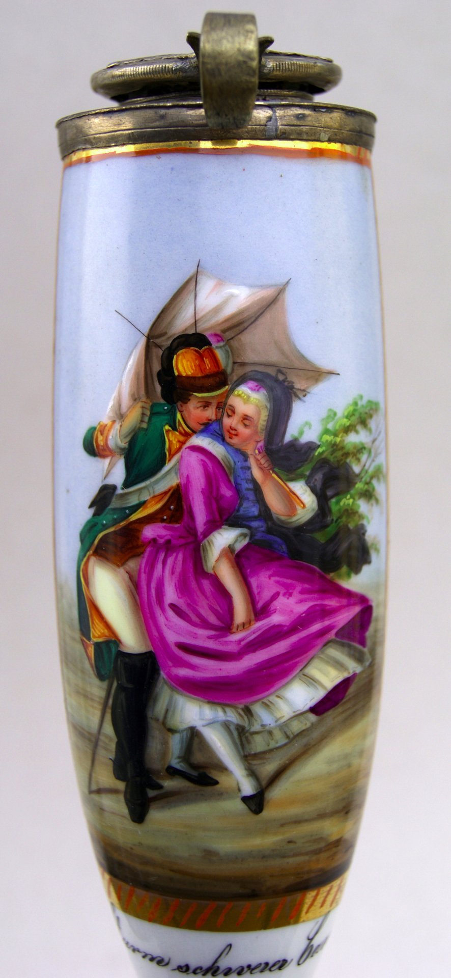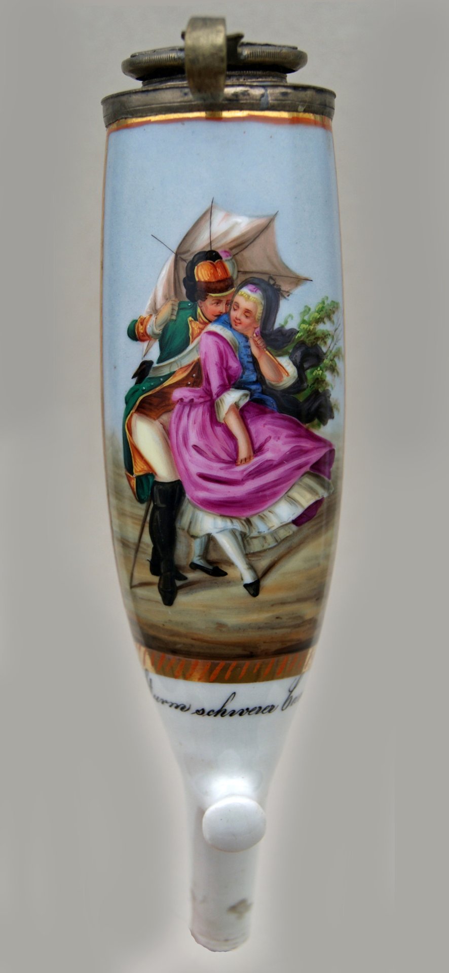 Pfeifenstummel aus Porzellan, Berliner Form; auf der Wandung beinahe zur Hälfte den Korpus umspannendes, golden, später mit roten Querstrichen gerahmtes Bildfeld; darin in bunten Muffelfarben die Darstellung einer rückwärtigen Annäherung eines Soldaten an eine junge Frau mit geöffnetem Sonnenschirm. Darunter in schwarzer Schreibschrift: "Sturm schwerer Cavallerie". Rückseite im Kessel von oben beginnend ca. 3cm langer Riss, der nachtäglich mit einer Girlande und Trotteln in Gold und Rot übermalt wurde. Montur Silber, nachträgliche Anpassung durch Zwischenlötung von Segmenten. Deckelscharnier ausgebrochen. Gesteck mit sehr großem Saftsack (H.: 12,2cm), Teestaude und Hornmundstück. GL.:67cm; H.: 17,8 cm