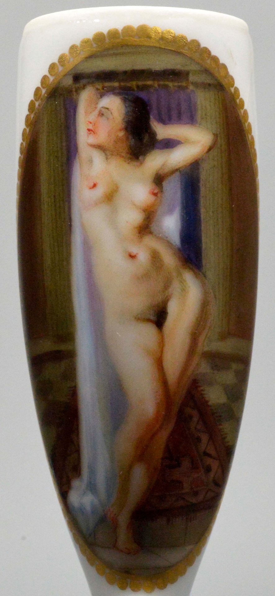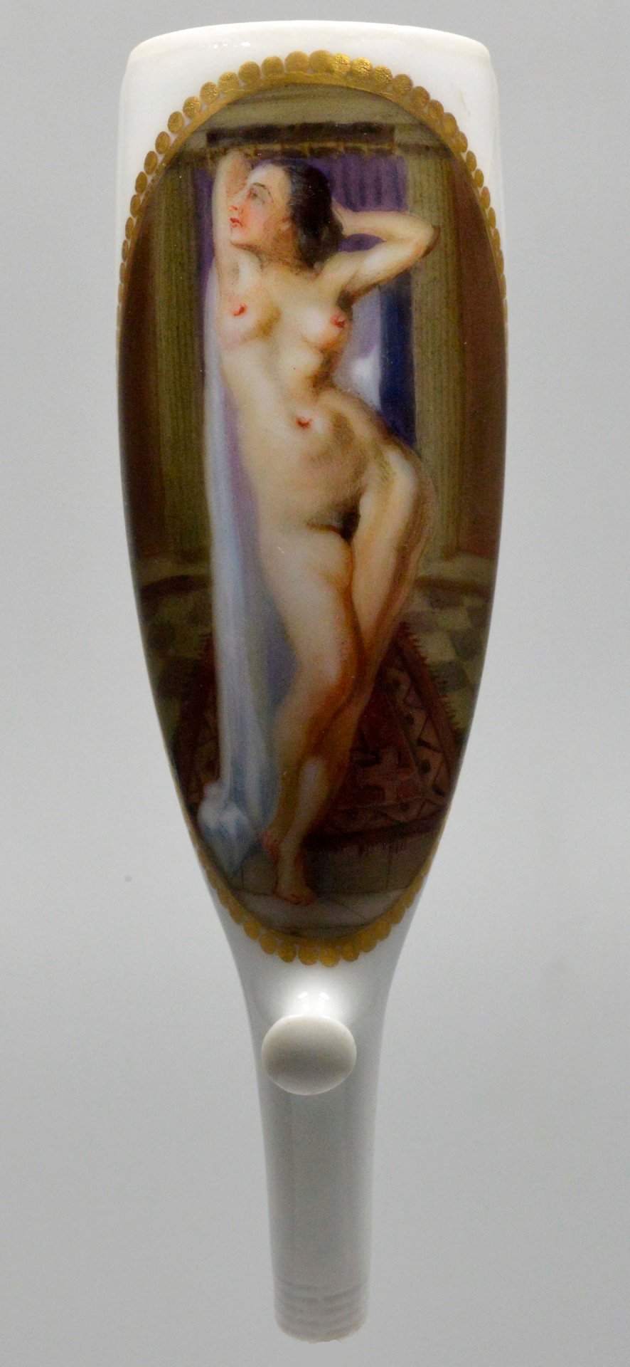 Pfeifenstummel aus Porzellan, Berliner Form, auf der Schauseite in einer mit goldener Perlschnur eingefassten Kartusche in bunten Muffelfarben Darstellung einer jungen Frau, die sich stehend mit den Armen hinter dem Kopf rekelt; Fliesen, Duschvorhang und ein Badetuch weisen auf eine Situation nach dem Bade. H.: 12cm (b=93,8; c=35,4mm)