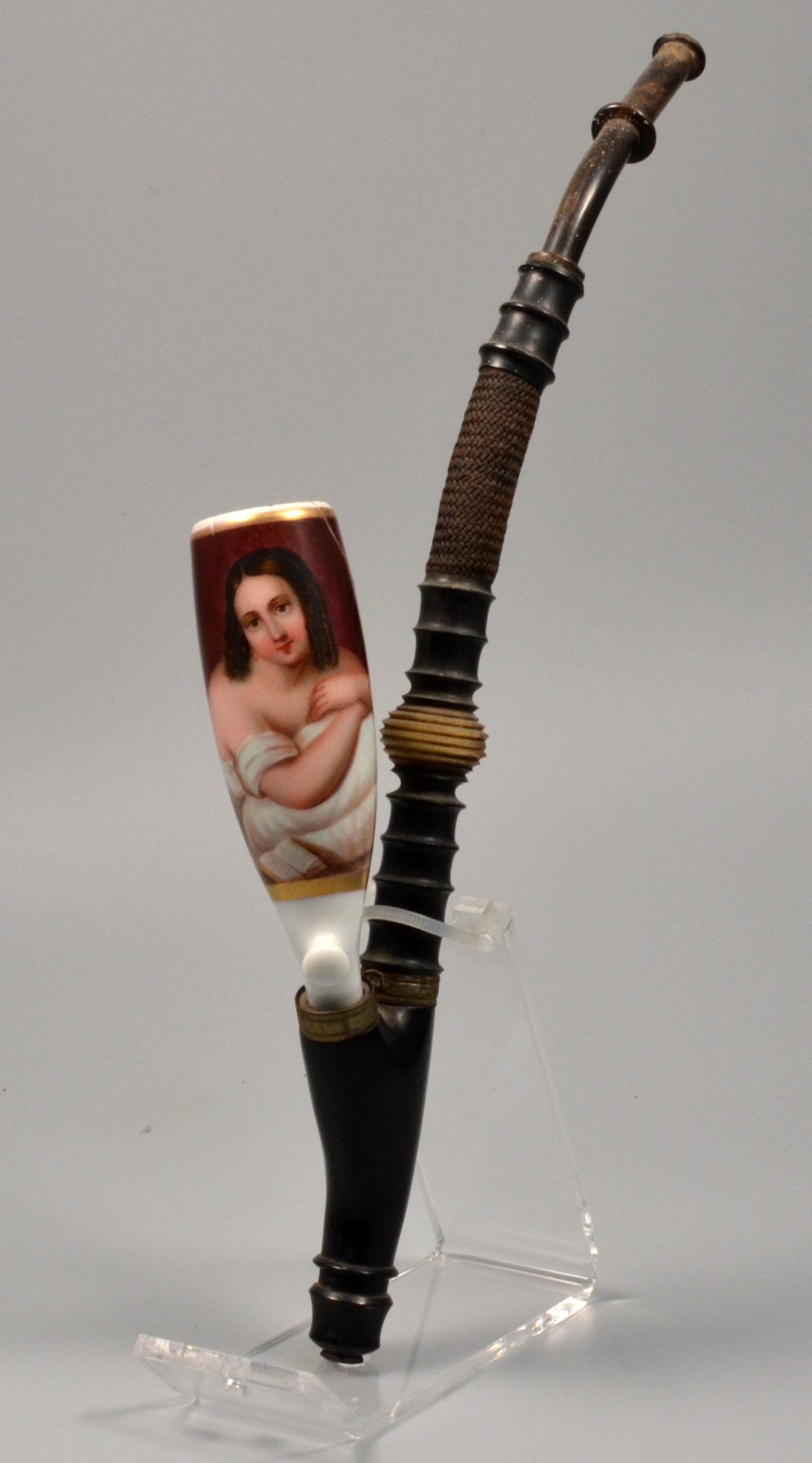 Pfeifenstummel aus Porzellan, Berliner Form; auf der Wandung fast vollständig den gesamten Korpus umspannendes, golden gerahmtes Bildfeld; in bunten Muffelfarben die Darstellung eines auf dem Bett liegenden, schulterfreien Mädchens mit abgelegten Buch. Sprung und geklebte Ausplatzung am oberen Kesselrand, Stummelferse mit Pressmarke 6. H.: 10,2 cm (a=102,4; b=79; c=28 mm)