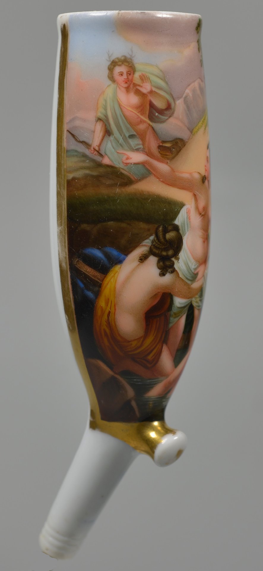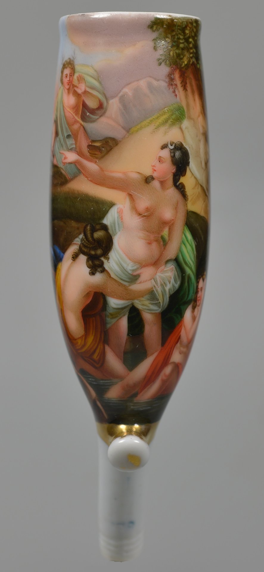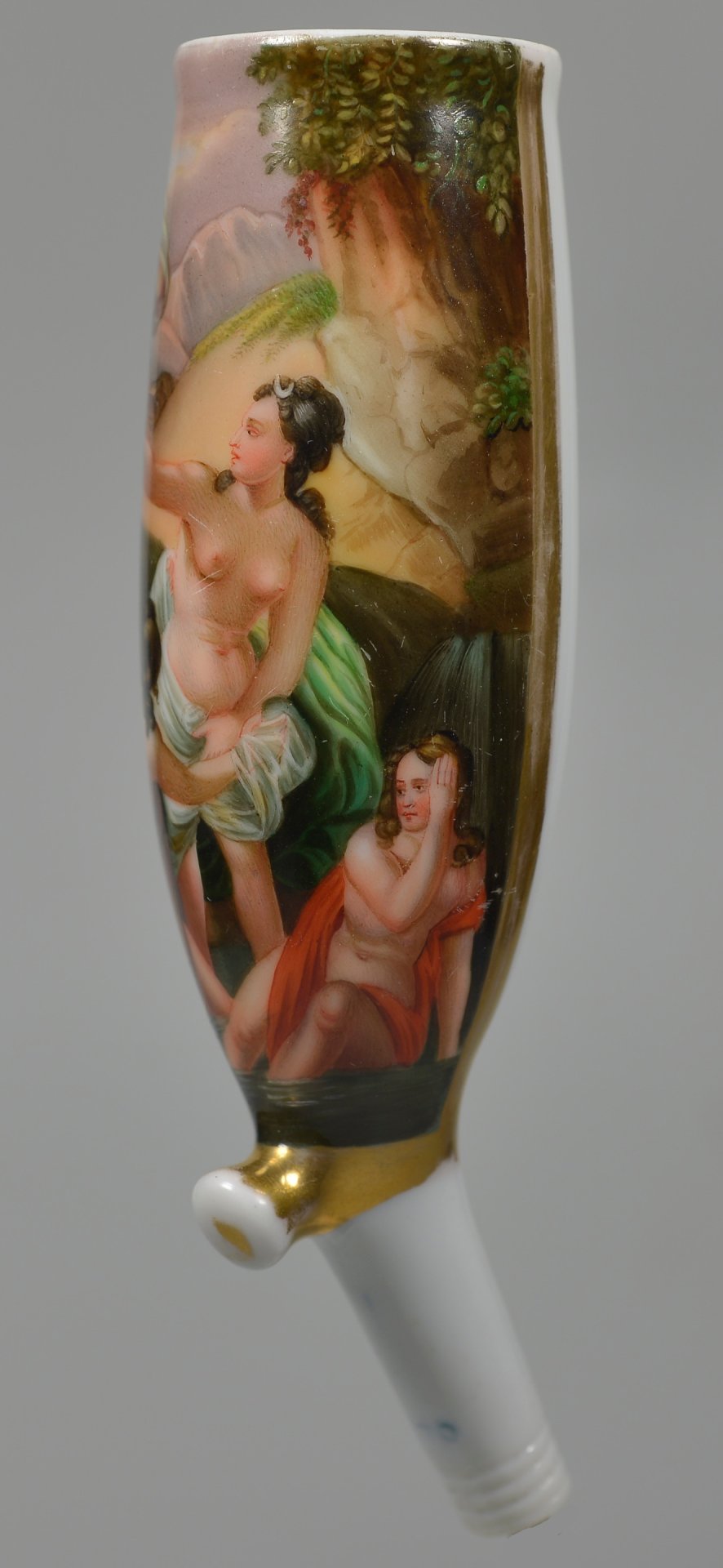 Pfeifenstummel aus Porzellan, ovaler Korpus, sich oben erweiternd, auf der Wandung ¾ den gesamten Korpus umspannendes, golden gerahmtes Bildfeld; in bunten Muffelfarben Darstellung dreier spärlich bekleideter junger Frauen in einem Wasser; oberhalb Amor, der die Hand wie zum Rufe vor den Mund hält und in der rechten Hand einen Bogen hält; auf dem Stiel unterglasurblau PFS unter Strich, H.: 12,5cm (b=98,5; c=36,5mm)