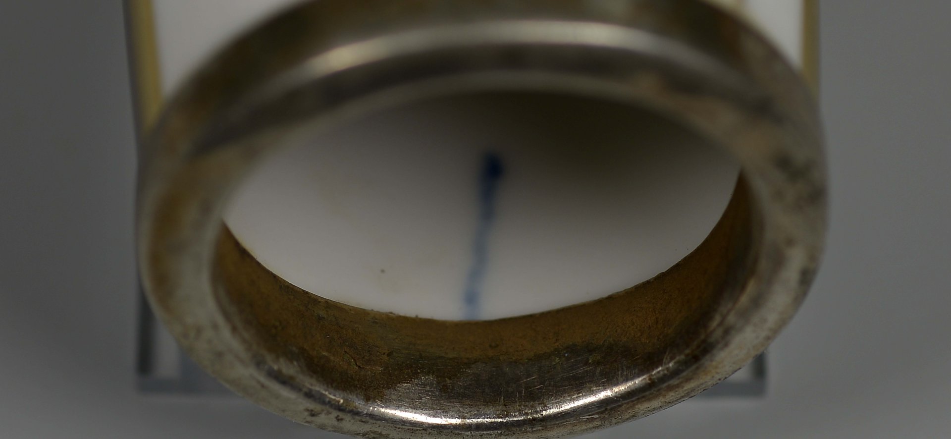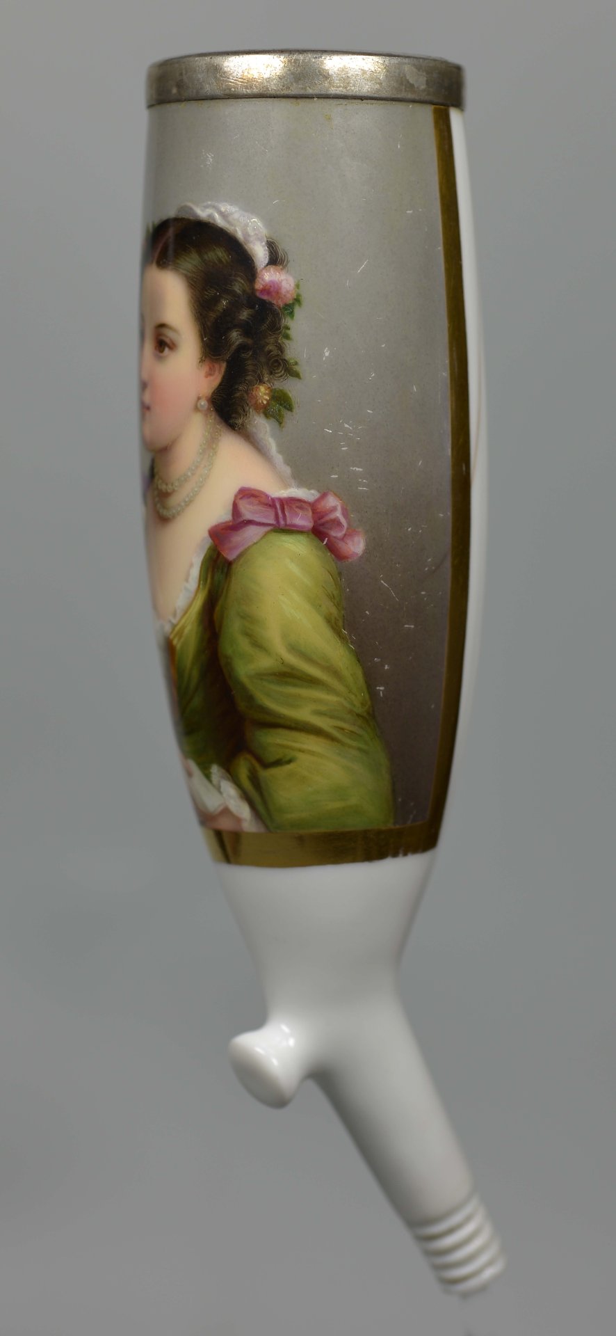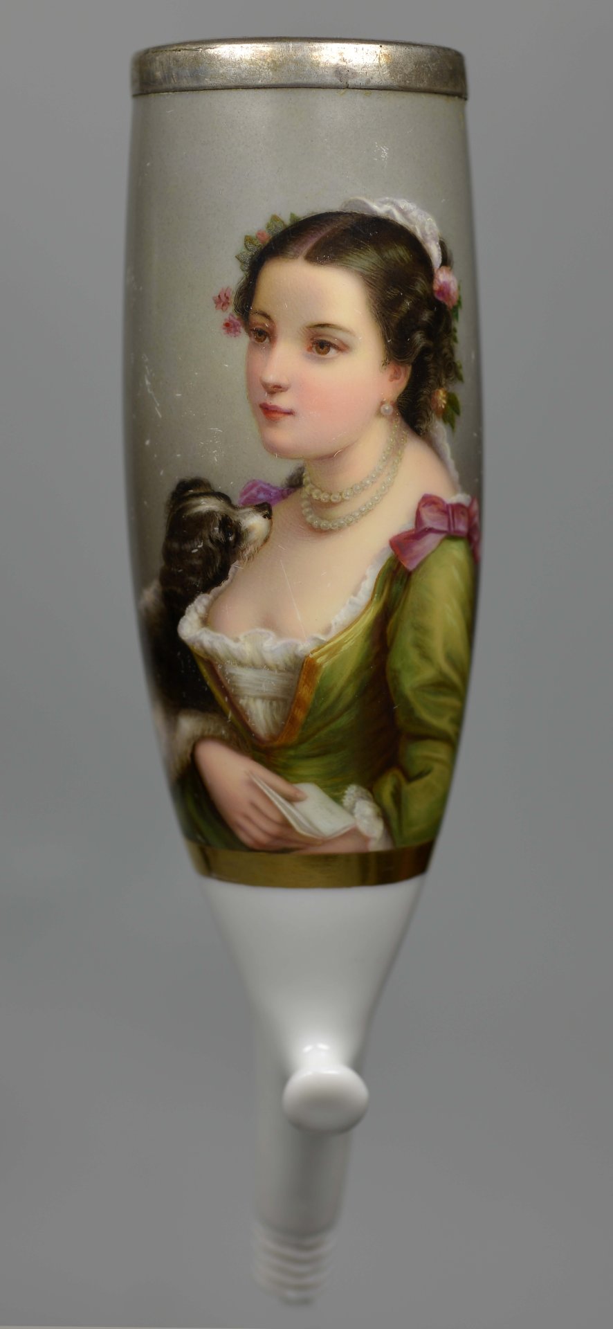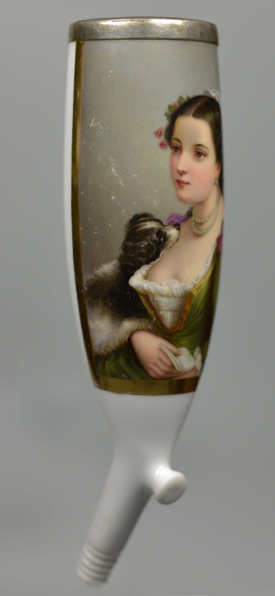 Pfeifenstummel aus Porzellan, Berliner Form, auf der Wandung ¾ den gesamten Korpus umspannendes, golden gerahmtes Bildfeld; darin auf grauem Fond das Halbportrait eines jungen Mädchens mit einem ausgeschnittenen grünen Kleid, das nach oben auf der Schulter mit einer roten Schleife abschließt; sie trägt eine Perlenkette und hält im angewinkelten rechten arm einen kleinen schwarz-weißen Schoßhund, der seinen Kopf an das Dekolleté anschmiegt; die braunen Haare sind in der Mitte gescheitelt und mit einem weißen Band und an den Seiten mit Rosen geschmückt; das Mädchen schaut verträumt in die Ferne und hält ein Heft in der rechten Hand; im Kessel unterglasurblauer Strich; auf der rechten Seite am Stiel Pressmarke 11 für die Größe, Montur; Silber (nicht als Halterung für den Deckel, sondern als Stabilisierung des Kessels, der einen Haarriss von ca 6,3 cm am linken seitlichen Teil besitzt); H.: 16 cm (a=158; b=131,9; c=45 mm).