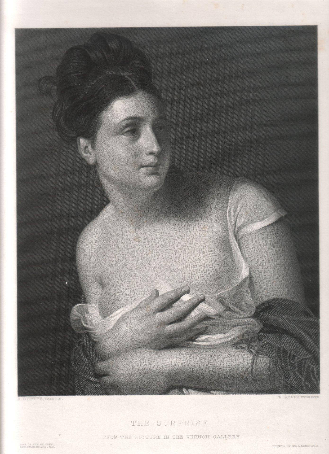 Pfeifenstummel aus Porzellan, Berliner Form, auf der Wandung ¾ den gesamten Korpus umspannendes, golden gerahmtes Bildfeld; in bunten Muffelfarben die Darstellung eines jungen Mädchens, das ihr weißes Unterkleid gegen die Brust drückt und dabei ihren Busen halb frei gibt. Vorlage ist ein Gemälde von Édouard-Louis Dubufe (1819-1883). Auf der Rückseite in schwarzer Schreibschrift:
