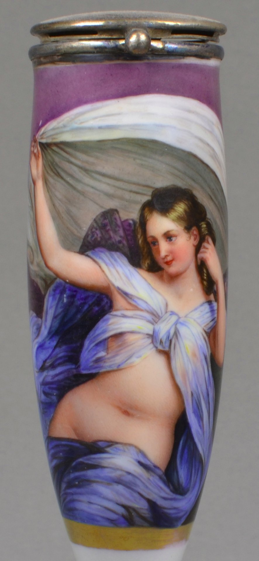 Pfeifenstummel aus Porzellan, ovaler Korpus, sich nach oben erweiternd (Morgenroth Nr. 45), auf der Wandung ¾ den gesamten Korpus umspannendes, golden gerahmtes Bildfeld; in bunten Muffelfarben Darstellung einer nackten jungen Frau, ein Seidentuch über dem Kopf schwingend und mit einem Seidentuch Brust und Scham bedeckend. Montierung: Silber mit gravierter Initiale im Deckel „von J v S“; H.: 14,0cm