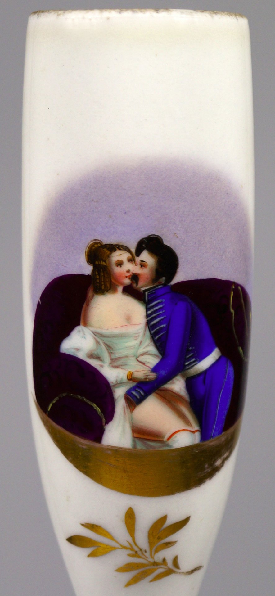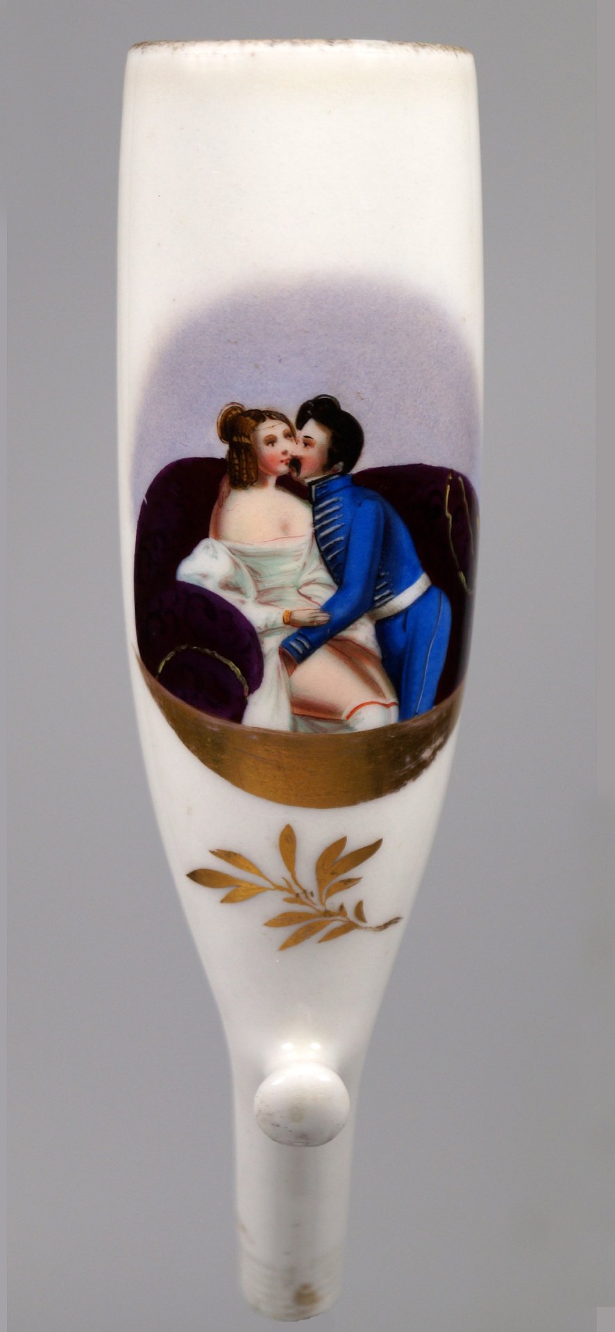 Pfeifenstummel aus Porzellan, Berliner Form, auf der Schauseite in ovalem Bildfeld mit bunten Muffelfarben die Darstellung einer jungen Frau auf einem Sofa sitzend, der sich ein Soldat mit den Händen unter den Rock greifend nähert; blauer Querstrich am Stielende; Stummelferse Presszahl 8, H.: 13,0cm. (a=130; b=101; c=34,5 mm)