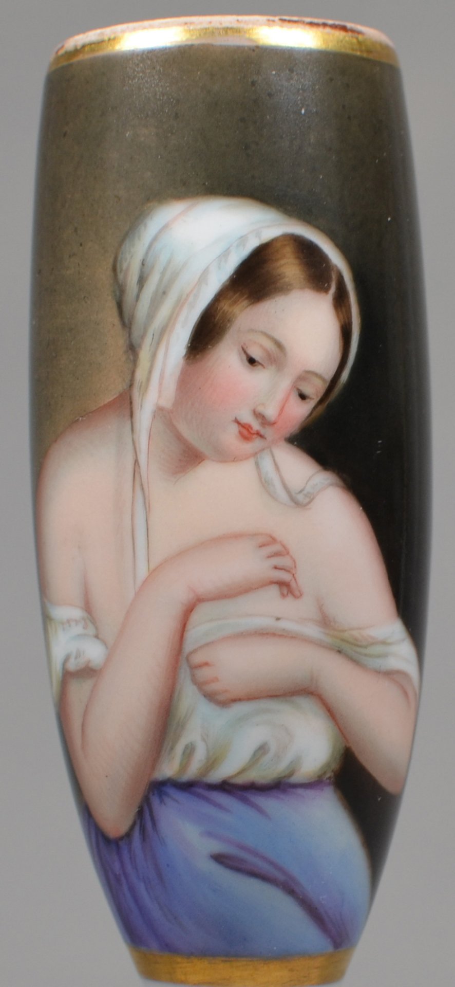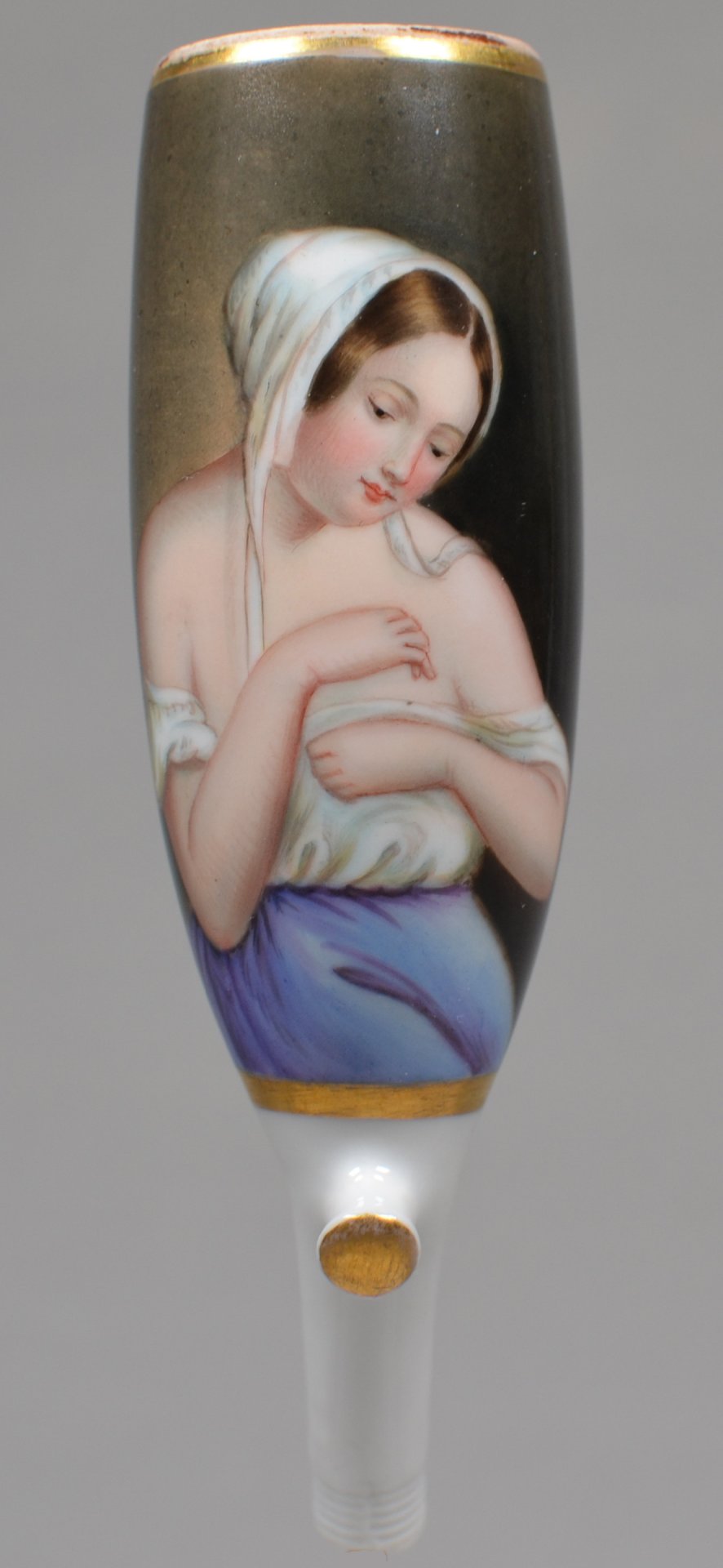 Pfeifenstummel aus Porzellan, Berliner Form, auf der Wandung 3/4 den gesamten Korpus umspannendes, golden gerahmtes Bildfeld; in bunten Muffelfarben die Darstellung eines jungen Mädchens mit Nachthaube, unbedeckten Schultern und ihr Unterkleid vor dem Busen festhaltend, am Stiel vorne im unteren Abschnitt Presszahl 7; H.: 12,2 cm (a=122; b=96; c=36 mm)
