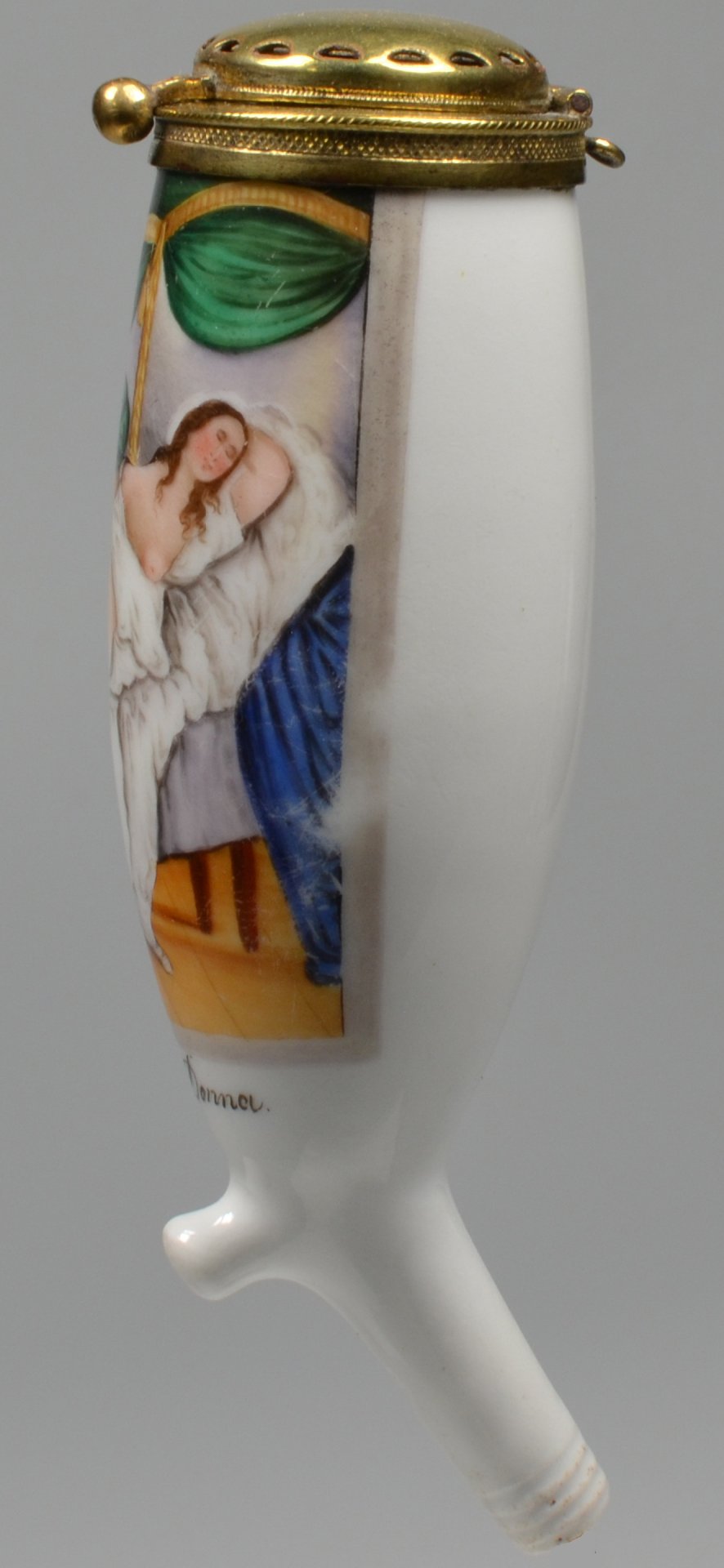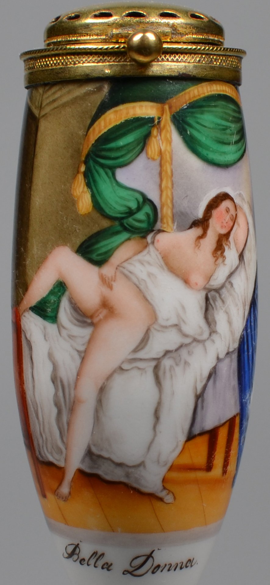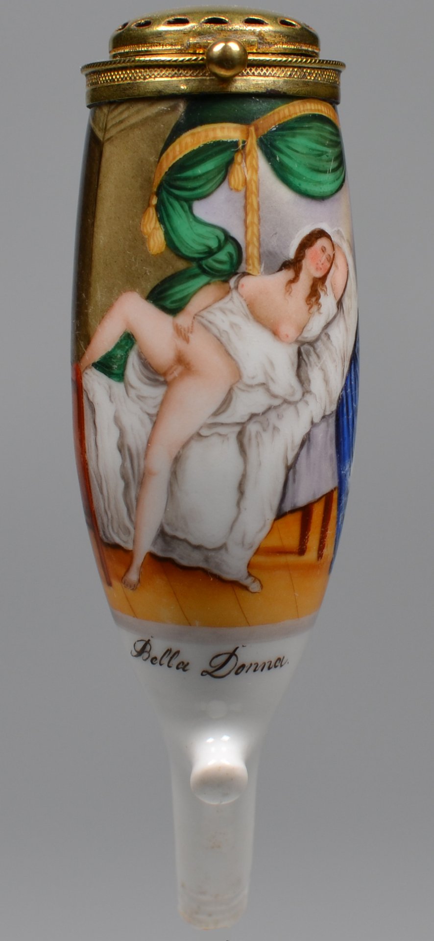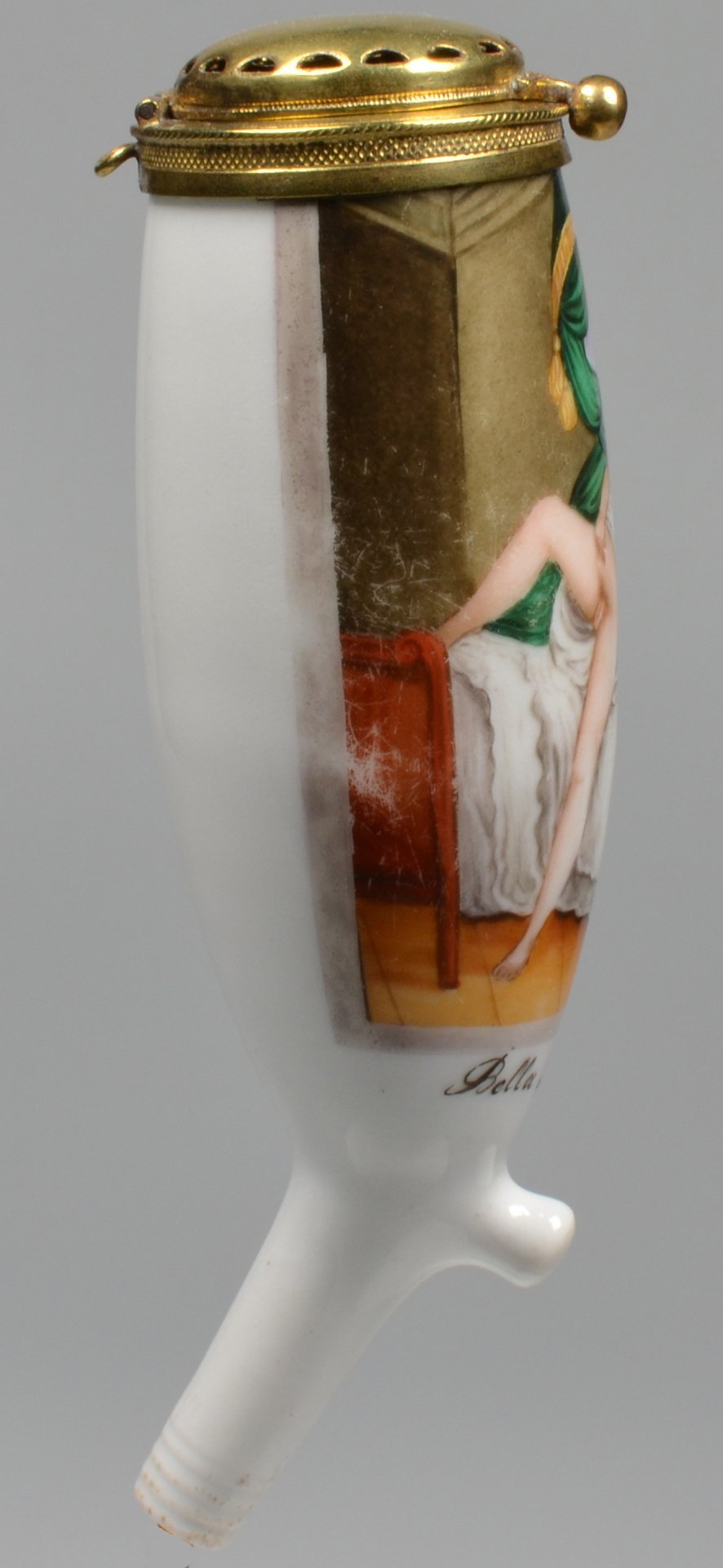 Pfeifenstummel aus Porzellan, Berliner Form; auf der Wandung zur Hälfte den Korpus umspannendes, golden gerahmtes Bildfeld; in bunten Muffelfarben die Darstellung einer Frau im Bett, ihren Busen und ihre Scham unbekleidet zeigend; unter dem Bildfeld in schwarzer Schreibschrift „Bella Donna“; Ferse mit Pressmarke 7; Montierung: Messing. H.: 11,3 cm (a=107; b=84; c=34 mm)
