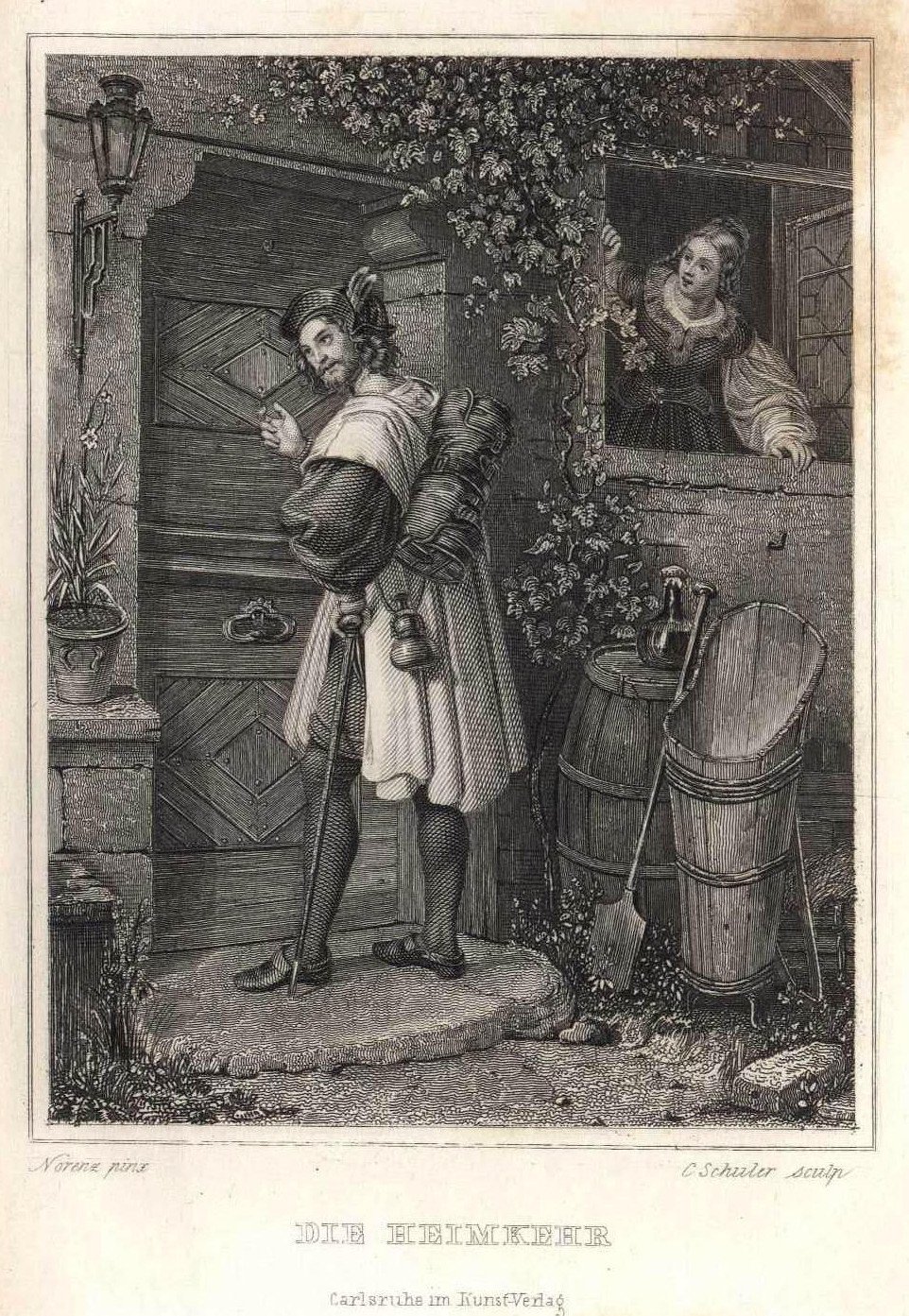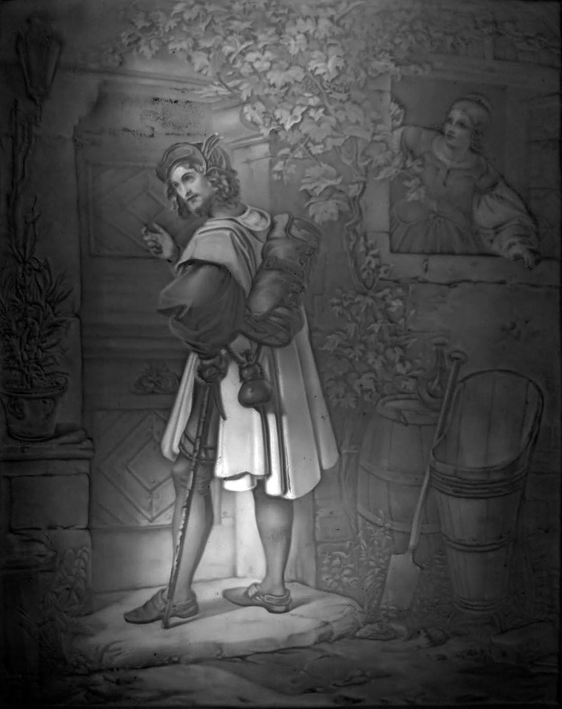 Lithophanie, Modell 115, im Preis-Courant bezeichnet: „Die Heimkehr, groß“; Vorlage ist das Gemälde 1832 „Des Burschen Heimkehr“ von Wilhelm Nerenz (1804-1871); 30,9 x 20,4 cm,