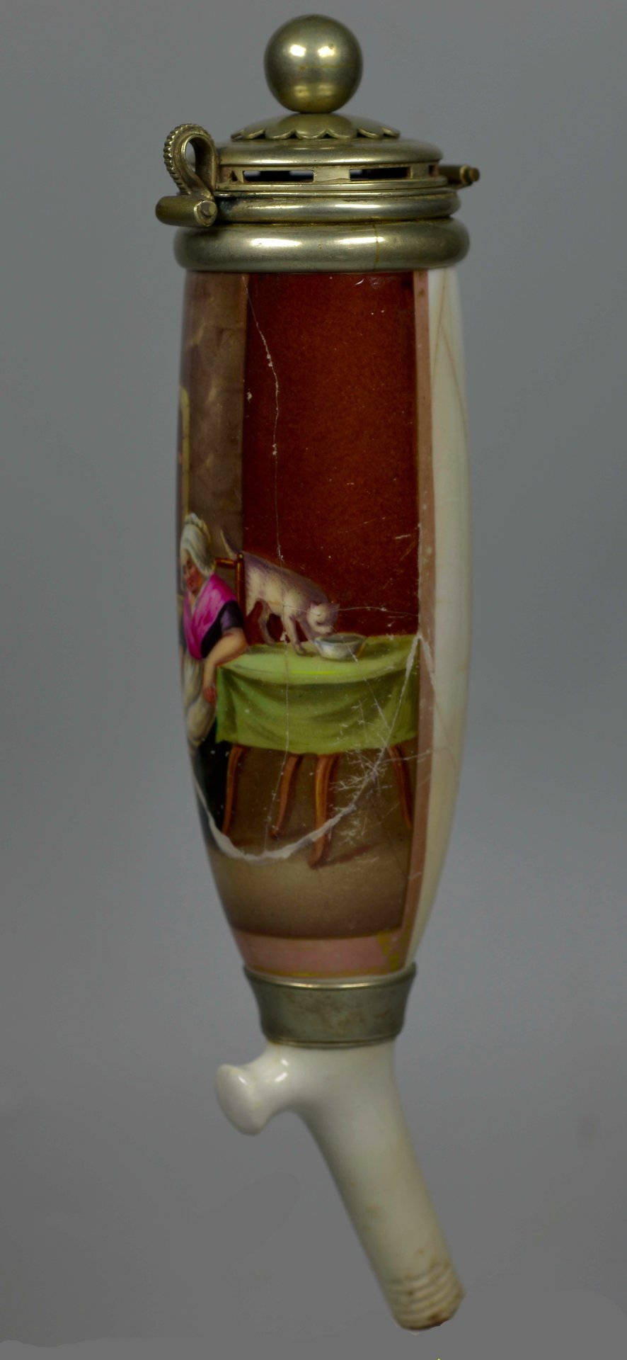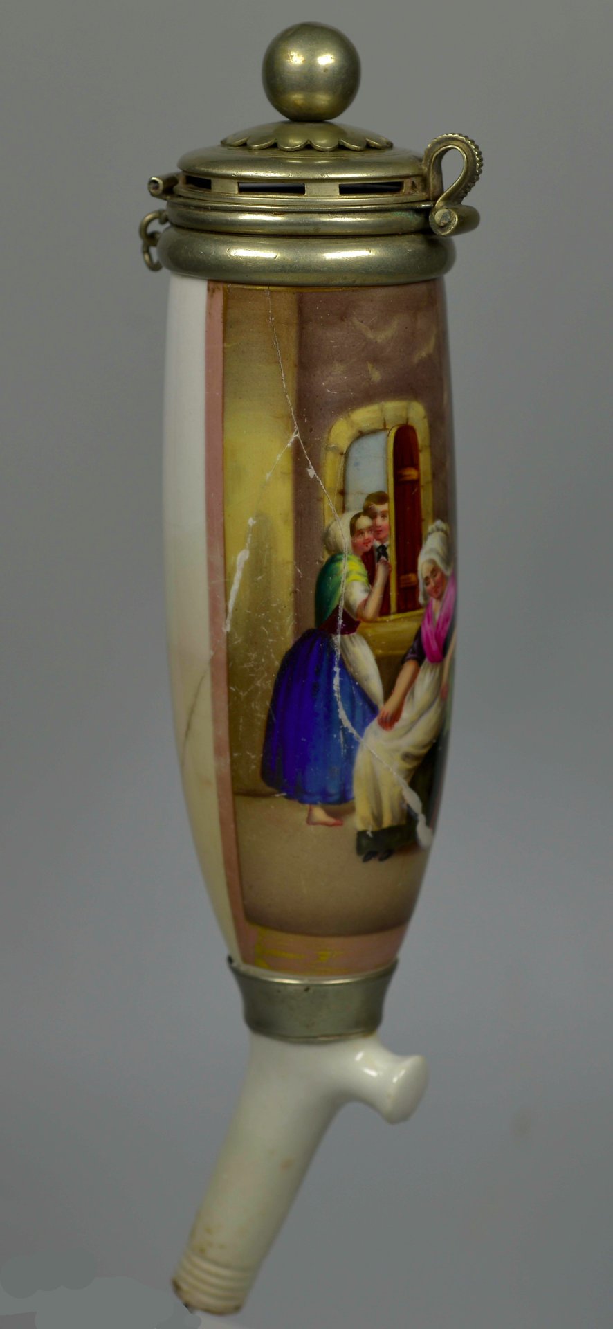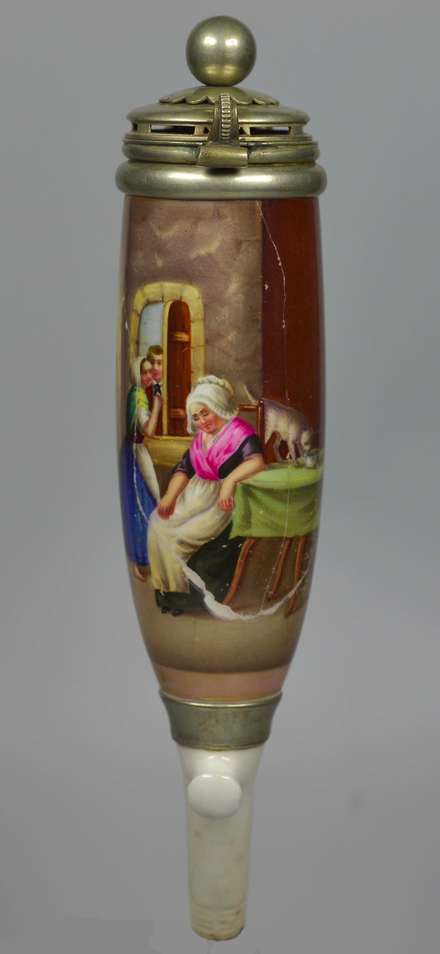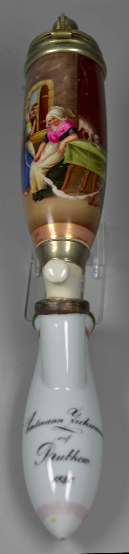 Sehr großer Pfeifenkopf aus Porzellan, Berliner Form, komplettiert mit einem für die Zeit und die Größe passenden Abzug aus Porzellan. Auf der Schauseite eine zu 2/3 den Korpus umfassende, stark beriebene rechteckige Goldleiste, darin mit bunten Muffelfarben die Darstellung eines durch das Fenster sich eng aneinander schmiegenden Liebespaares; im Zentrum eine ältere Frau sitzend, die das Mädchen an der Schürze festhält; rechts auf dem Tisch schleckt eine Katze aus einer Schale. Der Korpus ist mehrfach gebrochen, der wohl abgebrochene Stiel wurde oberhalb der Ferse mit einer Manschette repariert (die Technik taucht hier erstmalig auf), im Kessel befindet sich am Boden eine Metallverbindung. Bei der Montur aus Neusilber handelt es sich vermutlich um eine Einzelanfertigung, indem das obere Kaufteil um einen unteren weiteren Ring ergänzt wurde. H = 20cm (a= 170, b=135, c=45,8mm)