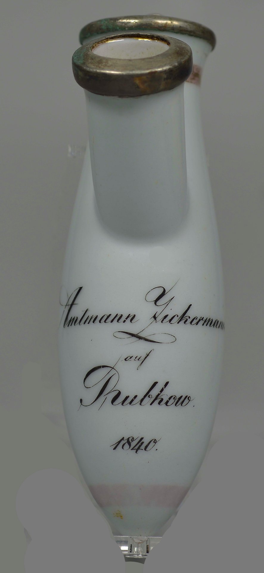 Ergänzt wurde ein Saftsack aus Porzellan mit Spitze am unteren Ende, vergl. Formen 5, 6, 10 oder 12 der Musterzeichnungen von „Tabacks Abzügen“ der Manufaktur Berlin um 1822“ vergl. Morgenroth, Tabakspfeifen sammeln /56, Seite 44/; verstärkt an den Tüllen mit Metallmonturen; auf der Vordeseite mit schwarzer Handschrift: „Amtmann Zickermann auf Rutkow 1840“. H=12,4cm