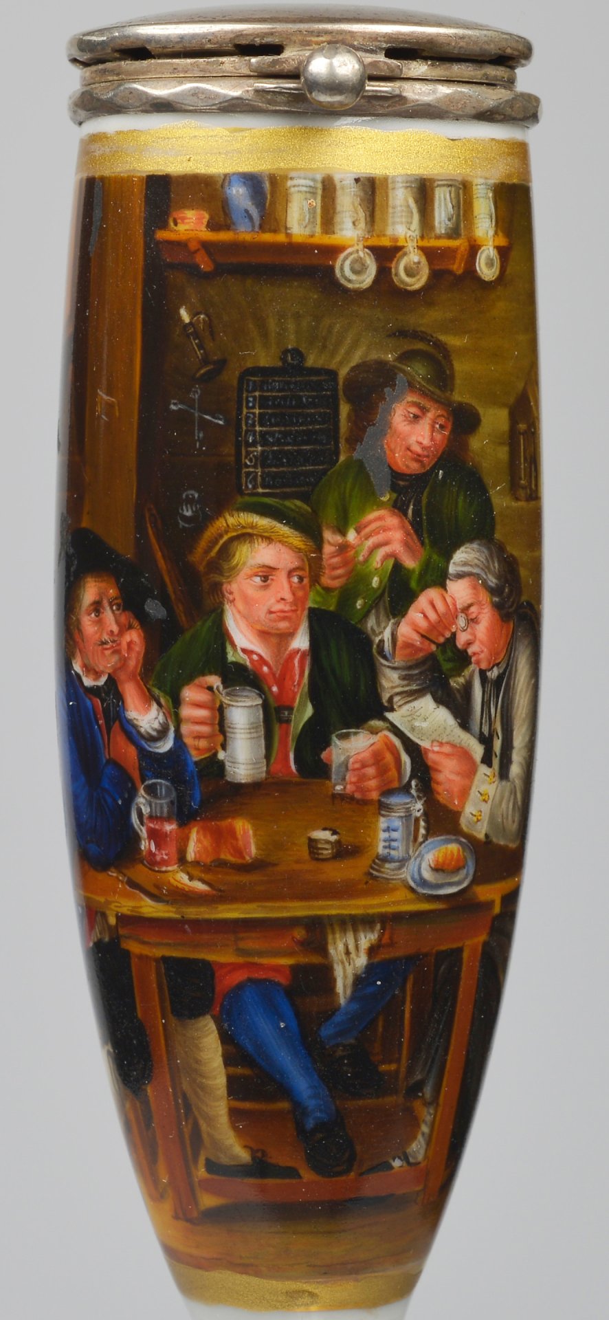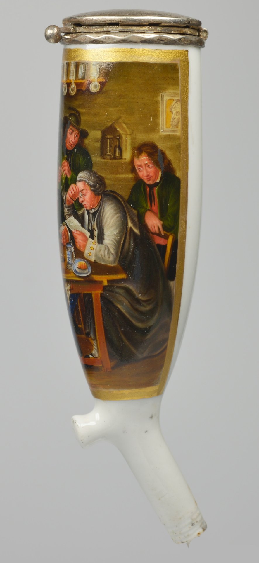 Pfeifenkopf, Berliner Form, den Korpus zu 2/3 umfassendes, Gold gerahmtes Bildfeld, darin mit bunten Muffelfarben die Darstellung einer Vereinsitzung. In einem Raum, vermutlich einem Vereinslokal, mit einer Reihe von Ausstellungsobjekten an der Wand, sitzen 4 Personen an einem Tisch und eine 5. Person steht in der Mitte. Sie lauschen alle dem Vorleser, der rechts von einem Blatt abliest - feine mit vielen Details versehene biedermeierliche Darstellung. Pfeifenstummel Pressmarke 9; am Boden unterglasurblauer Querstrich, Montur Silber, H=14cm (a=136; b=107; c=38,6 mm)