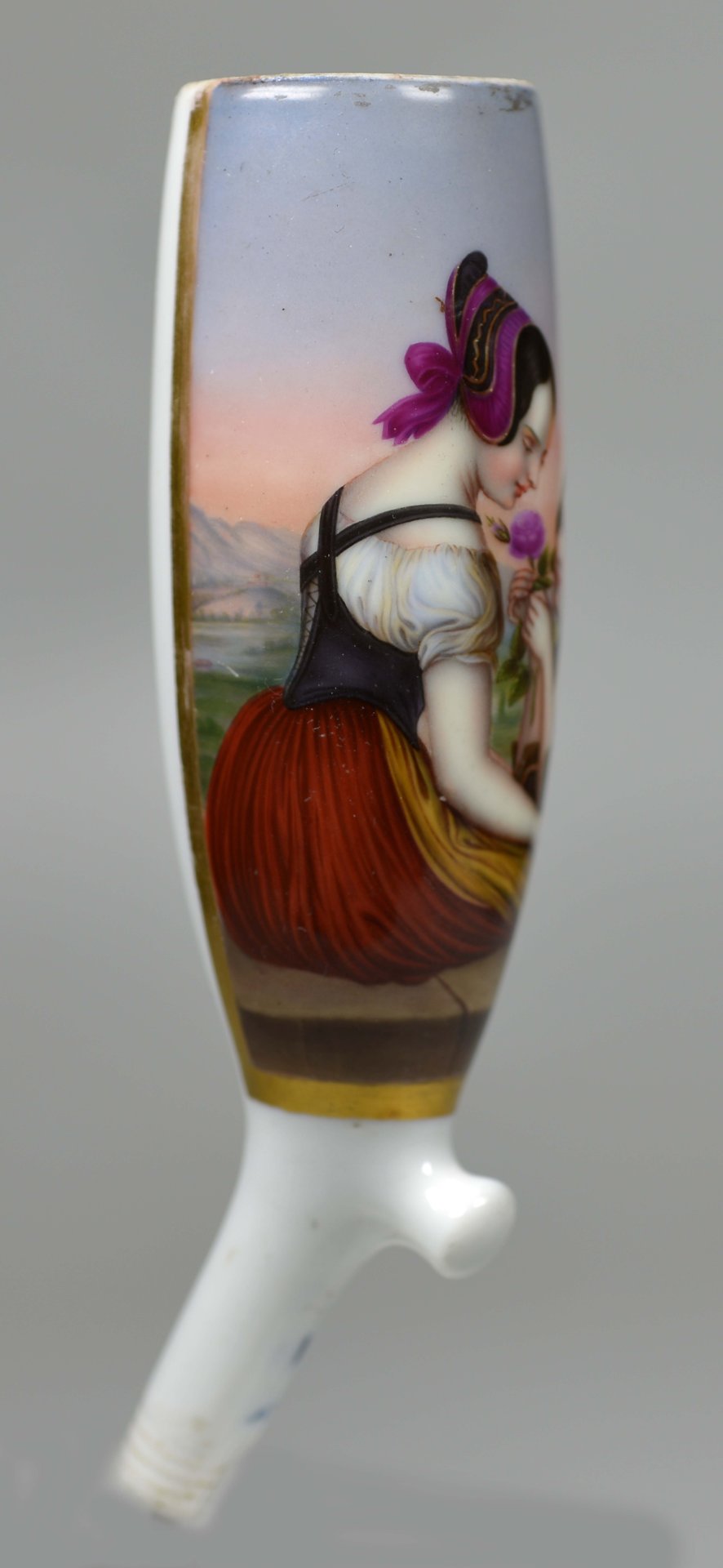 Pfeifenstummel aus Porzellan, Berliner Form, auf der Wandung ¾ den gesamten Korpus umspannendes, golden gerahmtes Bildfeld; mit bunten Muffelfarben die Darstellung zweier junger Mädchen hinter einer Mauer im Freien, die eine sitzend mit Kopfhaube und die andere vor ihr kniend, die erstere anschauend und eine Rose überreichend. Auf dem Stiel unterglasurblau Reste von PFS unter Strich, Ferse mit Presszahl wohl 9 (schlecht leserlich). H.: 13,6 cm (b=108; c=38,9mm)