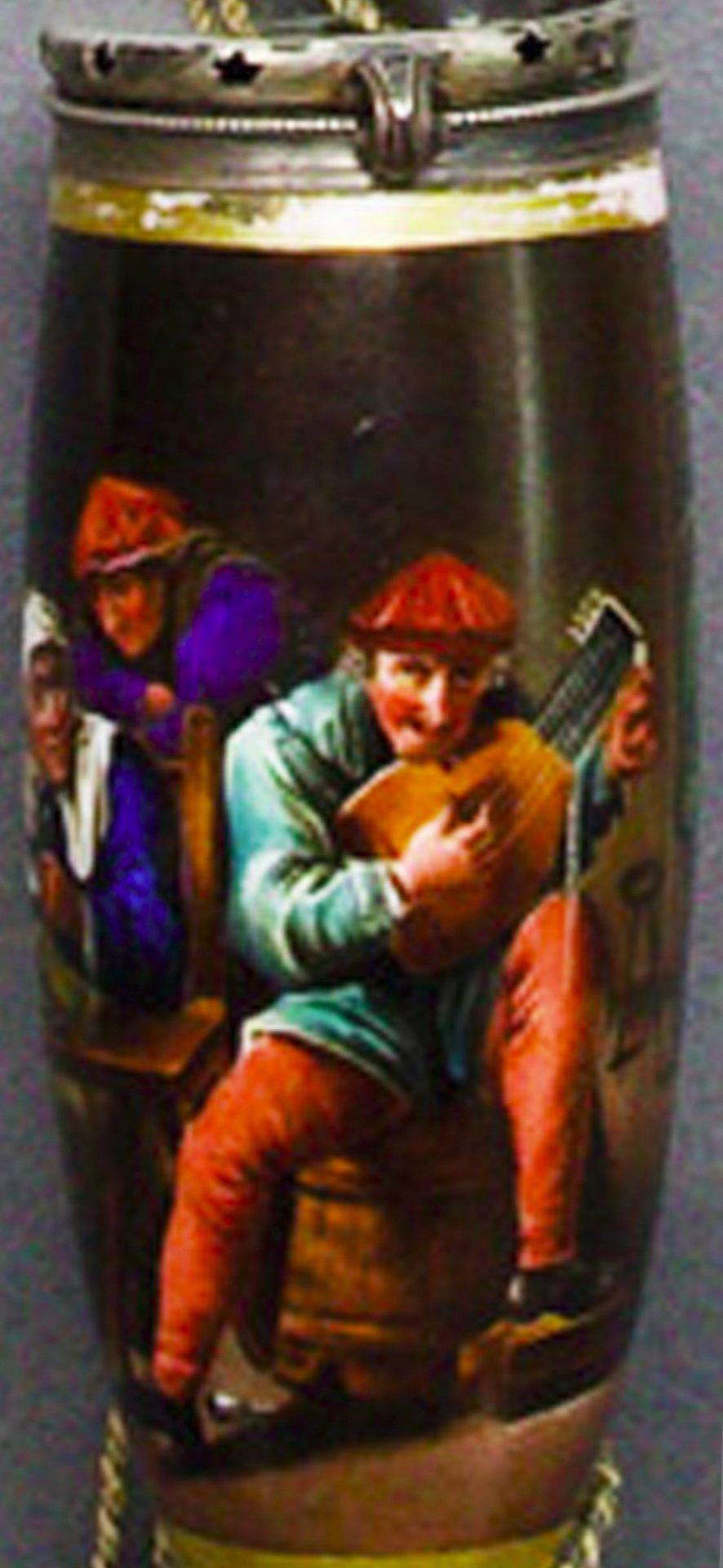 Pfeifenstummel aus Porzellan, „Berliner Form; in bunten Muffelfarben Darstellung einer Wirtshausszene nach David Teniers (1610-1690). Im Kessel unter Glasur die blaue Szeptermarke der Königlichen Porzellan-Manufaktur zu Berlin. Montierung: Silber oder Neusilber; im Rand des Deckels sternförmige Öffnungen zum Entweichen des Tabakrauches. H=13,0 cm“