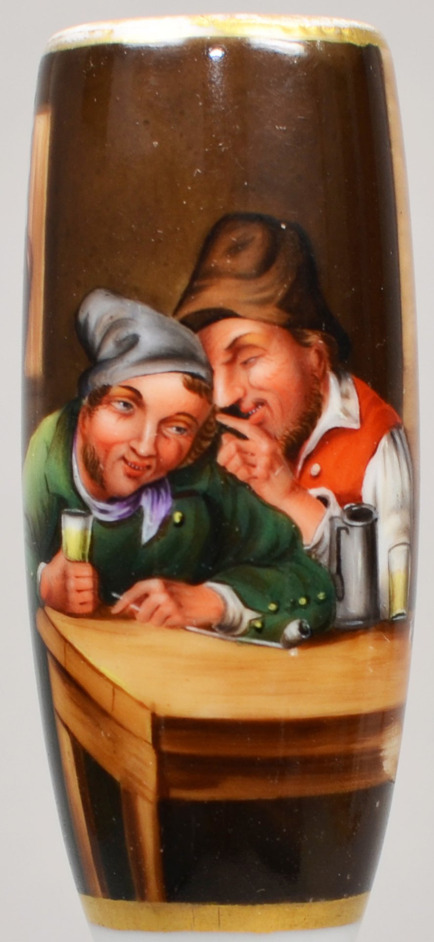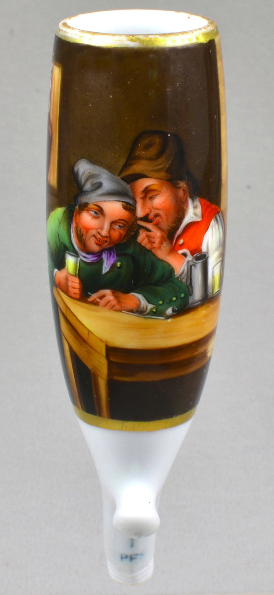 Pfeifenstummel aus Porzellan, Berliner Form, auf der Wandung 2/3 den Korpus umspannendes, golden gerahmtes Bildfeld; in bunten Muffelfarben die Darstellung zweier Zecher im vertraulichem Gespräch. Auf der Rückseite in schwarzer Schreibschrift: