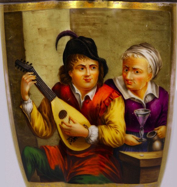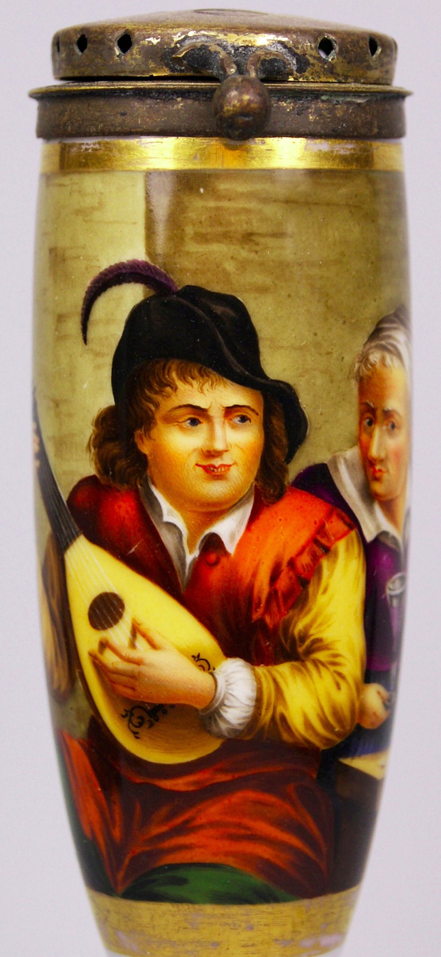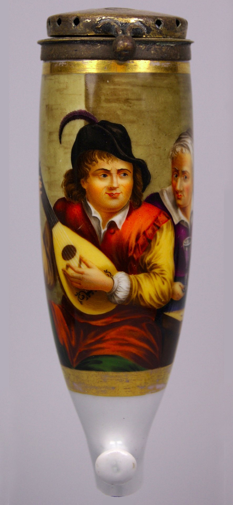 Pfeifenstummel aus Porzellan, Berliner Form; auf der Wandung drei Viertel den gesamten Korpus umspannendes, golden gerahmtes Bildfeld; in bunten Muffelfarben die Darstellung eines Lautenspielers, dem eine ältere Magd ein Glas Wein reicht; Vorlage ist ein Kupferstich, bezeichnet: „Le Musicien Flamand“. Stummelferse Pressmarke 8; Montierung Messing, lose; Pfeifenstielende fehlt. H=11,5 cm (b=97; c=36 mm)