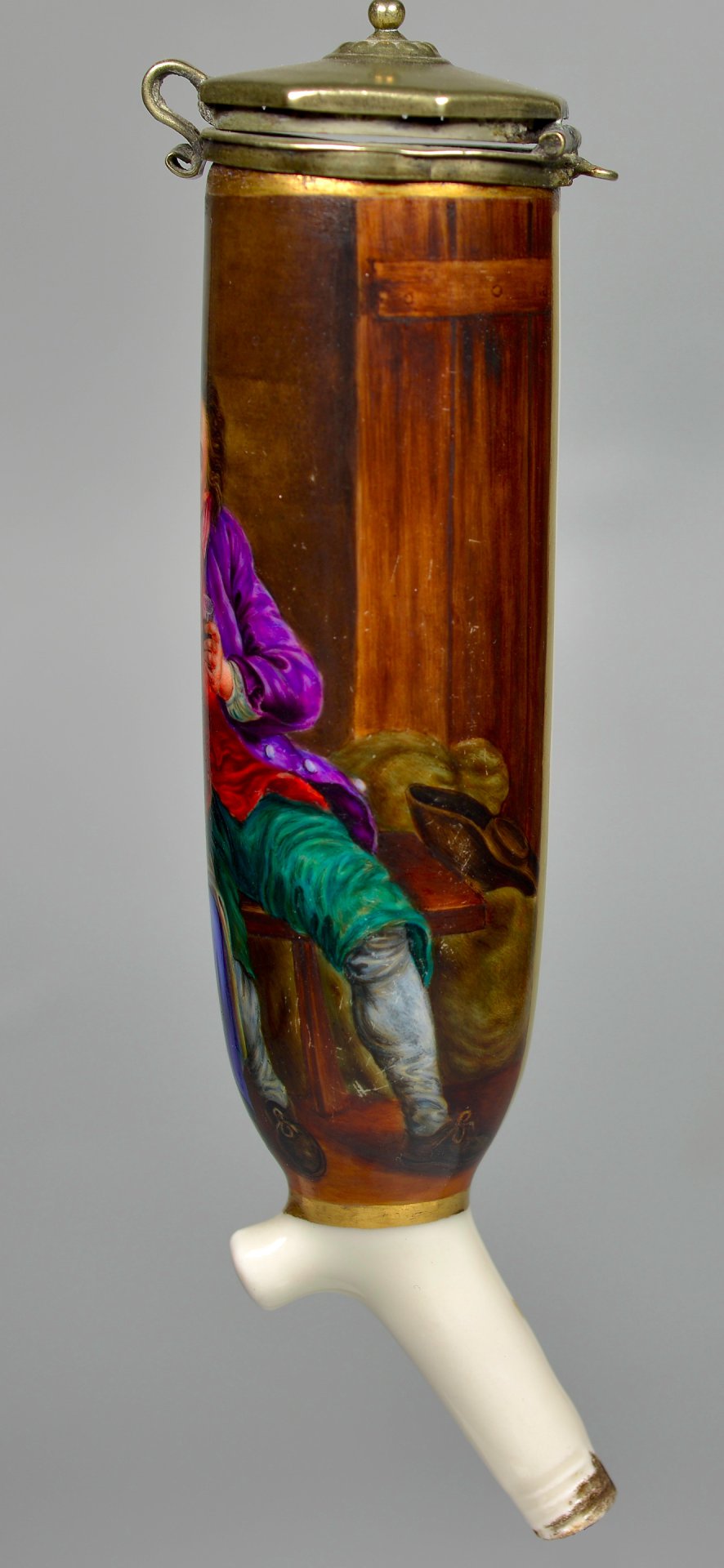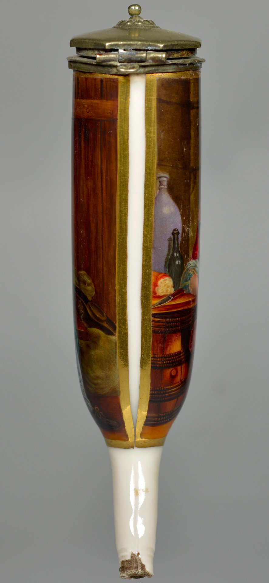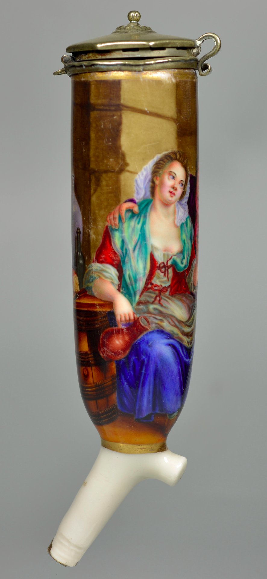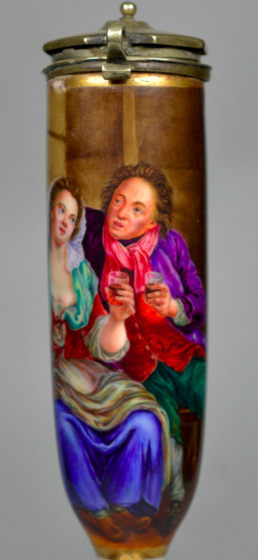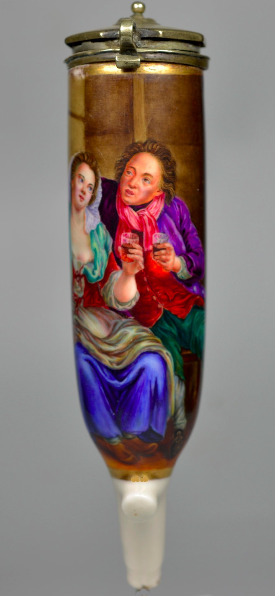 Pfeifenstummel aus Porzellan, zylindrischer Korpus, auf der Wandung den gesamten Korpus umspannendes, golden gerahmtes Bildfeld; in bunten Muffelfarben Darstellung eines Wein trinkenden, sich zuprostenden Paares. Die rechte Hand des Mannes liegt vertraulich auf der Schulter der jungen Frau.Montierung Neusilber; der Deckel achteckig geformt, in der Mitte ein Knopf, eingefasst durch einen getriebenen Perlenkranz. H=14,8cm (a=134; b=107,3; c=33,7mm)