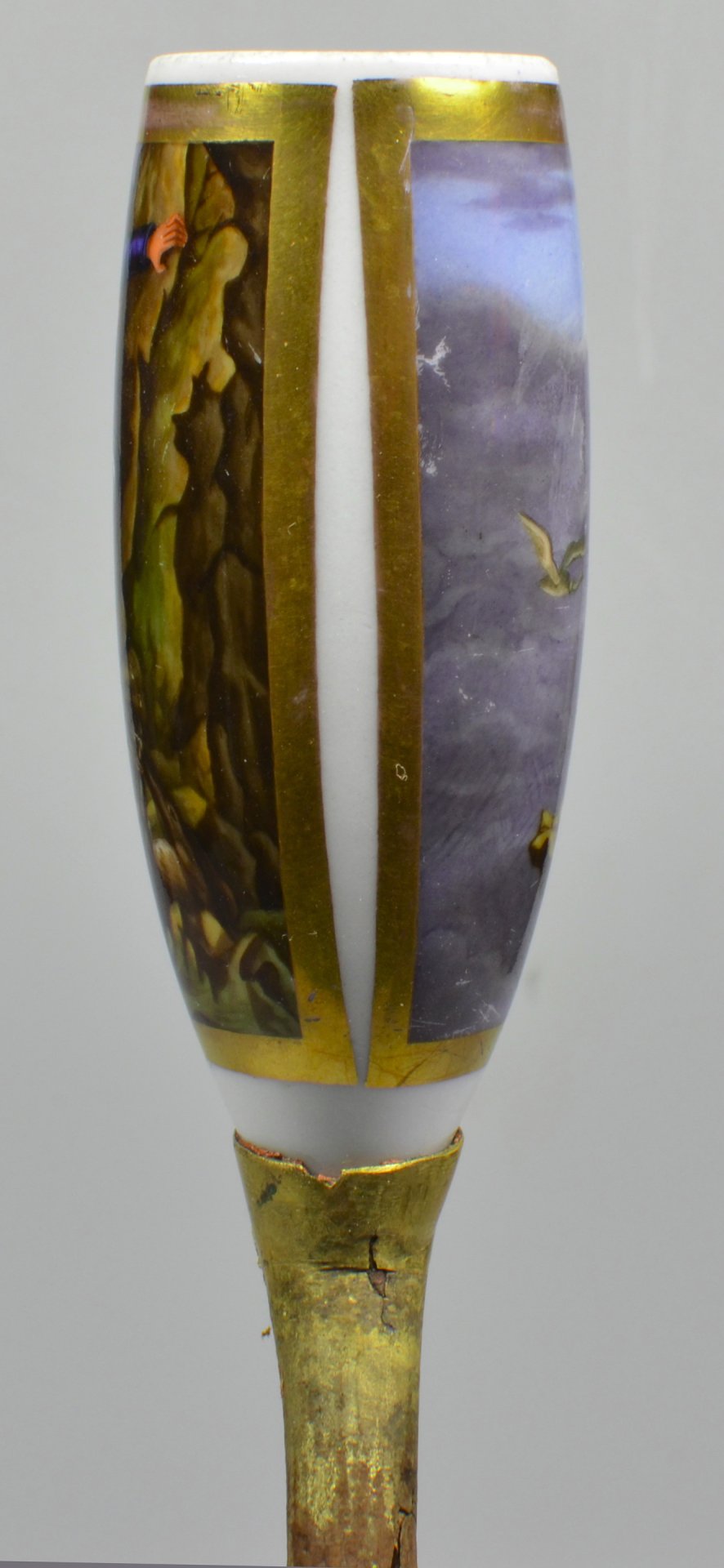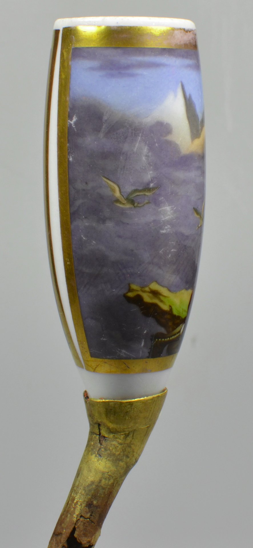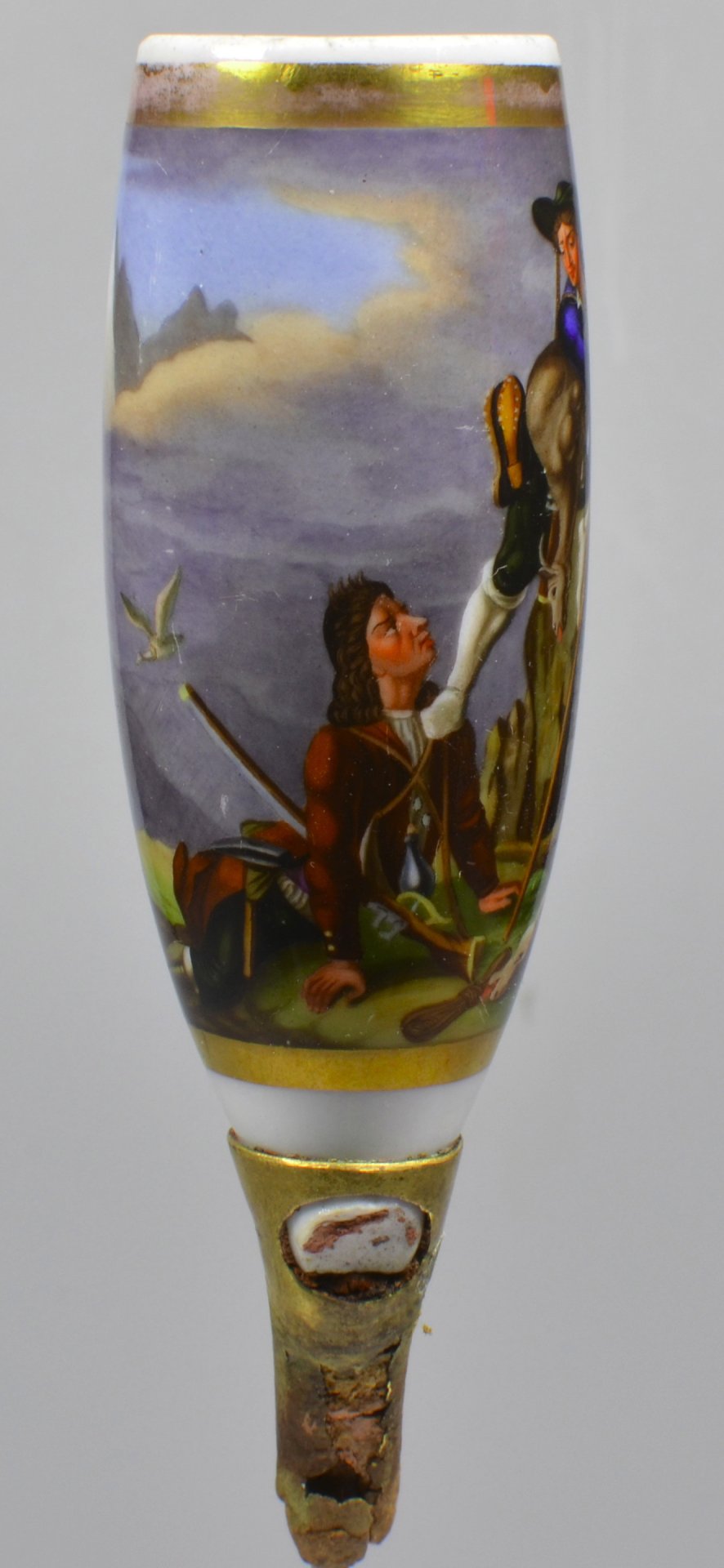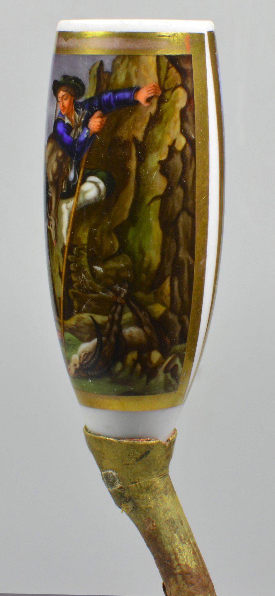 Pfeifenstummel aus Porzellan, Berliner Form, auf dem Korpus eine beinahe vollständig umfassende mit Goldleiste umrandete Rechteckkartusche, darin mit bunten Muffelfarben in feiner Lupenmalerei die Darstellung zweier Wilderer am Berghang. Während eine Person liegend, bewaffnet mit Gewehr und Hammer, seine Schulter als Fußstütze für einen zweiten über ihm befindlichen Jäger hinhält, stützt sich dieser mit einer toten Bergziege auf dem Rücken zusätzlich mit einem langen Stab ab. Auf dem Boden liegt eine für den Abtransport mit den Füßen zusammengebundene weitere Ziege; der Stiel ist abgebrochen und wurde sehr unprofessionell durch eine Messingtülle ersetzt, ebenfalls ist die Ferse abgebrochen und rötliche Reste einer Klebmasse sind anhaftend. H.: 12,1 (b=ca. 90; c=36,1 mm)