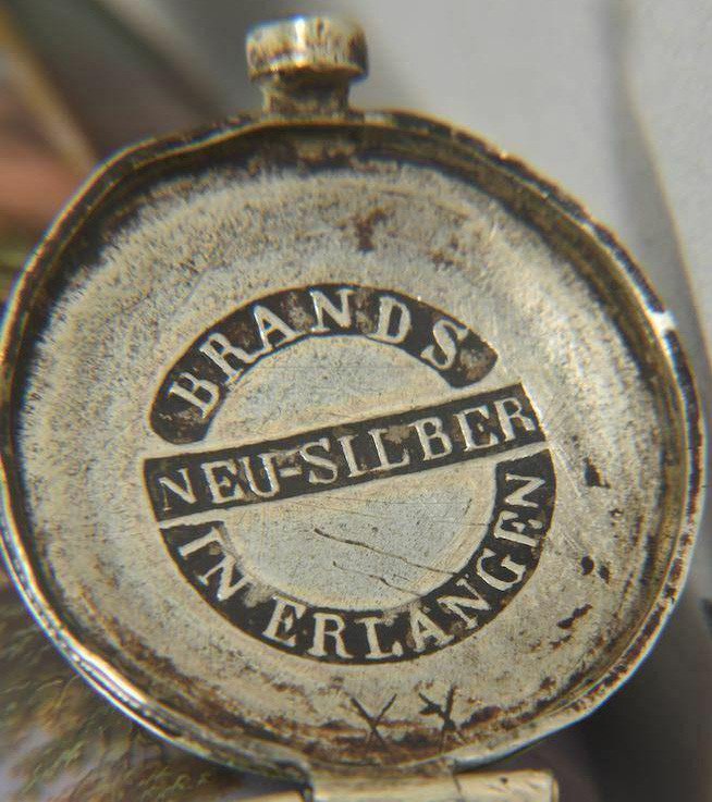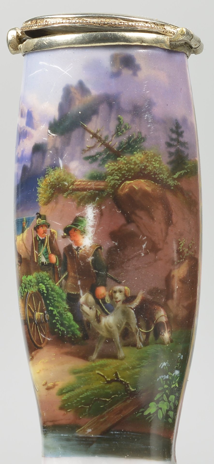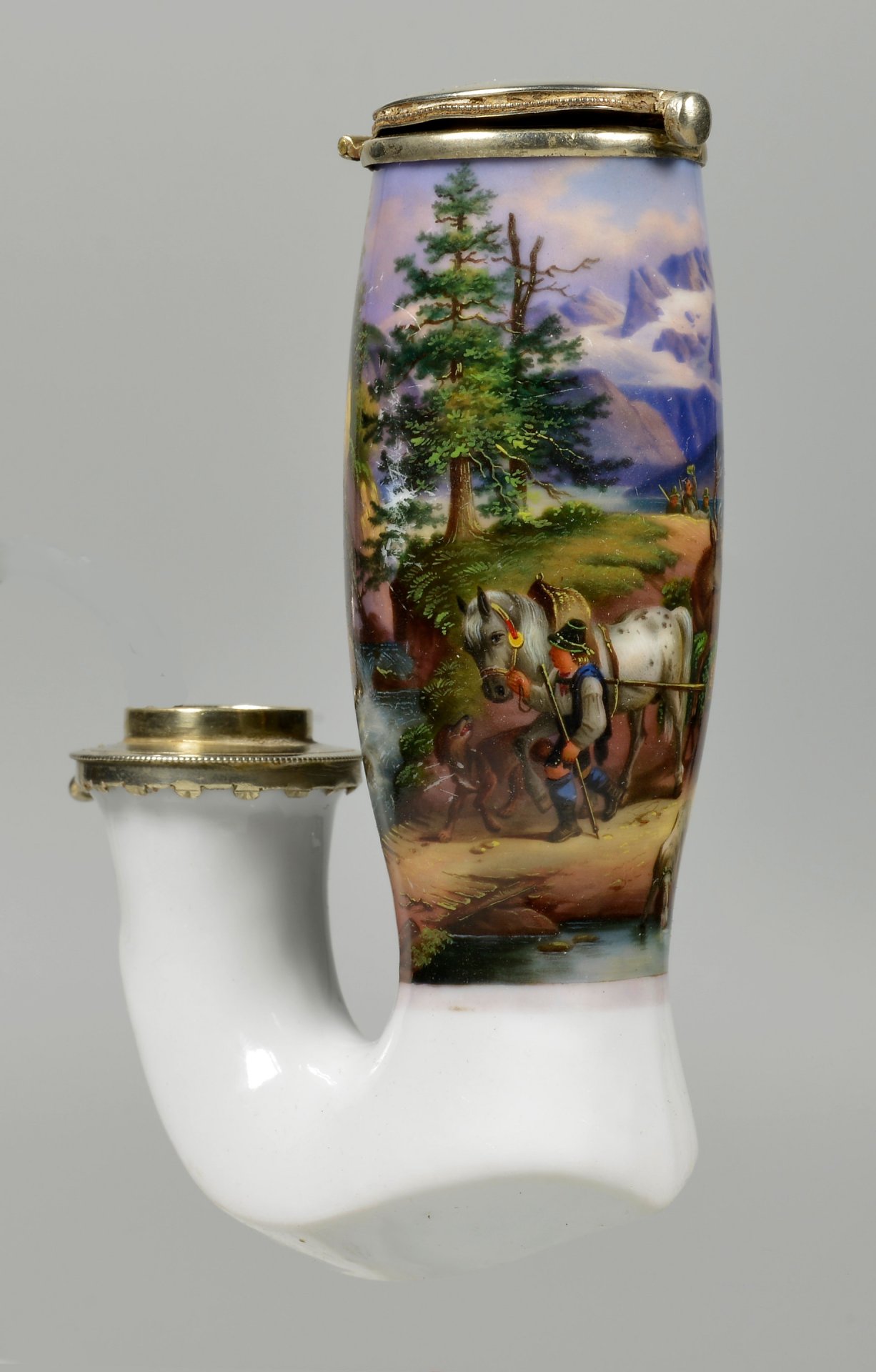 Pfeifenkopf aus Porzellan mit festem Abzug in geschwungener Grundform mit kielförmigen Pfeifenhals; auf dem Korpus vollständig umlaufend in feiner Lupenmalerei mit bunten Muffelfarben Darstellung einer idyllischem Hochgebirgslandschaft mit Hunden, einem Gebirgsbach, Jägern neben einem Hirsch stehend und einem Pferdegespann mit Bauer, der Grünfutter transportiert.; auf der Rückseite in schwarzer Farbe wohl alte Inventarnummer: „P3949; Montur: Neusilber von Brands in Erlangen;, H.: 11cm (a=105; b=48; c=34,4mm)