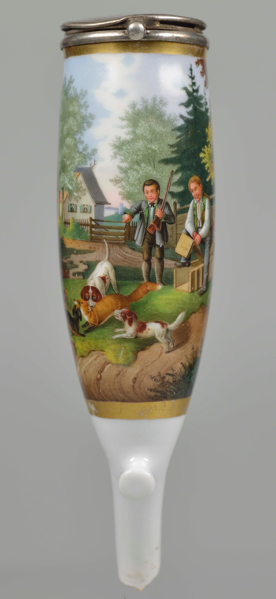 Pfeifenstummel aus Porzellan, ovaler Korpus, sich nach oben erweiternd (Morgenroth Nr. 45), auf der Wandung 3/4 den Korpus umspannendes, golden gerahmtes Bildfeld; darin in bunten Muffelfarben Darstellung einer Szene im Freien, in der aus einer Kiste ein Fuchs befreit wird und vier Hunde den Fuchs belagern. Drei Personen betrachten den Vorgang, wovon ein Zuschauer ein Gewehr trägt. Ohne Porzellanmarke und ohne Presszahl für die Größe, Stielende kurz abgebrochen, Montur: Silber; H. ohne Montur: 13,4cm; H. mit Montur: 14,0cm; D=3,8cm