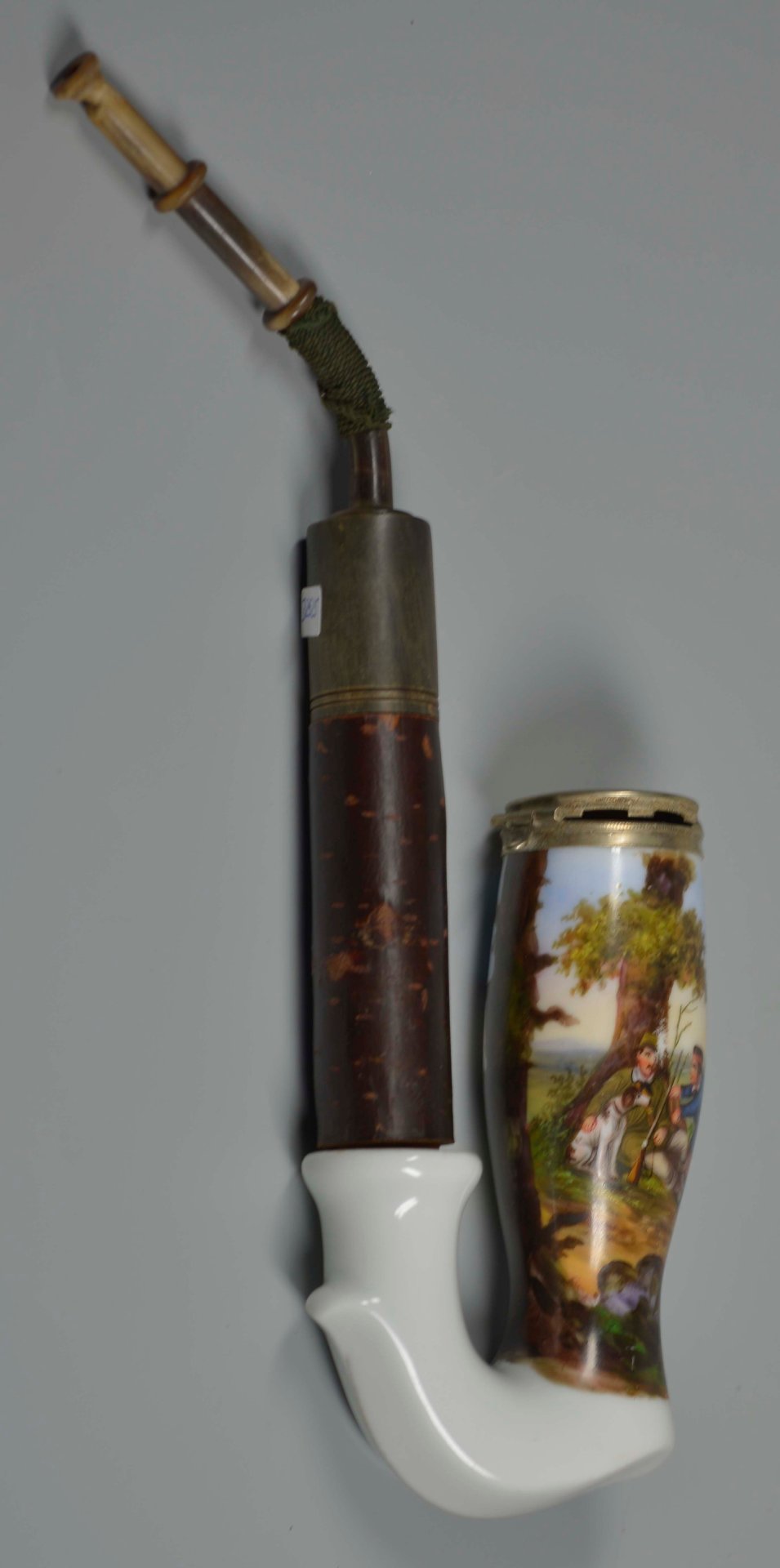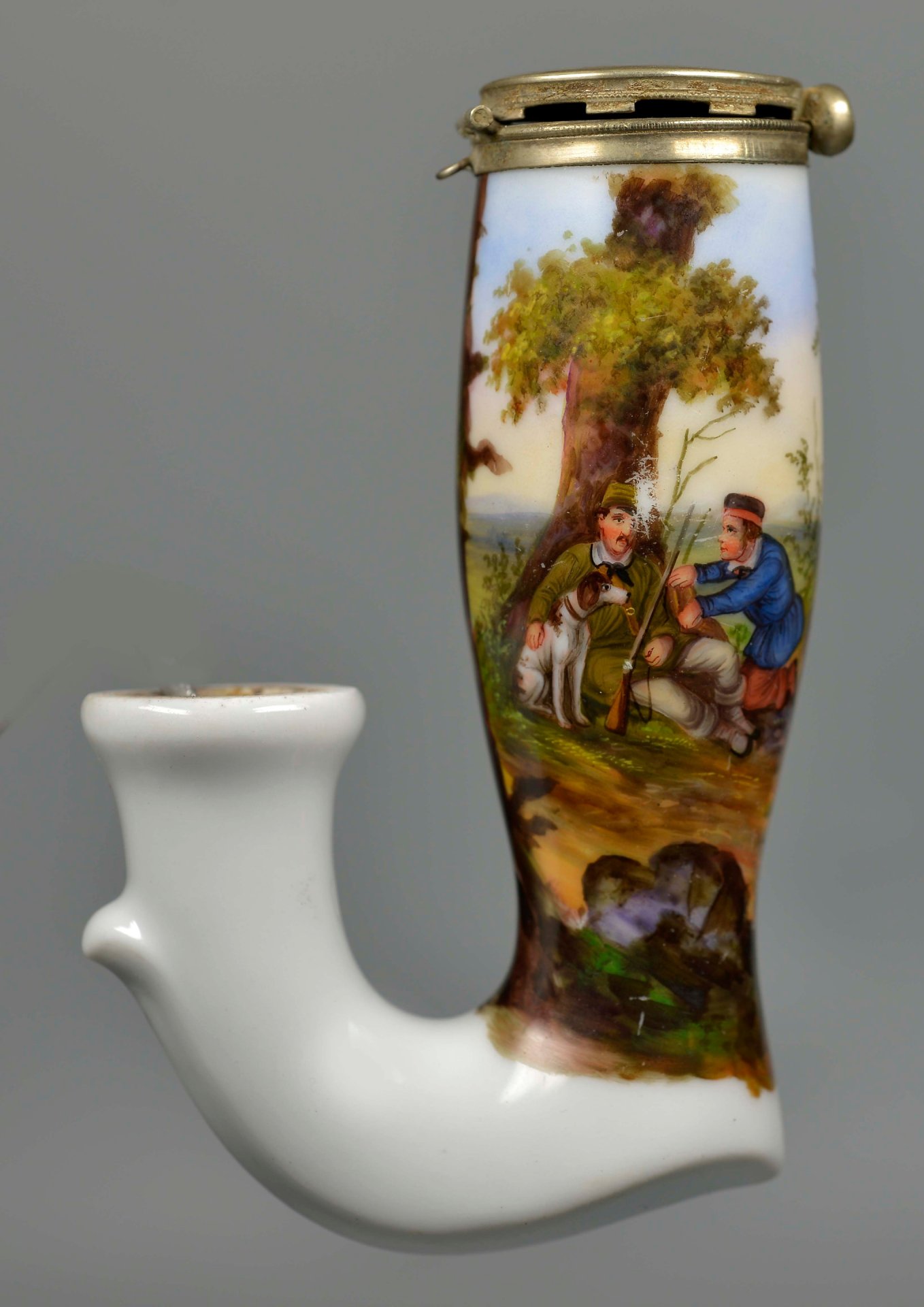 Pfeifenkopf aus Porzellan „mit festem Abzug“ (Preiss-Verzeichniss 1828) in geschwungener Grundform mit kielförmigen Pfeifenhals; auf dem Kessel vollständig umlaufend mit bunten Muffelfarben in feiner Lupenmalerei die zweiteilige Darstellung von Jägern auf einer bewaldeten Anhöhe mit Blick auf eine ebene Landschaft; ein Jäger sitzt mit seinem Hund und Gewehr angelehnt an einem Baum und unterhält sich mit einem knieend vor ihm sitzenden Besucher, während ein zweiter Jäger in die Ferne sieht, das Gewehr in den Händen hält und neben ihm ein Besucher die weite Landschaft beobachtet, auf der Gestecktülle Presszahl „2“; Montierung: Neusilber; mit dazu gehörendem Gesteck: Gh = 22,5cm; Porzellankopf H.: 12,1 (a=115; b=58,9; c=37,7mm)