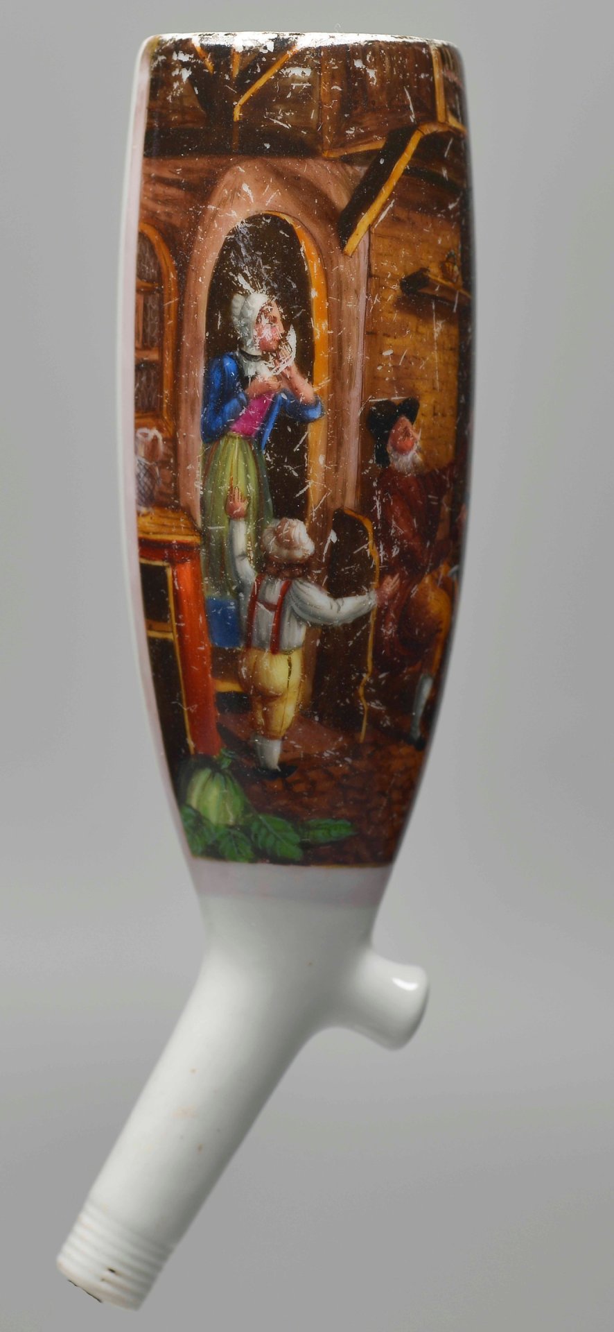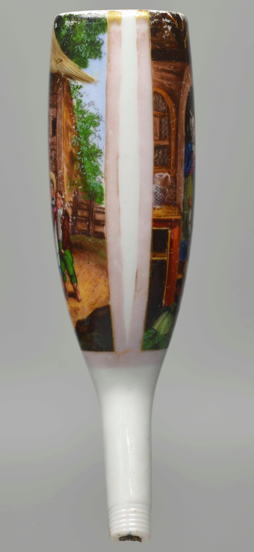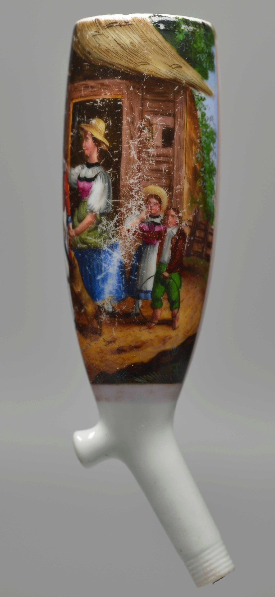 Pfeifenstummel aus Porzellan, Berliner Form; auf der Wandung beinahe vollständig umspannende stark beriebene goldgerahmte Kartusche, darin mit bunten Muffelfarben die Darstellung eines Husaren, der durch die Tür in´s Freie tritt und von der Familie zur Begrüßung umringt wird; Stielboden mit blauem Querstrich, :Ferse mit Presszahl 8; H=12,5cm (a=125,2; b=97; c=35,5mm)