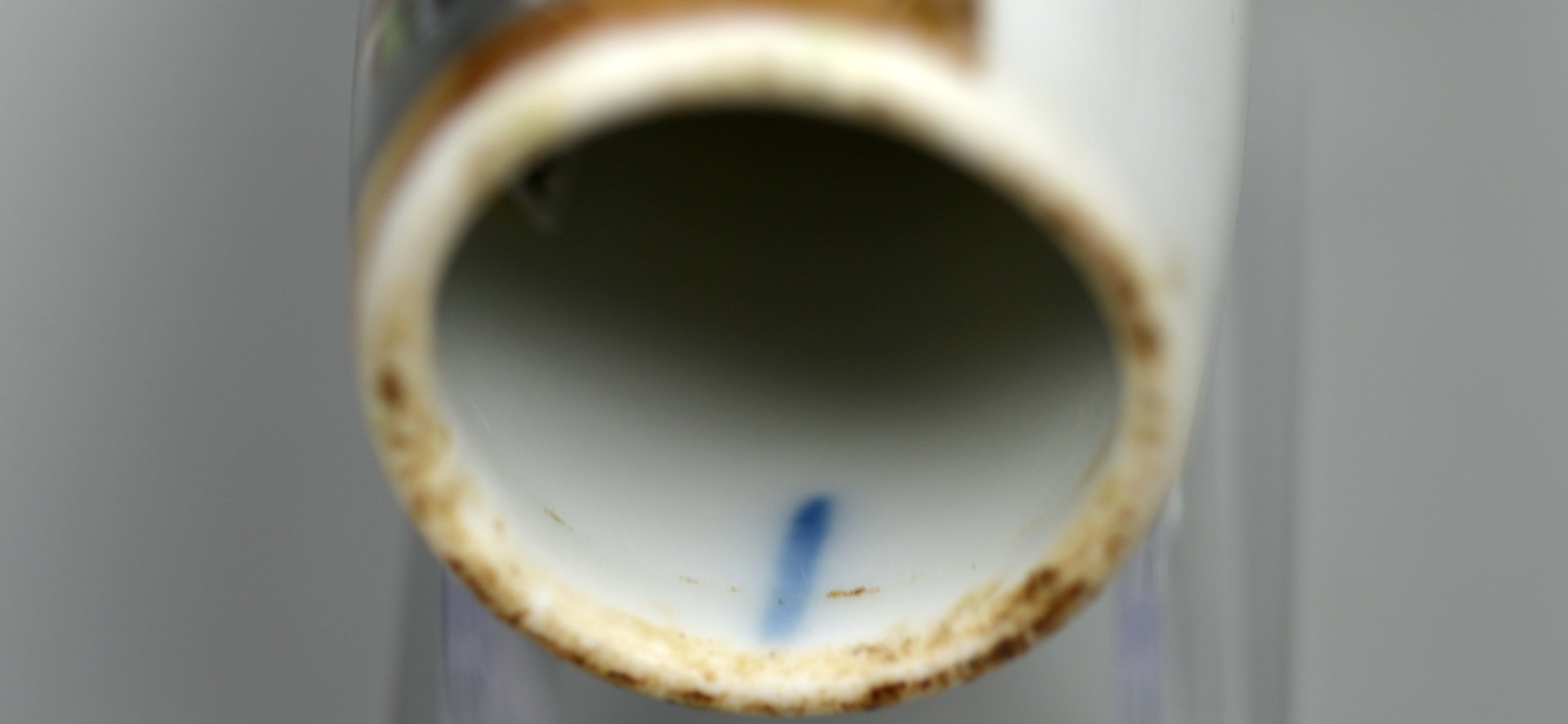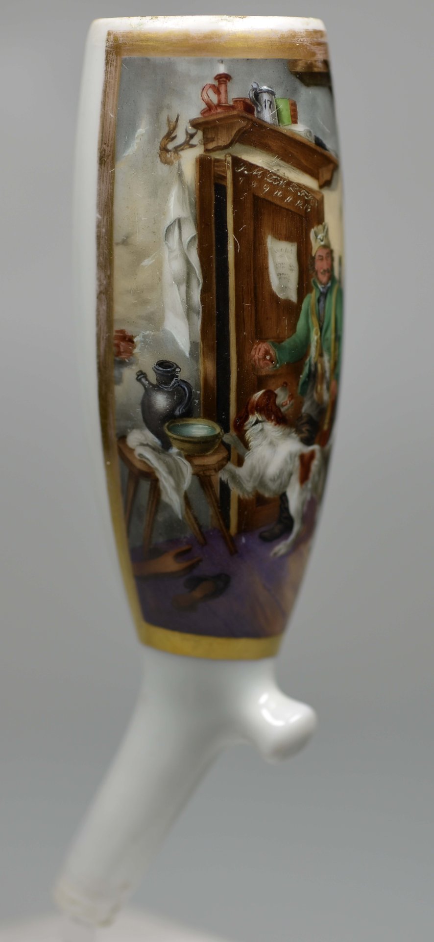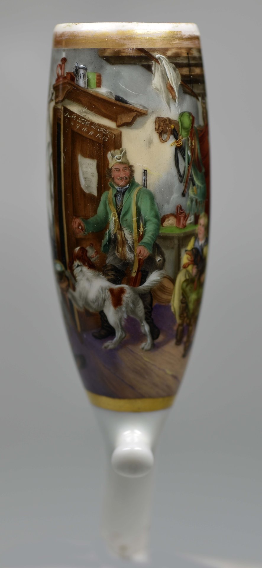 Pfeifenstummel aus Porzellan, Berliner Form, in einer ¾ den Korpus umfassenden in Gold gerahmten Rechteckkartusche mit bunten Muffelfarben die detaillierte Darstellung in feiner Lupenmalerei eines Zimmers mit einem Jäger und seinem Hund, der im Begriff ist, die Wohnungstür zu öffnen und sich nach seinem auf einem Stuhl mit Hündchen sitzend kleinen Sohn umdreht und sich verabschiedet; im Kessel senkrechter unterglasurblauer Strich; Ferse mit Presszahl 8; H= 12,3cm ( b=95,8; c=36,2 mm)